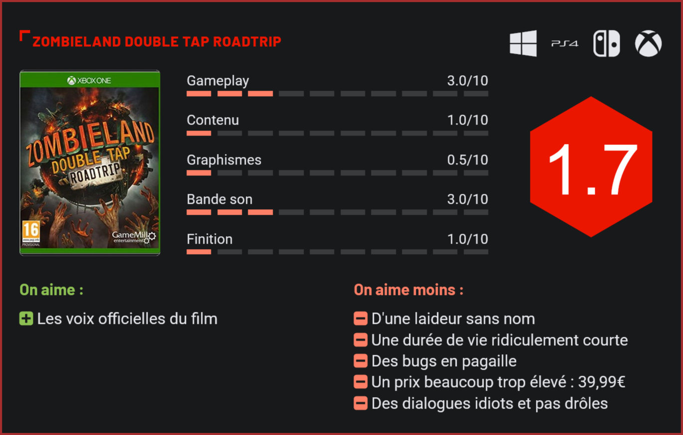 Annoncé quelques semaines seulement avant sa sortie, Zombieland Double Tap Roadtrip est une nouvelle adaptation laborieuse d’un blockbuster hollywoodien… Développé par High Moon Studios, qui avait pourtant à son actif plutôt un joli pédigrée, l’adaptation vidéoludique de Zombieland restera dans les annales comme l’un des plus gros fiascos de ces dernières années. Car si sur le papier, le titre avait tout pour séduire avec ses licences officielles, un gameplay basé sur les twin-stick shooters et de la coop’ à quatre joueurs, le résultat est malheureusement très loin de nos fantasmes les plus fous. Tout d’abord, parce que Zombieland Double Tap Roadtrip est probablement l’un des jeux les plus laids de cette génération – et peut-être même aussi de la précédente. Les modélisations sont sommaires, les assets réutilisés à tour de bras et le titre est rempli de bugs. C’est bien simple, on a l’impression de se retrouver en face d’un projet en pré-alpha débuté par une petite équipe d’étudiants. Visuellement, Zombieland est une véritable abomination. Si le titre avait été vendu à 5€, nous aurions sans doute pu fermer les yeux sur sa réalisation graphique, mais avec un prix de vente de 39,99€, on en vient à se demander ce qui a bien pu se passer pour que l’on en arrive là. Dès les premières minutes, le ton est donné. Zombieland Double Tap a l’apparence d’un petit projet indépendant au budget totalement fauché. Il ne faudra ainsi pas s’attendre à des cut-scenes ni même un soupçon de mise en scène dans l’aventure principale. Tout le budget du jeu semble être passé dans la licence et les voix officielles. Le mode de jeu principal se limite à 10 petites missions que l’on terminera en ligne droite en moins de 3 petites heures de jeu seulement. Après quoi, on essaiera peut-être quelques minutes le mode Horde peu inspiré, qui confrontera le joueur à des vagues successives d’ennemis. Côté gameplay, on se retrouve face à un twin-stick shooter bancal, sans aucune âme. On dirige l’un des quatre personnages du film – que l’on pourra personnaliser en améliorant certaines de ses capacités au cours de l’aventure. Le titre a bien sûr été pensé pour être joué de préférence à 4 en coop. Inutile de le préciser, l’aventure sera morose en solitaire. A deux, c’est un peu mieux, mais on s’ennuie tout de même terriblement face à des zombies idiots, généralement en relativement petit nombre, que vous n’aurez aucun mal à dézinguer à l’aide du vaste arsenal d’armes qui sera à votre disposition dans le niveau. L’ennui, c’est qu’on ne prend jamais son pied, ni durant les séquences de shoot mollassonnes, ni durant les combats au corps à corps. Le jeu se boucle en ligne droite en moins de 3h. Le désastre ne s’arrête pas là puisque Zombieland Double Tap Roadtrip est également un jeu terriblement buggué, des personnages incapables de se mouvoir à la suite d’un bug aux sauvegardes qui s’effacent, le jeu d’High Moon Studios est un festival d’absurdités – étonnamment vendu au prix plein. Il faudra en effet débourser 39,99€ (!) pour en faire l’acquisition. A ce prix, même les fans endurcis avaleront difficilement la pilule. Conclusion Véritable désastre, Zombieland Double Tap Roadtrip est l’une des pires adaptations de films en jeu vidéo. Le twin stick shooter d’High Moon Studios n’est pas seulement l’un des titres les plus laids de cette génération, mais aussi un véritable festival de bugs. Si l’idée d’affronter des hordes de zombies à 4 joueurs était très séduisante sur le papier, finir le jeu représentera un véritable défi. L’aventure n’est pourtant pas bien longue, mais le level design abominable du jeu, ses dialogues idiots, son gameplay mollasson et le manque total de sensations dans les gunfights rendront la progression laborieuse. Le plus aberrant dans tout cela reste encore le prix du jeu, facturé 39,99€. A ce prix, la pilule sera difficile à avaler…