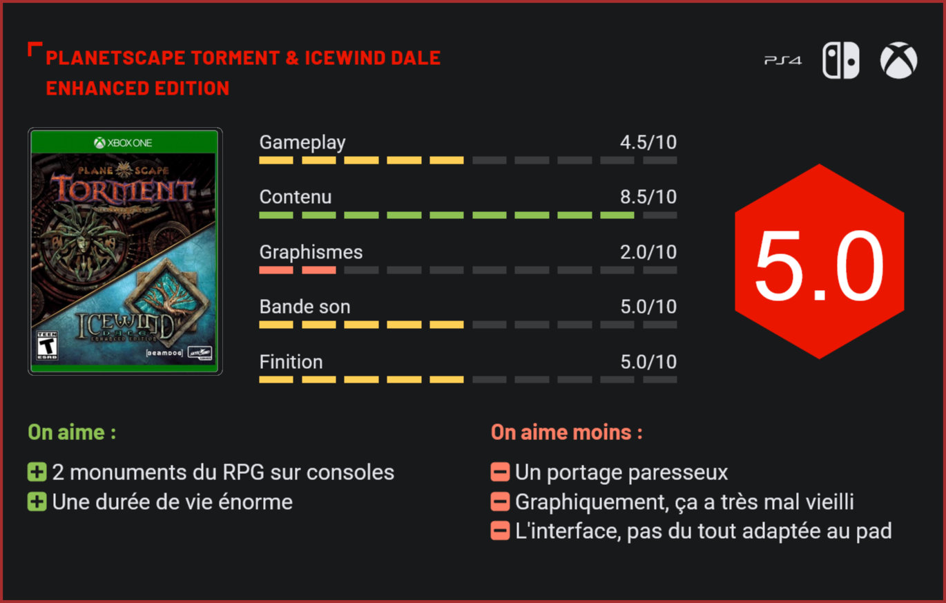 A côté de la compilation rassemblant les deux Baldur’s Gate, Beamdog nous ressort deux autres RPG cultes, les excellents Planetscape Torment et Icewind Dale. Si le portage des deux premiers Baldur’s Gate sur consoles aura permis à certains joueurs de faire une session de rattrapage en (re)découvrant ces deux monuments du RPG sur PlayStation 4, Xbox One et Switch, les doléances étaient nombreuses à l’encontre du studio chargé des portages. Lifting beaucoup trop léger, interface pas adaptée au pad et portage paresseux, la compilation s’est faite épingler par de nombreux médias spécialisés. Planetscape Torment & Icewind Dale Enhanced Edition suit malheureusement la même voie… Graphiquement, les deux jeux ont très mal vieilli… Moins connus que les Baldur’s Gate, Planetscape Torment et Icewind Dale offrent toutefois une expérience de jeu très similaire. Dans Icewind Dale, le joueur est envoyé dans la toundra désertique des Royaumes oubliés. Le jeu se caractérise surtout par ses environnements glacés qui contrastaient radicalement avec l’univers médiéval plus traditionnel des Baldur’s Gate. Planetscape Torment propose lui une approche sensiblement différente en nous emmenant dans un univers parallèle orienté dark-fantasy qui propose là aussi un univers atypique, aux antipodes de celui de Baldur’s Gate. Vous l’aurez compris, les deux jeux n’apportaient en soi rien de vraiment neuf par rapport aux précédents – mais davantage de diversité. Chaque joueur aura donc ses favoris. On regrettera toutefois qu’au vu du prix de cette compilation (50€), tous les titres ne soient pas rassemblés sous une seule et même compilation. D’autant plus que Beamdog n’a pratiquement fait aucun effort dans le portage de ces jeux. Les deux titres proposent des univers plus sombres & originaux que celui de Baldur’s Gate. On se retrouve donc face à des portages très fidèles au matériau d’origine, avec pratiquement aucune amélioration au niveau du contenu. Ce sont les mêmes jeux qu’on retrouvait sur PC il y a déjà 10 ans, avec les mêmes graphismes, la même bande sonore et les mêmes interfaces. Comme pour Baldur’s Gate, ce n’est pas mission impossible, mais il faudra tout de même un sacré temps d’adaptation pour se faire aux contrôles et surtout, c’est très loin du confort procuré par le combo clavier / souris. Alors faut-il ou non craquer pour cette compilation? D’un côté, on serait tenté de dire que ces deux monuments du RPG méritent de faire partie de votre collection personnelle. Les deux aventures méritent toujours autant le détour, notamment pour la qualité d’écriture des dialogues et leurs univers très riches, mais aux prix auxquels les compilations sont proposées, difficile de soutenir la démarche du studio. Côté gameplay, les deux jeux ont très mal vieilli. Le rythme du jeu est lent, les contrôle approximatifs et les mécanismes de jeu d’un autre temps. A choisir, préférez lui donc la version originale des jeux, toujours disponible sur PC, et proposée à un tarif beaucoup plus abordable… Conclusion Si ce portage aura le mérite de permettre à ceux qui étaient passés à côté de ces monuments du RPG de jouer les sessions de rattrapage sur consoles, le travail paresseux des développeurs ne joue pas vraiment en faveur de cette Enhanced Edition. Les deux titres n’ont subi aucun lifting graphique et ont très mal vieilli, l’interface n’a pas été repensée pour consoles, et la prise en main du jeu n’est pas du tout adaptée au support. Si l’on finit par s’y faire, on est loin du confort proposé par le combo clavier / souris. Au prix auquel il est proposé (près de 50€), on aurait clairement mérité mieux. Beamdog aurait d’ailleurs pu rassembler l’intégral de son travail sur une seule galette plutôt que de pousser les joueurs à passer à la caisse plusieurs fois…