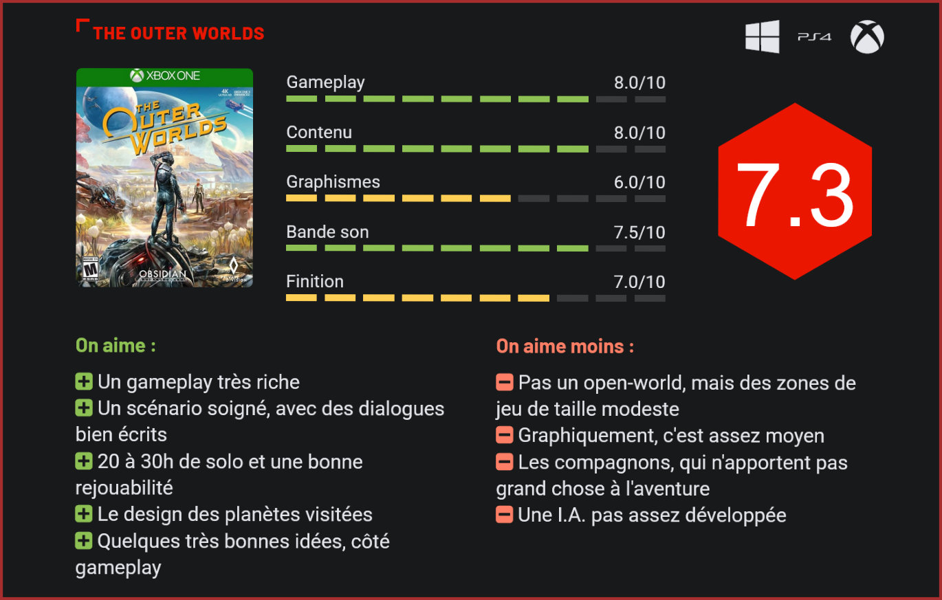 Nouveau projet du studio Obsidian, qui était notamment l’auteur du très bon Fallout : New Vegas, The Outer Worlds s’annonçait comme l’un des titres les plus prometteurs de cette fin d’année. Le shooter spatial du studio américain tient-il toutes ses promesses? Racheté il y a quelques mois par Microsoft, Obsidian livre son dernier projet comme studio indépendant avec The Outer Worlds – un jeu d’aventure spatial qui lorgne gentiment du côté de Fallout et s’annonçait comme l’un des gros jeux de cette fin d’année. Si le titre n’avait pas vraiment fait rêver les joueurs avec sa plastique à travers les différents trailers révélés, l’univers du jeu, les possibilités qu’il offre et surtout son gameplay s’annonçaient très séduisants. Et le résultat final est à la hauteur de nos attentes, malgré quelques petites faiblesses. Graphiquement, le résultat n’est pas brillant, mais The Outer Worlds a son charme… Comme tous les titres du studio, le scénario de The Outer Worlds et son background sont particulièrement soignés. Les développeurs ont choisi de développer une réalité alternative dans laquelle les corporations ont pris le pouvoir sur la planète. Le vingtième siècle de cet univers parallèle est marqué par de très grosses évolutions dans le domaine de la science. Très vite, les corporations se lancent à la conquête de la galaxie et colonisent plusieurs planètes. Réveillé de son sommeil cryogénique, le joueur se retrouve sur une planète extra-terrestre qui a été colonisée par l’espèce humaine, mais qui n’a pas pour autant perdu son identité unique. Et c’est sans doute là le plus grande charme de The Outer Worlds, qui parvient à se forger sa propre identité tout au long de l’aventure et fera visiter aux joueurs des planètes aux styles très différents. Sans doute trop ambitieux, le jeu d’Obsidian ne parvient pas à réaliser toutes ses ambitions et se révèle même assez court pour un titre du genre. En ligne droite, il est possible de boucler l’aventure en moins de 20h. Ceux qui prendront leur temps verront le bout de l’histoire en 30h de jeu environ, ce qui n’est déjà pas si mal que ça. L’ennui, c’est que là où on s’attendait à pouvoir découvrir de gigantesques univers, on se retrouve finalement limité à des zones de jeu de taille limitée. On est donc très loin d’un vaste open-world à la Fallout. Plus surprenant, certaines zones de jeu sont même entrecoupées de temps de chargement parfois un peu longuets, qui viennent entrecouper l’action. Le bestiaire du jeu est assez varié. Au niveau du gameplay, on se retrouve face à un jeu à mi-chemin entre un RPG et un shooter, qui se rapproche de Fallout au niveau de sa prise en main, avec toutefois des spécificités qui lui sont propres. Globalement, The Outer Worlds nous a paru un peu plus nerveux que Fallout dans son gameplay, avec des gunfights plus nombreux et des capacités du personnage davantage mises à contribution. L’intégralité de l’aventure se joue bien sûr à la première personne, et si The Outer Worlds reprend de nombreux éléments propres à la série de Bethesda, il parvient également à s’en écarter suffisamment pour éviter de tomber dans la caricature. Durant l’aventure, le joueur passera donc d’une planète à l’autre pour accomplir différentes quêtes qui lui sont confiées par les PNJ. Comme dans Fallout, les dialogues sont nombreux – et riches en répliques qui peuvent par ailleurs impacter l’histoire et les compétences du personnage. Adopter une attitude agressive dans une conversation pourra par exemple amener un PNJ à vous affronter. De façon générale, les relations que vous entretenez avec les PNJ prennent une part importante dans l’univers de The Outer Worlds. Le joueur sera amené à faire des choix et à supporter différentes factions. Les dialogues sont nombreux dans The Outer Worlds. Toutefois, c’est surtout au niveau de son gameplay que The Outer Worlds parvient à se distinguer des autres FPS en permettant au joueur d’opter pour des approches très différentes. Ici, la confrontation ne paye pas toujours. Le joueur pourra ainsi faire évoluer les statistiques de son personnage et débloquer des compétences sur base de ses affinités avec certains styles de jeu. L’arbre de compétences est divisé en 6 branches distinctes qui couvrent le combat au corps à corps, le dialogue, la furtivité, le leadership, la technique et la défense. Développer des ramifications du dialogue permettra parfois d’éviter des combats en manipulant les PNJ. A ces compétences viennent s’ajouter des avantages qui permettent d’augmenter ses gains en expérience par exemple ou d’encaisser plus de coups. Mais le plus intéressant dans tout cela, c’est que si l’acquisition de ces compétences impacte votre façon de jouer, la façon de jouer impacte également l’efficacité du joueur sur le terrain. Par exemple, à force de prendre trop de médicaments pour vous soigner, et donc en étant trop agressif, vous développerez naturellement une dépendance aux drogues. Dans le même ordre d’idée, vous pourrez devenir complètement allergique aux robots si vous les affrontez trop souvent. Amusant. Riche dans sa conception, The Outer Worlds souffre toutefois d’un certain manque de finition. Comme évoqué plus haut dans ce test, les temps de chargements sont encore trop nombreux et les zones de jeu restent trop limitées. Trop souvent, on a l’impression que le studio a dû faire des concessions. Que ce soit au niveau de la taille de son jeu, de sa structure ou des idées. The Outer Worlds intègre ainsi un système de compagnons qui permettra au joueur de progresser aux côtés d’une petite équipe d’aventuriers qui le seconderont dans les missions. Le concept n’est pas sans rappeler celui d’un Mass Effect. Sauf que dans la pratique, ces personnages ont tendanc