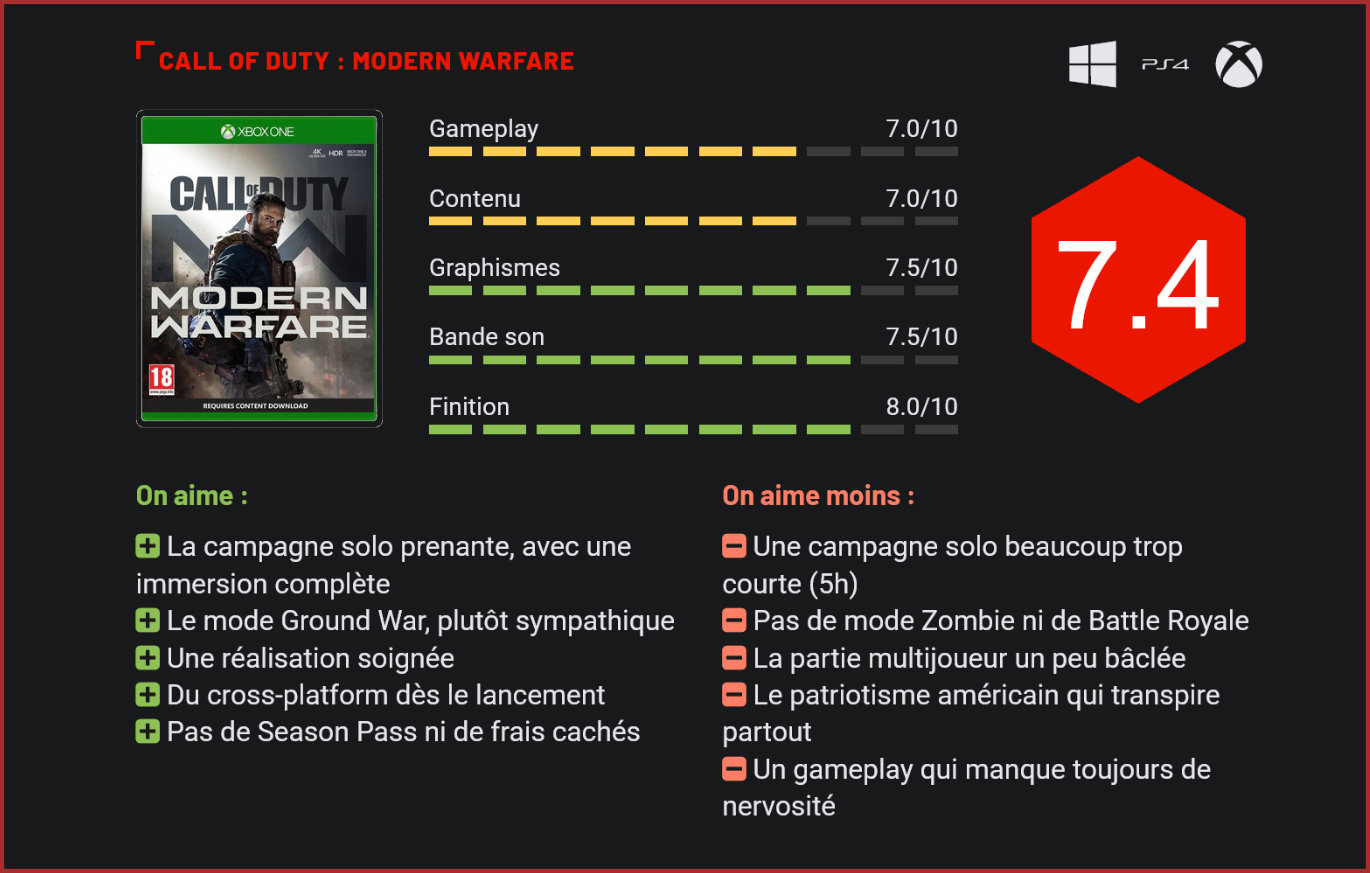 Après un Black Ops IV séduisant mais dépourvu de mode solo, Call of Duty nous revient avec un reboot en bonne et due forme qui tire son inspiration du premier Modern Warfare. Après l’abominable Advanced Warfare, Activision avait tenté de redonner du piquant à sa franchise en nous livrant un titre 100% axé sur le multijoueur. Avec son mode Battle Royale et l’inévitable mode Zombie, Black Ops IV était parvenu à fédérer une jolie communauté de fans. L’absence d’un mode solo avait été toutefois vivement critiquée par les joueurs, qui étaient nombreux à s’étonner de ce changement de direction. Bien décidé à se faire pardonner par la communauté de fans, Activision a donc mis en chantier un nouveau volet, qui a été cette fois confié aux développeurs du premier Modern Warfare. L’objectif : remettre sur les rails la franchise et nous livrer le meilleur épisode de la série… La mise en scène est très soignée. Et autant le dire d’entrée de jeu : si l’objectif n’est pas totalement rempli, ce Modern Warfare est un reboot très convaincant pour la franchise. Pour autant, il ne faut pas s’attendre à de profonds bouleversements puisque Modern Warfare hérite de toutes les qualités et défauts de ses ancêtres. Le mode solo fait son grand retour avec une campagne assez courte (comptez entre 4 et 6h de jeu), mais terriblement efficace. Le scénario du jeu est pourtant sans grande surprise puisqu’ici, le joueur traquera une organisation terroriste à l’origine d’une attaque meurtrière dans le centre-ville de Londres tout en affrontant régulièrement les forces russes sur le champ de bataille. L’aventure solo offre une belle diversité de décors, avec des passages très dépaysants dans les paysages montagneux de la Géorgie et d’une république indépendantiste russe qui nous rappelle l’Afghanistan. On ressent dans ce Modern Warfare les relents d’Al-Qaïda, de la guerre d’Afghanistan et même – occasionnellement, quelques références à la guerre de Syrie. D’un réalisme glaçant, le scénario du jeu n’hésite pas à juxtaposer plusieurs points de vue, et le fait avec brio. Le jeu n’hésite pas non plus à surprendre le joueur à travers la quinzaine de missions qui composent sa campagne. On retrouvera ainsi une mission d’élimination de terroristes dans une planque qui se boucle en moins de 5 minutes top chrono mais offre des sensations fortes tant la séquence de jeu est criante de réalisme. Dans la peau d’un soldat des forces spéciales, le joueur devra éliminer les terroristes retranchés, tout en faisant attention d’éviter de blesser les femmes et enfants qui sont avec – et peuvent d’ailleurs se transformer de façon très abrupte en des meurtriers eux aussi. Autre passage marquant : celui où le joueur incarne un enfant qui doit fuir son village en ruines. La mise en scène du jeu est particulièrement soignée et rappelle d’ailleurs celle des grosses productions hollywoodiennes. Le résultat est globalement très séduisant, même s’il a souvent tendance à tomber dans le voyeurisme malsain. On pourra également reprocher au scénario de Modern Warfare de placer encore et toujours les Américains dans le rôle des gendarmes de la paix… Il ne fallait malheureusement pas en attendre plus d’un jeu développé par un studio américain. Les Russes et Arabes récupèrent donc encore les rôles des grands vilains qui veulent détruire les démocraties occidentales et le jeu est bourré de clichés et de vilains stéréotypes. Si l’on met de côté ces éléments pratiquement indissociables de la franchise, le nouveau mode solo reste toutefois une belle réussite. Le jeu d’Infinity Ward propose une campagne solo mouvementée, qui se boucle toutefois en moins de 5h. Côté gameplay, le nouveau Modern Warfare est une copie quasi-conforme des anciens épisodes de la série. On se retrouve face à un FPS très accessible et finalement très pop-corn. Chaque séquence de jeu a été créée dans un but bien précis. On alterne ainsi les séquences de nettoyage avec des séquences d’infiltration et d’assaut. Quelques gadgets sont même de la partie, avec notamment des séquences de jeu qui vous mettront aux commandes de drones. Le cocktail est efficace mais toutes les séquences de jeu ne se valent pas. Globalement, on pourrait reprocher à Modern Warfare son level-design parfois mal fignolé. L’attaque terroriste de Piccadilly Circus par exemple, donne une curieuse sensation de confusion, en grande partie liée au level-design médiocre du niveau et aux ficelles trop apparentes du jeu. Les séquences de shoot pures sont souvent très jouissives, même si on reprochera au titre un certain manque de nervosité. Les 14 missions du mode solo se bouclent en moins de 5h top chrono, ce qui reste très léger pour un mode solo. C’est un fait toutefois, on n’achète généralement pas un Call of Duty pour sa campagne solo uniquement. Le jeu propose sont lot de modes multijoueurs. Et à ce niveau, bonne surprise : il n’y aura cette année pas de season pass. L’éditeur change radicalement de stratégie en optant cette année pour une formule 100% gratuite. Si la démarche est bonne, elle trahit malheureusement un certain manque d’ambition de la part du studio. Les joueurs de Black Ops IV seront ainsi surpris de constater que le mode Zombie est aux abonnés absents, au même titre que le mode Battle Royale, qui avait grandement contribué au succès du dernier volet. Infinity Ward est revenu à une formule plus classique, en proposant une demi-douzaine de modes de jeu. La moitié d’entre eux n’offrent malheureusement qu’un intérêt très limité, à l’image du mode 2 vs 2, qui se joue sur de toutes petites cartes, plutôt technique mais dont on fait vite le tour. Autre déception : le mode NVG, qui se joue entièrement de nuit, avec le casque à vision nocturne sur la tête et le laser de vi