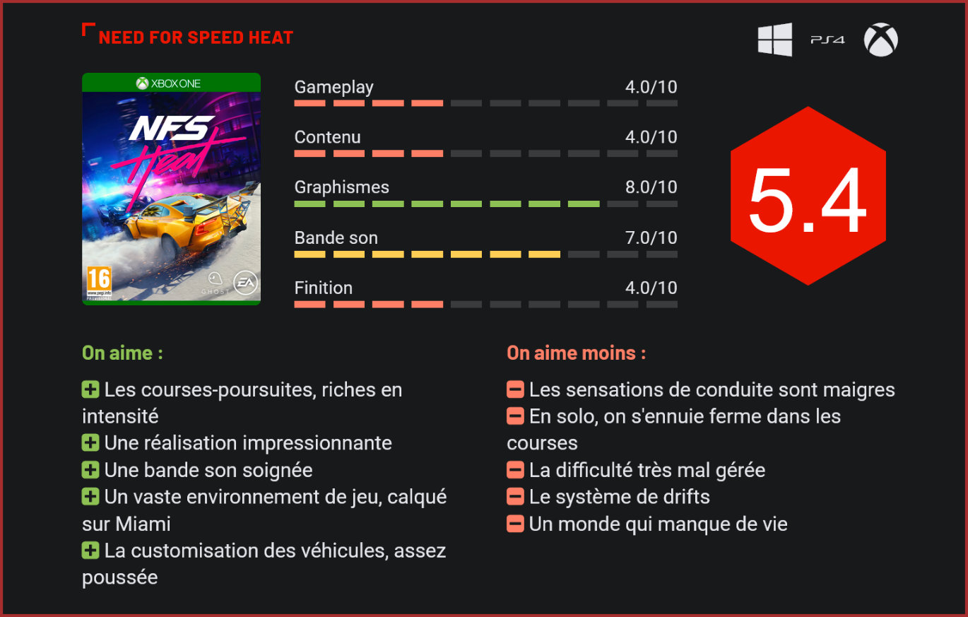 Electronic Arts tente de relancer la série des Need for Speed avec un épisode très ambitieux qui tente de réconcilier les fans de la franchise avec la série. Malgré quelques bonnes idées, Heat ne parvient toutefois pas à faire grimper la température… Parmi les séries les plus emblématiques des jeux de course arcade, Need for Speed a connu des hauts et des bas. La série d’Electronic Arts était parvenue à se relancer sur la précédente génération de consoles grâce à quelques épisodes particulièrement inspirés, à l’image de l’excellent Shift 2 et du très sympathique The Run. Paradoxalement, lorsque l’on parle de Need for Speed, ce sont toujours les courses-poursuites et le tuning qui reviennent sur le tapis. C’est un fait, si la série était parvenue à séduire les amateurx de jeux de course en osant une approche différente, elle n’est en revanche jamais parvenue à se réconcilier avec les fans du concept originel. Seul l’épisode Most Wanted, sorti lui aussi sur la précédente génération de consoles, avait reçu un joli accueil de la communauté. Depuis, c’est le calme plat – ou presque. Les deux précédents épisodes de la série ont reçu des notes qui frôlaient la moyenne. L’annonce de Need for Speed Heat avait toutefois redonné espoir à la communauté. Les courses de nuit font leur grand retour dans Need for Speed Heat. Il faut dire que les premiers visuels du jeu donnaient envie. Courses de nuit, tuning et courses-poursuites étaient censés redonner ses couleurs à une franchise qui avait perdu ses lettres de noblesse. Dans la pratique, NFS Heat est toutefois loin de remplir son contrat… Le premier contact avec le jeu donne le ton : fraîchement débarqué à Palm City, une ville qui rappelle de par sa localisation, ses conditions météorologiques et sa constitution Miami, le joueur devra se lancer dans une succession de courses sur circuits pour gagner sa croûte, puis dans des courses de nuit pour faire grimper sa réputation. Sans surprise, tous les clichés sont là, des personnages gangstas à la musique rnb qui ronronne en passant par les flics ripoux qui tentent de faire exemple pour interdire les courses illégales. Les stéréotypes sont tellement accentués qu’on en vient à se demander si le jeu ne tire pas dans la caricature pure et dure. Très vite, on se surprend d’ailleurs à zapper les cinématiques qui dressent le portrait de personnages sans aucun charme. Si les moyens sont plus importants qu’à l’époque, Heat fait nettement moins bien que Most Wanted et Carbon au niveau de son scénario, qui tient sur un timbre poste. Il est possible de customiser intégralement son véhicule. Du côté de la conduite, on se rend très vite compte que NFS Heat est plus accessible que ses ancêtres – ce qui n’est pas forcément une bonne chose dans la mesure où Need for Speed a toujours été un jeu de course arcade très grand public. La prise en main est simple, mais certaines caractéristiques ont été simplifiées à l’extrême, à l’image du drift, qui s’actionne par une succession de pressions sur la gâchette droite, et dont le contrôle reste très approximatif. On aura ainsi tôt fait de remarquer que la conduite dans le jeu est très permissive. Foncer dans les décors n’aura presqu’aucun impact sur votre véhicule. Emboutir un adversaire vous ralentira à peine. Plus incroyable encore : la plupart des courses ne nécessitent pas dans relâcher une seule fois l’accélérateur, et ce même lorsqu’on change le niveau de difficulté! A ce sujet, on notera un gestion chaotique des adversaires, qui se traîneront tantôt loin derrière vous, ou vous dépasseront à toute allure alors que vous roulez déjà au max. On le sent, le jeu n’a pas eu droit à la finition qu’il aurait mérité. Beaucoup trop simple, la conduite du jeu n’offre également pas assez de sensations. Pour le dire crument : on s’ennuie ferme dans NFS Heat, dès la première heure de jeu. Le concept était pourtant très séduisant. Comme les autres opus de la franchise, Heat propose de partir à la découverte d’un vaste monde ouvert, dans lequel il faudra participer à des courses sur circuits pour gagner de l’argent, tuner sa caisse et grimper les échelons, et participer à la nuit à des courses illégales, qui permettront de gagner en réputation. Durant ces courses de nuit, les flics se joignent souvent aux hostilités et n’hésitent pas à jouer aux auto-tamponneuses. Si ces séquences de courses-poursuites se révèlent beaucoup plus excitantes que les courses compte tenu du nombre de policiers qui peuvent se lancer à votre poursuite, on regrette que la difficulté soit une fois encore très mal dosée. Les flics vous feront toujours beaucoup plus mal que vous ne pourrez leur faire! Le jeu brille de mille feux de nuit! Autre très gros regret : si le jeu est joli et ses décors flattent la rétine, son monde ouvert manque cruellement de vie. Lorsqu’on ne participe pas à des courses, on s’ennuie là aussi très ferme et on ne prend finalement que très peu de plaisir à explorer l’univers de NFS Heat. Tout n’est toutefois pas à jeter dans ce nouveau volet. On prendra l’exemple du système de customisation très poussé, qui permet aux fans de tuning de laisser libre cours à leur imagination, tant sur les performances de leur véhicule, paramétrable dans les moindres détails, que sur leur apparence. Autre atout du jeu : la dualité entre le jour et la nuit. Si le cycle jour / nuit n’est pas dynamique (c’est le joueur qui décide quand passer de l’un à l’autre), la dualité entre les deux mondes donne un certain cachet au jeu. Durant la journée, on explore la ville et on se livre à des compétitions et la nuit on redécouvre Palm City qui brille de mille feux et on se livre à des courses poursuites effrénées. Visuellement, NFS Heat impressionne également, avec un moteur gr