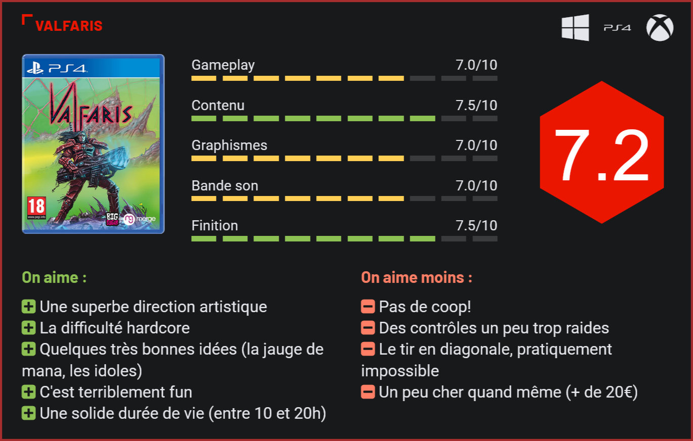 Après nous avoir livré le très sympathique Slain : Back from Hell, le petit studio de développement Steel Mantis récidive avec un jeu à mi-chemin entre Contra et Castlevania qui joue la carte de la science-fiction décomplexée… Passé relativement inaperçu au moment de sa sortie – si ce n’est auprès d’une toute petite communauté de joueurs -, Slain : Back from Hell avait pourtant reçu un accueil très chaleureux des critiques. Ses créateurs nous reviennent aujourd’hui avec un nouveau projet totalement indépendant qui reprend dans les grandes lignes le concept de Slain, avec toutefois un angle sensiblement différent puisque Valfaris abandonne l’univers médiéval pour nous proposer un univers SF à la sauce métal. Malgré son univers très sombre, Valfaris est très coloré. Valfaris n’est pas sans nous rappeler le très sympathique Blazing Chrome, fraichement sorti sur consoles et PC. Côté gameplay, on se situe à mi-chemin entre un run ‘n gun à la Contra et un Castlevania-like, avec la difficulté légendaire de Slain : Back from Hell en supplément. Car oui, dans Valfaris, vous allez mourir et plus d’une fois! Le titre est volontairement très hardcore. Toutefois, rien d’insurmontable puisque les niveaux du jeu sont parsemés de points de sauvegarde qu’il faudra activer à l’aide d’idoles récupérées dans les niveaux. Petite originalité à ce sujet : en choisissant de ne pas sauvegarder la partie et donc de conserver ses idoles, le joueur se donne la possibilité de renforcer son personnage et d’améliorer la puissance de son arsenal – ce sont en effet ces mêmes idoles qui débloquent les upgrades. Un concept séduisant, qui pousse le joueur à prendre risques… Dans la peau de Thérion, un guerrier indomptable qui est bien décidé à se venger de son père, le joueur explorera une planète à l’écosystème peu hospitalier dans lequel il passera la plupart de son temps à éviter des pièges mortal, affronter des monstruosités et terrasser des boss. La formule n’a rien d’original mais le concept fonctionne à merveille. Les ennemis sont parfois titanesques. Pour autant, tout n’est pas parfait dans ce mélange improbable de genres. Car c’est bien là le problème avec ces titres hybrides, qui ne savent jamais vraiment sur quel pied danser. C’est un fait, la jouabilité du titre reste très imprécise. Impossible pratiquement de tirer en diagonale. L’option est là, mais les contrôles sont tellement brouillons que cela tient du miracle de toucher sa cible dans cette direction. De façon générale, on aura tendance à bouger beaucoup pour se repositionner en face de sa cible. On notera au passage que les affrontements poussent le joueur à alterner tirs à distance et combats à l’arme blanche. Si l’on pourra reprocher à Valfaris la simplicité de son gameplay, le titre offre une profondeur qu’on ne parviendra à saisir qu’après l’heure de jeu, avec une jauge de mana qui est utilisée pour alimenter le bouclier et l’arme plus puissante du héros. Dans la pratique, cela rend les affrontements très stratégiques dans la mesure où on a souvent tendance à prendre des risques pour économiser cette barre de mana, qui se recharge au gré des coups portés aux adversaires. La direction artistique du jeu est splendide. Pour le reste, Valfaris assume ses références et s’en sort finalement très bien avec sa difficulté bien dosée, ses combats de boss épiques, ses niveaux variés sa solide durée de vie (comptez 9h de jeu pour les plus rapides, et jusqu’à 20h pour ceux qui ont vraiment du mal…) Côté réalisation aussi, le petit studio réalise presqu’un sans faute avec du pixel-art de très haut standing. Les décors sont superbes, certains effets visuels nous en mettent plein les yeux et la direction artistique rend un merveilleux hommage aux classiques du genre. Certes, les animations auraient pu être plus travaillées mais pour un jeu à tout petit budget, Valfaris s’en sort très bien. Même constat pour ce qui est de la bande son, qui rend hommage aux classiques du métal plutôt brillamment. S’il frôle la perfection sur certains points, Valfaris souffre toutefois de quelques vilains défauts qui l’empêcheront d’accéder au rang de hit incontesté, à commencer par l’absence d’un mode coop qui se fait cruellement ressentir. Il faudra en effet parcourir le jeu en solitaire… L’autre défaut majeur, c’est le prix du jeu, qui est tout de même vendu plus de 20€ sur les stores numériques. Un tarif de 15€ ou moins aurait été plus approprié, vu l’absence de coop. Les amoureux de Contra-like et de Castlevania-like en auront toutefois largement pour leur argent, et auraient d’ailleurs tort de ce priver de ce délicieux hommage au rétrogaming. Conclusion Après l’excellent Slain : Back from Hell, Mantis récidive et nous livre un excellent jeu d’action, délicieusement hardcore et qui transpire le rétrogaming. A mi-chemin entre un Castlevania et un Contra, le titre de Mantis ne prend que peu de risques au niveau du gameplay. Si on lui reprochera des contrôles parfois délicats, difficile de ne pas tomber sous le charme de l’univers à la fois très sombre et très coloré de Valfaris, de ses quelques idées ingénieuses de gameplay et de ses graphismes en pixel-art délicieusement old-school. Après le très sympathique Blazing Chrome, les amateurs de rétrogaming tiennent là leur prochaine pépite. Si l’aventure est longue et passionnante, on reprochera toutefois au studio de ne pas avoir intégré un mode coop, pourtant incontournable dans ce type de production…