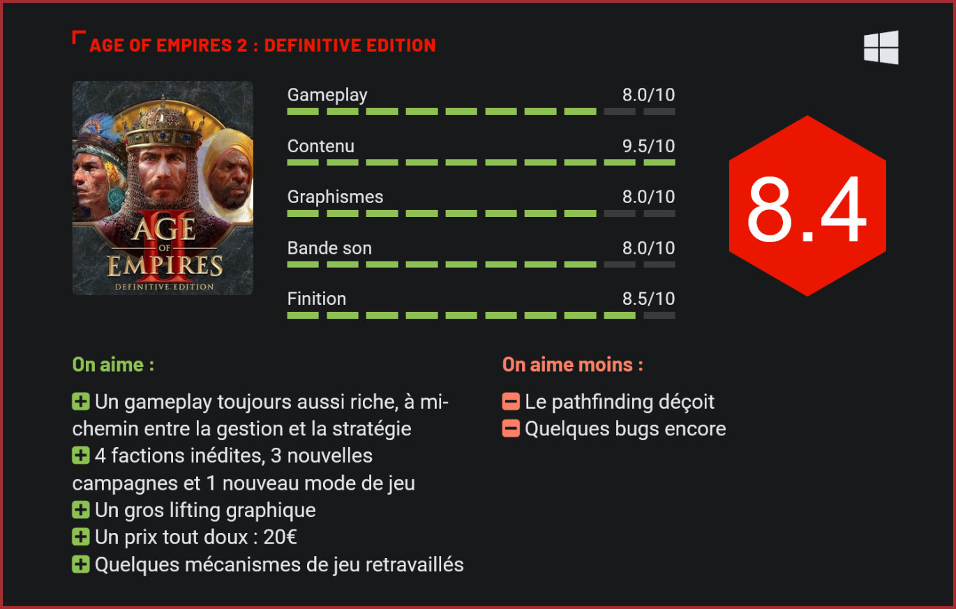 20 ans après sa sortie, Age of Empires 2 a droit à un remaster en bonne et due forme sur PC. L’occasion pour les amateurs de jeux de stratégie de redécouvrir ce grand classique. Et cette fois, Microsoft semble avoir bien compris ses erreurs. La Definitive Edition d’Age of Empires 2 est disponible à la fois sur Steam et sur le Store de Microsoft – mieux, le titre est même intégré au Xbox Gamepass pour PC. Les abonnés à cette formule ne devront donc pas dépenser un seul euro pour y jouer. Pour les autres, le titre est facturé 20€, un tarif très respectable compte tenu de l’énorme travail qui a été accompli. Visuellement, le jeu n’a pas pris une ride. Car pour ce remaster, les développeurs ne se sont pas contentés d’un simple lifting. Nous avons pratiquement droit à un remake complet du jeu, avec des graphismes remis au goût du jour, des mécanismes de jeu retravaillés et même de nouveaux contenus. La grande force d’un remaster de ce type – à l’image de celui du premier volet -, c’est de revoir certains mécanismes de jeu qui ne fonctionneraient plus aujourd’hui. Cette Definitive Edition corrige ainsi toute une série de défauts du jeu d’origine. L’essentiel des corrections concerne l’intelligence artificielle des unités. Par exemple, les villageois recréeront désormais par eux-mêmes une ferme une fois ses ressources épuisées. Plus besoin de courir tout le temps après ses villageois donc, pour être sûr qu’ils ne restent pas les bras croisés… On retrouve de nombreuses autres petites retouches de ce type. Contrairement à la réédition du premier volet, il est désormais possible de commander différents types d’unités dans une même caserne pour que les “commandes d’unités” se suivent. Vous ne devrez donc plus construire une caserne pour chaque type d’unité pour répondre à la demande. En revanche, le pathfinding des unités ne semble pas avoir été retouché. Ceci donne lieu à des situations parfois très cocasses mais également très agaçantes, comme lorsqu’un de vos villageois reste bloqué par une construction qu’il vient de terminer – alors qu’ils auraient logiquement se déplacer de l’autre côté du bâtiment au moment de la construction. Il est regrettable que les développeurs n’aient pas retravaillé cet aspect. Les champs de bataille peuvent vite devenir surchargés. Pour le reste, on retrouve pratiquement le même jeu qu’il y a 20 ans. Les mécanismes de jeu n’ont pas changé. Il s’agit toujours de développer sa civilisation, en partant d’un tout petit village qu’il faudra transformer en cité luxuriante, en développant de nouvelles technologies, passant les âges, créant une gigantesque armée pour se défendre et attaquer ses ennemis, explorer la carte – et – dans certains cas -, récupérer des reliques ou construire des merveilles. Le jeu offre un contenu très solide avec ses nombreuses missions scénarisées, ses dizaines de civilisations (avec pour chacune des spécificités et unités propres), ses multiples conditions de victoire et ses nombreux modes de jeu. Habile mélange de jeu de stratégie en temps réel et de jeu de gestion, Age of Empires 2 reste un monument du jeu vidéo, qui n’a rien perdu de son aura malgré les années. Son plus gros atout reste bien sûr sa faculté à proposer une expérience de jeu complète, de la micro-gestion à l’économie de grande échelle en passant par les mouvements de troupes et le siège de villes. Age of Empires 2 introduisait ainsi de nombreux mécanismes de jeu inédits à l’époque de sa sortie, avec ses armes de siège, murailles et chateaux forts. Le contenu gargantuesque du jeu (on retrouve un total de 27 campagnes en solo!) trahit la volonté du studio de gâter les fans de la série. On notera au passage que cette Definitive Edition ne rassemble pas seulement le contenu du jeu originel mais aussi de son extension plus quelques contenus additionnels totalement inédits. On retrouve ainsi quatre nouvelles civilisations – Les Bulgares, Cumans, Lituaniens et Tatares – qui ont toutes leurs unités et spécificités propres. Du côté des scénarios, on retrouve 3 campagnes inédites, toutes passionnantes de bout en bout. Le jeu introduit 4 civilisations inédites. Du côté des modes de jeu, on retrouve également une nouveauté de taille avec le mode Empire Wars, qui débute à l’Âge Féodal et pousse le joueur à l’affrontement dès le début de partie. Si celui-ci ne vous plait pas, sachez qu’il existe pas moins de 9 autres modes de jeu multijoueur. Chacun y trouvera donc de quoi s’amuser. Du côté des fonctionnalités en ligne aussi, cette Definitive Edition ne déçoit pas non plus avec des leaderboards, lobbys, un mode spectateur, des matchs classés, et même l’intégration de Mixer. Si vous accrochez au concept, il y a de quoi passer des centaines d’heures sur le jeu. Inutile de le préciser : pour 20€, le contenu est donc très riche. Le plus surprenant reste toutefois l’énorme travail réalisé au niveau de la réalisation. Les développeurs ne se sont pas contentés d’un simple lifting haute définition. Tous les modèles ont été retravaillés. Le résultat dépasse toutes les attentes puisqu’Age of Empires 2 Definitive Edition est très agréable à la rétine – même s’il n’exploite pas un moteur graphique dernier cri. Certes, on remarque que les modélisations des personnages restent très simples lorsqu’on zoome au maximum. Mais la fluidité est là, et dès que la caméra est positionnée de façon réaliste – c’est à dire avec un plan large – l’émerveillement est complet. La direction artistique du jeu est toujours aussi superbe, la bande sonore également – même si l’on aurait sans doute apprécié plus de travail au niveau des bruitages, qui ne semblent pas avoir beaucoup évolué depuis 1999. On notera au passage que malgré ses bonne