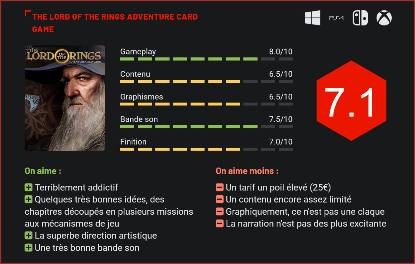 Sorti en accès anticipé sur PC en 2018, le jeu de cartes dans l’univers du Seigneur des Anneaux est désormais disponible également sur Xbox One, Switch et PS4 dans sa version finale. Développée par Asmodee, cette nouvelle adaptation de l’oeuvre de Tolkien s’écarte des précédentes tentatives de porter l’univers du Seigneur des Anneaux en jeu. Cette fois, pas de jeu d’aventure ni de stratégie puisqu’Asmodee nous livre un jeu de cartes dans la plus pure tradition des Hearthstone et autres Elder Scrolls Legends. Les decks ne sortent pas non plus de nulle part puisque le jeu de cartes du Seigneur des Anneaux existe depuis plusieurs années. Sa popularité reste toutefois nettement plus maigre que celle d’un Magic. Visuellement, le jeu est plutôt joli. Avant de se lancer, il est important de préciser qu’il n’est pas question ici d’un free-to-play mais d’un jeu payant – facturé 24,99€ tout de même -, dont le contenu est essentiellement narratif. Et c’est sans doute finalement l’aspect le plus critiquable du jeu. Car si Thronebreaker avait prouvé qu’il existait un marché pour les jeux de cartes narratifs, The Lord of the Rings Adventure Card Game n’a pas la prétention de rivaliser avec le jeu de CD Projekt et cela se ressent au niveau des moyens déployés. S’il est plaisant, le jeu d’Asmodee ne déclenche jamais l’effet wow – tant dans sa réalisation qu’au niveau de son contenu. Le concept initiale est pourtant excellent puisque The Lord of the Rings Adventure Card Game propose de revivre les grands moments de la saga à travers des quêtes s’étalant sur 4 à 5 missions. L’originalité du jeu vient du fait que la partie se poursuit sans être entrecoupée par le changement d’objectif. Concrètement, une fois une mission terminée, le joueur conserve ses cartes en main et ses unités sur le terrain et part à l’assaut de la mission suivante. Cette approche très particulière force le joueur à redoubler de prudence dans la gestion de ses cartes. Terminer la partie précédente en mauvais posture ajoute un sérieux handicap en début de mission. Chaque chapitre regroupe plusieurs missions, qui sont liées. A travers le mode solo, le joueur débloquera de nombreuses cartes qui lui permettront ultérieurement de composer son propre deck. L’aventure scénarisée ne laisse que peu de place à la customisation. La plupart des missions placent le joueur aux commandes d’un deck relativement simple, qu’il devra utiliser pour mener à bien sa mission et remplir les objectifs qui lui sont donnés. Comme Hearthstone, le jeu Le Seigneur des Anneaux propose des combats au tour par tour, intègre un système de mana (cumulable ici), qui permet de lancer des sorts ou déployer des unités sur le terrain, et place sur l’échiquier des personnages aux spécificités propres, dotés de points d’attaque et de défense. Le titre se distingue toutefois de son modèle de par certaines spécificités, à l’image des points d’attaque qui diffèrent selon le type d’unité ciblée. Un même soldat pourra donc être plus efficace pour terrasser une tour que pour s’attaquer à une araignée géante. Dans le même ordre d’idée, on note la présence de deux jauges sur le côté de l’écran : l’une symbolise la jauge de destin, qui vous permettra de changer le déroulement de la partie, l’autre, celle de l’oeil de Sauron, représente une menace qui pèse sur votre groupe d’aventuriers. Dans le jeu, le joueur pourra ainsi choisir de combiner plusieurs héros dans un seul deck pour bénéficier de leurs avantages propres, ou de ne sélectionner qu’un seul ennemi, auquel cas la jauge progressera moins rapidement mais la difficulté sera forcément plus élevée. En cours de partie, il faudra veiller à remplir les conditions de victoire et à éliminer le plus de créatures avant l’accomplissement de l’objectif pour que la jauge de Sauron ne grimpe pas de façon significative – car une fois celle-ci remplie, la partie s’achève. Les objectifs diffèrent radicalement d’une partie à l’autre. Ces petites spécificités permettent au jeu d’Asmodee de se démarquer des autres jeux de cartes. Globalement, le titre est intelligemment construit. Créer son propre deck est également un véritable régal, même si l’on regrettera la relative maigreur des decks – de maximum 30 cartes. Pour créer son deck, le joueur pourra choisir parmi des cartes neutres, 1 à 3 héros, et les cartes associées à ces héros – divisées en plusieurs segments entre les unités à lancer sur le terrain, les sorts et les objets qui permettent de booster les traits d’un personnage. On notera au passage qu’il est possible de créer des decks aux rôles très différents, prônant la confrontation directe ou au contraire une stratégie plus durable, basée sur le contre ou la surprise. La diversité est présente et on prend un réel plaisir à établir des stratégies parfois complexes. La bonne nouvelle, c’est que cette version finale du jeu s’est délestée de l’une des plus grosses tares du early access, à savoir les lootboxes, qui pourrissaient le système de jeu, forçant le joueur à dépenser de l’argent supplémentaire dans le jeu pour débloquer des cartes. Le contenu du jeu a été enrichi de multiples missions et la durée de vie – sans être gigantesque – promet désormais des heures et des heures de jeu. Le titre intègre également un mode coop très fun et Asmodee promet l’ajout de multiples extensions qui permettront d’ajouter quêtes et cartes au rooster. Bref, le modèle économique est plutôt bien fichu, et même si le prix de vente du jeu a de quoi refroidir, on ne regrette pas son achat. La direction artistique est superbe. Alors certes, on pourra reprocher à cette adaptation d’avoir simplifié quelques aspects du jeu de cartes duquel le jeu s’inspire, et de ne pas intégrer un mode de jeu