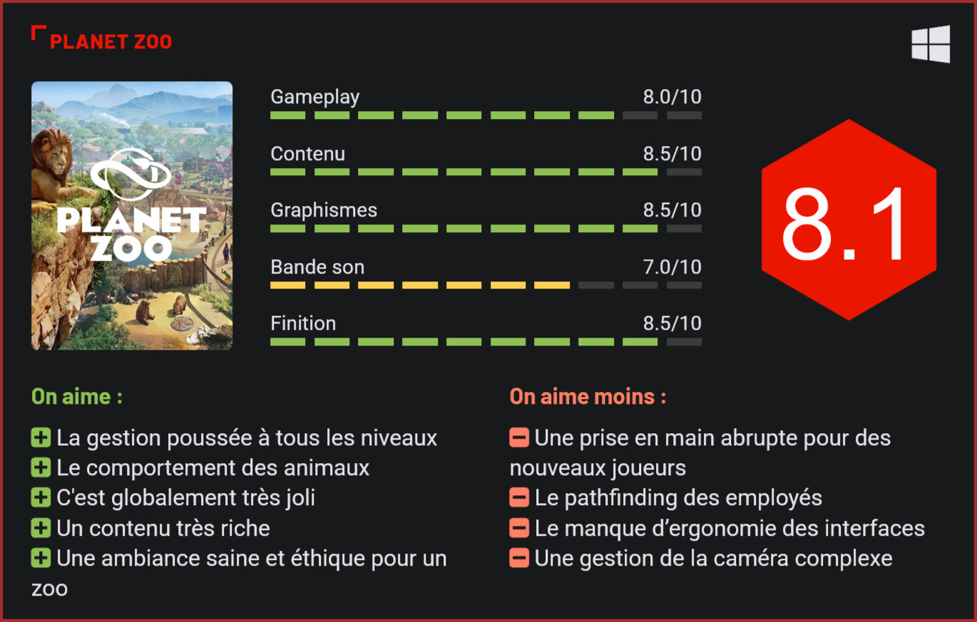Après un excellent Planter Coaster et un très séduisant Jurassic World Evolution, Frontier Developments propose un nouveau jeu de gestion à la croisée des deux autres. Un nouveau titre axé sur la gestion de parcs zoologiques. Savant mélange d’attention portée au bien-être animal et à la satisfaction des visiteurs, Planet Zoo se révèle être un jeu de gestion particulièrement complet. Les plus sages des joueurs adeptes des jeux de gestion se souviendront forcément de la série des jeux Tycoon et plus particulièrement des fameux Zoo Tycoon. Un genre de jeu qui se démarque largement des triples AAA actuels orientés action, mais qui résiste malgré tout et continue de divertir les adeptes. Le thème du zoo est vu est revu, mais Planet Zoo est particulièrement beau et réaliste. Sur fond de reprise d’un zoo quelque peu délaissé, le joueur se voit confier la lourde tâche de remettre plusieurs parcs zoologiques sur les bons rails dans le mode campagne. Une tâche qui ne sera pas seulement axée sur le divertissement et la satisfaction des visiteurs puisque Planet Zoo place le bien-être des animaux au cœur de l’aventure. D’ailleurs, l’étape du parc n’est pas une finalité pour les bêtes puisque l’objectif du zoo est de pouvoir les relâcher dans la nature. En effet, le bonheur au sens large des pandas, phacochères et autres autruches occupera une place importante dans l’aventure de Planet Zoo. Et pour cela, le studio Frontier Developments n’a laissé de côté aucun aspect lié aux soins animaliers. S’occuper des animaux ne consiste pas seulement à construire un enclos, à mettre un point d’eau et de la nourriture, ajouter quelques végétations et à attendre les dons des visiteurs. L’expérience de gestion d’un zoo est beaucoup plus poussée que cela, mais commençons d’abord par le début. Comme tout bon jeu de gestion, Planet Zoo propose un mode campagne qui servira en grande partie de tutoriel. À travers 12 missions, le joueur sera amené à développer de nouveaux enclos, à prendre soin des animaux et à faire en sorte que tout se passe pour le mieux pour les visiteurs. Une excellente entrée en matière pour intégrer les mécanismes et les points d’attention du jeu. Le mode campagne présente également une bonne partie des problèmes auxquels le joueur devra faire face, mais aussi la manière dont les résoudre. La campagne sera également l’occasion d’avoir un aperçu global des propriétaires de zoos ; d’un côté, nous avons l’amoureux transis et de l’autre, l’entrepreneur avare qui ne se préoccupe des bêtes que lorsqu’elles peuvent lui rapporter gros. Une dichotomie marquée qui nuance malgré tout le monde « merveilleux » des zoos. Le bien-être des animaux est placé au centre du jeu. De manière générale, l’aventure Planet Zoo est poussée à l’extrême. Il est bien loin le temps où gérer des animaux consistait à mettre un enclos, les nourrir, les abreuver et nettoyer de temps en temps leur territoire. Ici, il faudra prendre un compte 4 aspects pour assurer le bien-être de l’animal ; son alimentation, sa sociabilisation, son habitat et son optimisation. Ainsi, en fonction de la race des animaux, vous devrez aménager des habitats plus ou moins grands, mais aussi des murs de grande taille si les animaux ont tendance à vouloir explorer le parc comme bon leur semble. Il faudra également prendre en compte leur habitat naturel pour adapter leur enclos en fonction de celui-ci. S’il n’y a pas assez d’herbe ou au contraire pas assez de sable ou de roche, l’animal ne se sentira pas bien. Adopter de nombreux animaux de la même espèce pour accroitre la joie des visiteurs ne sera pas une bonne solution. S’ils sont en surnombre ou plutôt de caractère solitaire, les animaux pourront être stressés, voire violents. Certains pourront même se battre soit parce qu’ils se sentent oppressés soit simplement pour être le mal alpha. Dans l’un ou l’autre cas, il faudra être vigilant puisque les bêtes peuvent se blesser. Il faudra également garder un œil sur l’accouplement des bêtes qui pourrait engendrer une surpopulation. Quant à l’optimisation, cela passe par l’alimentation qui devra être en conséquence, sans être dans l’excès, mais aussi par l’ajout d’objets ludiques histoire que les bêtes s’amusent dans leur enclos. Pour savoir comment rendre les animaux plus heureux, il faudra sélectionner l’animal et passer en revue ses différents menus afin de trouver ce qu’il manque dans son enclos, notamment des objets pour se pendre, des points d’eau, etc. Ce genre de soucis sera porté à l’attention du joueur via un système de notification, mais si certains aspects peuvent être corrigés et améliorés, d’autres ne pourront pas l’être puisqu’ils résultent de mauvaises décisions prises en amont. Or, le jeu ne dévoile pas toutes ses cartes de prime abord, il faudra passer par le centre de recherche pour apprendre de nouveaux éléments sur le bien-être animal et sur les combinaisons possibles. Il faudra également passer en revue les différents tableaux, menus et autres données des soigneurs et animaux afin d’offrir un environnement optimal aux animaux. Vous vous en doutez, devoir cherchez des éléments de réponses à gauche et à droite a quelque chose de particulièrement frustrant. Il aurait mieux valu rassembler toutes les informations dans un seul cadre, cela nous aurait éviter de faire des erreurs. L’aspect attractif du parc est également très important. Pour ce qui est de l’autre grand aspect des objectifs de Planet Zoo ; les visiteurs, il faudra s’assurer qu’ils ont de quoi se désaltérer et manger, mais aussi qu’ils disposent des bonnes infrastructures pour observer les bêtes, ainsi que des bonnes informations. La satisfaction des visiteurs n’est pas qu’un à côté puisque plus ils sont contents plus ils déposeron
