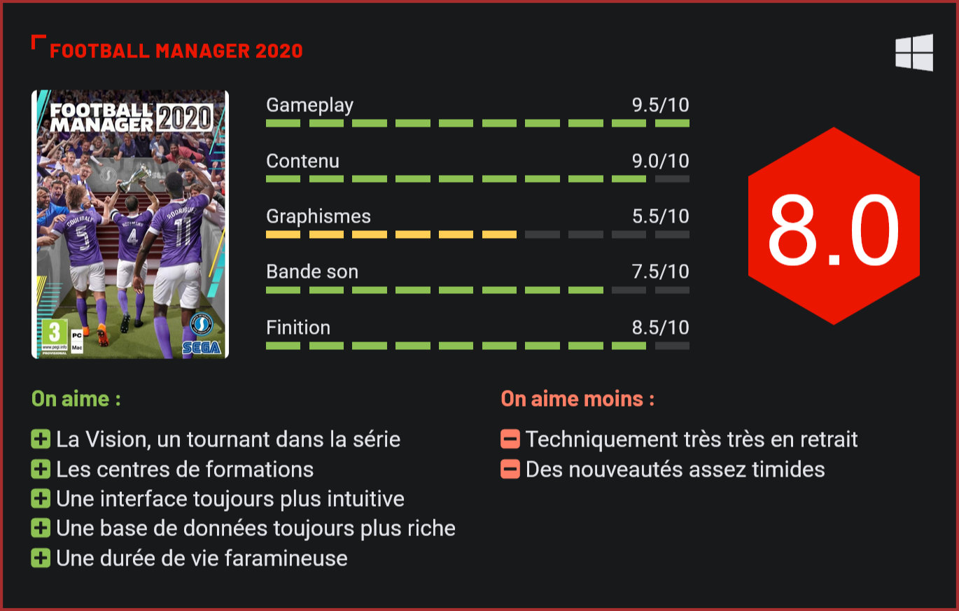 La simulation de Sports Interactive s’est depuis longtemps imposée comme la référence ultime en son genre. Football Manager 2020 se veut parfaitement adapté aux fans qui investissent des centaines, voire des milliers d’heures dans la série chaque année. La majorité des nouvelles features sont centrées autour de l’augmentation de variété et d’authenticité sur le long terme, avec l’apparition par exemple d’objectifs sur plusieurs années qui vous forceront à récompenser votre façon de débuter votre carrière d’entraîneur. Le résultat est un jeu qui révèle son véritable potentiel au fil des saisons. La Vision modifie significativement l’expérience. La nouveauté symbolique de ce parti pris est la Vision, qui consiste en l’élaboration d’un plan sur 5 ans. Cela passe donc par des objectifs long terme à fixer, et il faudra ainsi régler les transferts, le style de jeu ou les résultats en compétition sur plusieurs années. Une fois les objectifs fixés, vous serez jugé non seulement sur vos performances récentes mais aussi sur votre capacité à atteindre les étapes nécessaires afin d’obtenir le résultat escompté. Tout ceci est présenté aux managers en herbe avant le début de la saison. Un focus a été opéré sur les jeunes joueurs issus de centres de formation. L’arrivée des jeunes joueurs est beaucoup plus simple à encadrer grâce aux nouveaux systèmes mis en place. Le centre de formation vous aidera à développer vos nouvelles stars à travers des conseils de jeu, en catégorisant les recrues par potentiel, besoins, etc. Vous pouvez d’ailleurs gérer les entraînements, le calendrier et les tactiques à préférer, le tout joueur par joueur ! Ces options ont été intégrées pour les managers méticuleux, mais notez que vous pouvez aussi laisser les recrues et votre équipe décider de ces derniers paramètres. Lors de la négociation de vos contrats les plus juteux, vous avez désormais une option de temps de jeu. Celle-ci vous permettra de régler l’évolution du temps passé sur le terrain par le footballer, et ainsi régler les sommes à dépenser. Vous serez également plus entouré que jamais grâce à l’équipe technique, enrichie de nouveaux rôles. Tous ces nouveaux collègues vous donneront des conseils et interactions à toutes les étapes. On note aussi la présence d’équipes dédiées à toutes les facettes légèrement compliquées de la gestion de vos stars. Comme à son habitude, le nouveau Football Manager propose une interface améliorée, ainsi que des ajustements dans divers aspects de la gestion d’équipe. La nouveauté la plus efficace, c’est la possibilité de recevoir des conseils détaillés au sujet de la sélection de l’équipe du jour, particulièrement lors des expérimentations de présaison, où des joueurs sont suggérés par rapport à leur état physique et moral. Le moteur graphique laisse toujours à désirer. Côté graphismes, le moteur de jeu utilisé pendant les matchs a été légèrement mis à jour, affichant à présent plus de détails dus à la refonte graphique des modèles de joueurs et d’entraîneurs. Techniquement, cela reste (forcément) très pauvre par rapport à un FIFA – et on serait d’ailleurs en droit d’en attendre un peu plus – surtout au niveau des animations et de la mise en scène. Le jeu est par ailleurs toujours victime d’une IA parfois hasardeuse en défense, mais celle-ci se rattrape à l’aide d’arrêts de grande classe et d’intelligentes manœuvres dans le dernier carré. Conclusion C’est un quasi sans fautes. Cette cuvée 2020 de Football Manager a parfaitement compris son public et tient à le prouver jusqu’à bouleverser certains de ses fondamentaux. Cette année, plus que jamais, le jeu ne s’apprécie pleinement qu’à travers plusieurs saisons, et ce surtout grâce à la Vision, qui vous permet d’impacter l’entièreté de la structure du jeu, et donc augmenter la difficulté et le réalisme de la gestion d’équipe. L’ajout de centres de formation complète brillamment ce parti pris. Très riche en contenu, Football Manager 2020 se rapproche toujours plus de la simulation ultime et peaufine au fil des années sa recette. Le moteur graphique continue d’évoluer par petites touches, mais reste très en retrait par rapport aux autres productions. Difficile toutefois d’en vouloir aux développeurs de Sports Interactive tant l’essentiel n’est pas là.