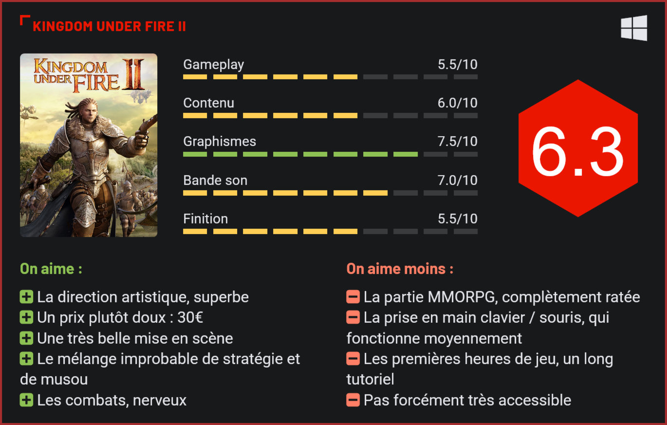 12 longues années. C’est le temps que les fans auront dû attendre pour enfin pouvoir mettre la main sur Kingdom Under Fire 2, la plus grosse arlésienne du jeu vidéo. Annoncé en janvier 2008, Kingdom Under Fire II se sera fait attendre 12 longues années. Plus longue arlésienne de l’histoire du jeu vidéo, le projet a failli mettre sur la paille le studio de développement coréen qui l’a chapeauté. Kingdom Under Fire II est d’ailleurs officiellement devenu le jeu le plus cher développé dans le pays, avec un budget de plus de 70 millions de dollars! La mise en scène est digne d’un film à gros budget. Si, paradoxalement, le développement du jeu avait débuté sur Xbox 360 – les 3 précédents volets étaient d’ailleurs des exclusivités Xbox! -, le titre était devenu une exclu PS4 en 2013, avant d’être transformé en une exclusivité PC. Le développement ne se sera pas fait sans encombres entre les multiples reports, changements de stratégie et d’orientation. S’il était censé être la suite de Kingdom Under Fire : The Crusaders (Xbox) et Kingdom Under Fire Heroes (Xbox), le jeu a finalement adopté un style très différent tout en conservant certains éléments de gameplay des précédents volets. On retrouve ainsi avec plaisir le mélange de stratégie et de combats au corps à corps qui avait fait le succès de la franchise sur la console de Microsoft mais également des éléments de jeu empruntés aux MMORPG, qui ont certainement été implantés après son annulation sur consoles. Vous vous en doutez, le résultat est loin d’être irréprochable. Impossible ou presque d’arriver à un résultat concluant après autant de déboires. Si Kingdom Under Fire II n’est pas une catastrophe, il est malheureusement loin d’être aussi bon que ses ainés. Au début du jeu, le joueur sera amené à créer son personnage de A à Z. La série des Kingdom Under Fire a connu bien des évolutions. Le tout premier volet, sorti sur PC, lorgnait du côté des RTS dans la plus pure tradition des Warcraft. Sa suite, Kingdom Under Fire : The Crusaders, proposait une expérience de jeu adaptée au pad, et mélangeait brillamment stratégie en temps réel et musou, avec un gameplay inspiré de Dynasty Warriors. Après l’épisode Heroes, qui reprenait la même formule, le studio coréen nous avait livré un spin-off sur Xbox 360 qui abandonnait la stratégie pour proposer un grand défouloir en s’inspirant des hack & slash. La formule n’avait pas totalement convaincu les joueurs à l’époque. C’est à cette époque la divorce sera prononcé entre Blueside et Microsoft, qui lancera sa propre franchise avec Ninety-Nine Nights, qui connaîtra deux itérations avant de tirer sa révérence. De son côté, le studio coréen tentera de relancer la franchise en développant un titre censé suivre la voie toute tracée par The Crusaders. Si les premiers trailers vendent du rêve, les difficultés rencontrées dans le développement du jeu forceront le studio à emprunter un chemin très différent. The Crusaders était en effet un titre pensé pour les consoles. La sortie du jeu sur PC allait donc forcer le studio à revoir la prise en main du titre. Chemin faisant, les développeurs décideront de garder certains éléments de The Crusaders tout en introduisant de nouveaux mécanismes inspirés des MMORPG… Sorti sous la forme d’un free-to-play en Asie, Kingdom Under Fire II est pourtant bien un jeu payant en Occident. Il faudra débourser environ 30€ pour mettre la main dessus. Un tarif somme toute très correct pour un titre qui a totalement abandonné son modèle free-to-play pour proposer une expérience premium intégrale. Le joueur aura le choix entre 5 factions. L’aventure commencera avec le choix de la faction et la création du personnage principal. Le système de personnalisation est extrêmement poussé et le rendu absolument superbe. Les 5 classes disponibles offrent également une belle diversité d’entrée de jeu. Chacun devrait y trouver pour son compte entre le mage, l’archer et le guerrier. Si chaque classe a des caractéristiques qui lui sont propres, les personnages sont tous capables de se battre à la fois au corps à corps et à distance. La première mission du jeu proposera de défendre une forteresse d’un assaut ennemi. L’immersion est totale. On retrouve d’entrée de jeu tout ce qui a fait le succès de The Crusaders : de vastes champs de batailles, différents types d’unités à contrôler et des combats extrêmement nerveux. Difficile de ne pas tomber sous le charme du jeu. Toutefois, on se rend également très vite compte des vilains défauts du jeu, de l’intelligence artificielle qui semble ne pas avoir évolué en 12 ans aux scripts apparents. Durant la mission tutoriel, le joueur apprendra les rudiments du métier. Il apprendra à diriger son personnage sur le champ de bataille, à manipuler la lame, utiliser les coups spéciaux et les boosters, avant d’affronter un boss titanesque qu’on croirait tout droit sorti d’un God of War. L’ennui, c’est que ce passage qui aurait dû être épique est totalement raté, la faute à une prise en main qui ne convient absolument pas aux affrontements de boss. Certains passages sont complètement ratés, à l’image des combats de boss et de l’aspect MMORPG. Et puis, bien sûr, il y a la découverte de l’aspect MMORPG du jeu. Comme nous l’avons évoqué plus haut, les missions sont entrecoupées par des séquences de jeu dans lesquelles le joueur évolue dans des zones de jeu plus larges, multiplie les dialogues et doit remplir de petites missions allant de l’élimination d’ennemis à la récupération d’objet. Si les dialogues permettent d’apporter un peu de profondeur au scénario du jeu, on regrette que les séquences de jeu dans ces mini open-world soient aussi creuses. Faire un break entre deux batailles était pourtant une très bonne idée. L