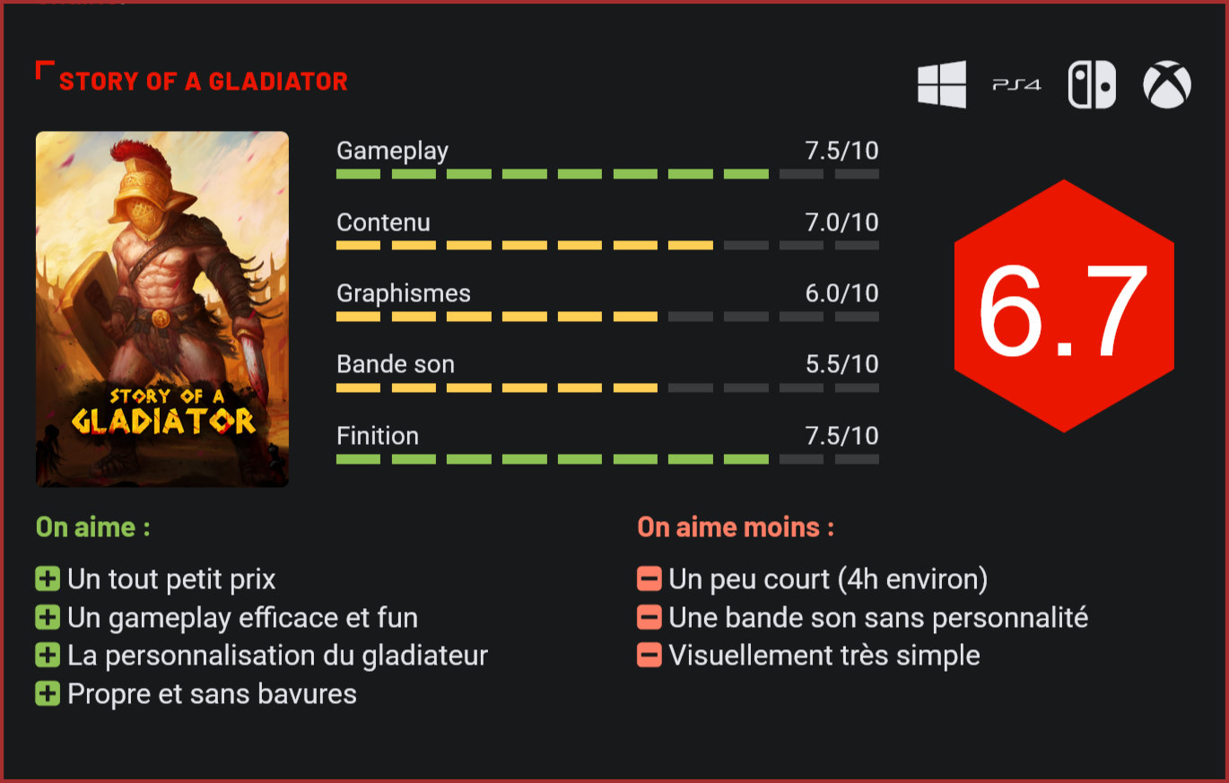 Sorti de nulle part, Story of a Gladiator est un petit beat them all indépendant qui joue la carte du old-school pour séduire les amateurs d’un genre moribond. Développé par le petit studio britannique Brain Seal, qui avait signé les deux Dark Quest, Story of a Gladiator est un beat them all old-school qui tente une approche très originale du genre avec des combats en arène dans la peau d’un gladiateur, en pleine Rome antique. Chaque niveau vous proposera d’affronter plusieurs vagues d’ennemis. Il ne faut pas s’attendre ici à un jeu à gros budget. Le titre de Brain Seal est vendu une petite dizaine d’euros sur les stores numériques. Story of a Gladiator est très clairement un jeu de niche qui s’adresse pratiquement exclusivement aux fans de beat them up. Le jeu de Brain Seal reste toutefois très accessible avec la présence d’un mode facile qui permettra même aux débutants de progresser jusqu’à l’arène finale sans (trop) souffrir. Si on reprochera d’entrée de jeu au titre sa présentation trop simpliste, difficile de ne pas tomber sous le charme d’un concept simple mais pourtant très efficace. Dans la peau d’un gladiateur, le joueur devra survivre à une succession de combats dans l’arène – 36 affrontements en tout, et 3 combats de boss. Pour se hisser au rang de légende, il devra apprendre à maîtriser de nouvelles compétences, qu’il acquerra avec les points d’expériences obtenus à chaque nouveau niveau. Il devra également perfectionner son armement en achetant de nouvelles armures, armes et boucliers avec l’argent récolté durant les combats. Entre les combats, le joueur peut faire ses emplettes dans une rue commerçante de Rome. Ces séquences de jeu entre les combats sont d’une importance capitale car il faudra continuellement améliorer son personnage pour pouvoir survivre aux défis de plus en plus costauds. En achetant une meilleure armure, le joueur pourra encaisser plus de coups, ses compétences débloqueront de nouvelles techniques, comme la roulade ou la décapitation par exemple. Quant aux prières, aux sacrifices et aux achats réalisés dans la rue commerçantes, ils permettront de décrocher des bonus en cours de partie. Story of a Gladiator surprend par la richesse de son gameplay. Si, d’apparence, il s’agit d’un beat them all au gameplay très simple, le jeu se révèle en réalité très technique et ne se limite pas au matraquage de bouton. Il faudra apprendre à maîtriser l’art de l’esquive, à parer les coups au bon moment au bouclier et à trouver le talon d’Achille de chaque type d’ennemi. Assez variés, ceux-ci vous donneront du fil à retordre. Chaque ennemi devra en effet être terrassé différemment. Chaque combat est à ce titre subdivisé en plusieurs vagues durant lesquelles il faudra éliminer des ennemis de plus en plus puissants. Technique, le jeu parvient à séduire de par la richesse de ses affrontements et la complexité des combats, avec le mode de difficulté approprié. Malgré l’étroitesse des arènes et la répétitivité du concept, on se surprend à accrocher à un concept pourtant très simple. Il faut dire que les joueurs ont brillamment pensé leur jeu avec un système d’upgrade qui permet d’apprendre continuellement de nouvelles techniques de combat et d’enrichir le gameplay tout au fil de la progression. On regrettera toutefois la durée de vie très limitée du jeu, qui se boucle en moins de 4h top chrono en ligne droite. Quelques modes de jeu supplémentaires et à-côtés n’auraient pas été de trop pour enrichir pour le contenu du jeu. Il vous arrivera de devoir affronter des fauves dans les arènes. Côté réalisation, le constat est un peu moins positif. D’un côté, le titre parvient à développer sa propre identité visuelle avec une direction artistique plutôt inspirée. De l’autre, on sent très bien le manque de budget des développeurs qui ont tenté de faire du mieux avec les moyens du bord. Les décors sont pauvres, les animations simplistes et les quelques cinématiques qui entrecoupent les combats d’une rare pauvreté. La bande sonore ne parvient pas non plus à se distinguer avec ses bruitages simplistes et ses quelques morceaux d’ambiance. Rien de très surprenant en soi pour un jeu vendu une petite dizaine d’euros. On aurait toutefois très clairement pu en attendre davantage du titre à ce niveau. Conclusion Malgré la pauvreté de ses graphismes et un concept très simple, Story of a Gladiator parviendra à séduire les amateurs de beat them all old-school par la richesse de son gameplay et la nervosité de ses affrontements. Terriblement addictif, le jeu de Brain Seal repose tout son gameplay sur l’art de l’esquive et un timing parfait. S’il se destine à un public de passionnés de rétrogaming, le titre n’en reste pas très accessible avec son mode débutant. Malgré sa répétitivité, on ne s’ennuie pas une seule minute dans le jeu. Les développeurs sont parvenus à offrir une solide courbe d’apprentissage, avec de nouvelles armes, équipements et coups qui se débloquent tout au cours de l’aventure. Nerveux, les combats dans les arènes se révèlent également sanglants et terriblement stressants. On reprochera toutefois à Story of a Gladiator sa durée de vie trop courte et sa réalisation un peu faiblarde, même pour un jeu vendu 10 €.
