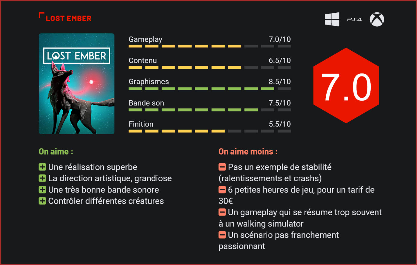 Première création d’un tout petit studio indépendant allemand, Lost Ember était parvenu à susciter l’enthousiasme des gamers dès sa première bande-annonce. Projet ambitieux mené par un tout petit studio allemand, Lost Ember se situe à mi-chemin entre un “walking-simulator” et un Breath of the Wild, duquel il s’inspire pour sa direction artistique, son univers coloré et sa prise en main dynamique. Le jeu du petit studio allemand Mooneye propose d’incarner l’esprit d’un ancien chef de tribu qui n’a pas pu prendre son envol vers l’au-delà après sa mort et s’est réincarné en loup. Avec l’aide d’un autre esprit qui l’accompagnera dans un voyage initiatique, notre héros découvrira comment il en est arrivé là. La direction artistique du jeu est superbe. Dans Lost Ember, le joueur découvrira un monde unique, dans lequel la nature a repris ses droits après la disparition de l’espèce dominante. Si le background est léger, le joueur en apprendra davantage sur cet univers et l’histoire du personnage central en traversant les superbes décors du jeu. Malgré les apparences, Lost Ember n’est pas un jeu d’aventure dans la continuité d’un Breath of the Wild. Il s’agit en réalité d’une sorte de walking-simulator assez dirigiste. La plupart du temps, on avance en ligne droite, sans réellement se préoccuper d’explorer dans les moindres recoins les décors. Le jeu est très simple d’accès mais pas pour autant inintéressant. Tout d’abord, parce que la créature que l’on contrôle, une sorte de loup, est très agréable à diriger. Elle se déplace rapidement et bondit telle une tigresse. Le joueur n’est de surcroit pas limité à cette unique créature puisqu’il pourra prendre le contrôle de tous les animaux croisés dans le jeu, des rongeurs aux poissons en passant par les oiseaux et mammifères. Chaque créature se contrôle différemment. Passer de l’une à l’autre sera d’ailleurs indispensable pour progresser puisque les niveaux vous forceront à traverser lacs, grottes, tunnels et canyons. Il est possible d’incarner de nombreuses créatures différentes. Dynamique, le gameplay de Lost Ember permet au joueur d’expérimenter sans cesse de nouvelles expériences, en passant d’une créature à l’autre. La progression dans le jeu reste toutefois très dirigiste et contemplative… Car il n’y a pas grand chose à faire dans ce magnifique univers. La plupart du temps, on se contente d’aller d’un point A à un point B puis d’activer une cinématique, pour reprendre son chemin ensuite. Pas de combats ni d’énigmes à l’horizon. Et c’est finalement ce qui hurte le plus ce sympathique jeu d’aventure, qui aurait gagné à proposer davantage qu’une simple promenade contemplative. Il faut le reconnaître toutefois, visuellement, le jeu est superbe avec ses environnements grandioses. La direction artistique, très inspirée, lorgne gentiment du côté d’un Breath of the Wild. La musique et les excellents doublages immergent parfaitement le joueur dans cet univers charmant, qui ne demande qu’à être exploré. Vous pourrez même incarner des poissons. Vu sa réalisation et ses qualités, il fallait s’attendre à un prix de vente relativement élevé. Il faudra de ce fait débourser 30€ pour faire l’acquisition du jeu. Et malheureusement, l’heure de jeu se paye cher puisqu’il ne faudra pas plus de 6h pour faire le tour de ce que Lost Ember a à proposer… On reprochera également au titre de Mooneye ses nombreux bugs, crashs et ralentissements qui affectent forcément l’immersion dans son univers. Il se peut toutefois que le studio allemand corrige ces petits défauts par le biais de mises à jour. Conclusion Visuellement superbe, Lost Ember est un jeu d’aventure qui montre un énorme potentiel mais dont le gameplay se résume trop souvent à une longue promenade contemplative. A mi-chemin entre un Breath of the Wild et un Walking Simulator, Lost Ember offre toutefois une expérience de jeu unique en permettant au joueur d’incarner de nombreuses espèces animales, qui lui permettront d’explorer ses superbes environnements. Pas de combats ni d’énigmes à l’horizon toutefois pour cette expérience contemplative, qui se boucle en moins de 6h et est maladroitement vendue au prix fort (30€ tout de même). Si son gameplay est réussi, on regrette amèrement le manque d’action et on finit très vite par s’ennuyer malgré l’émerveillement que parvient à créer le jeu à chaque fois que l’on découvre une nouvelle créature.