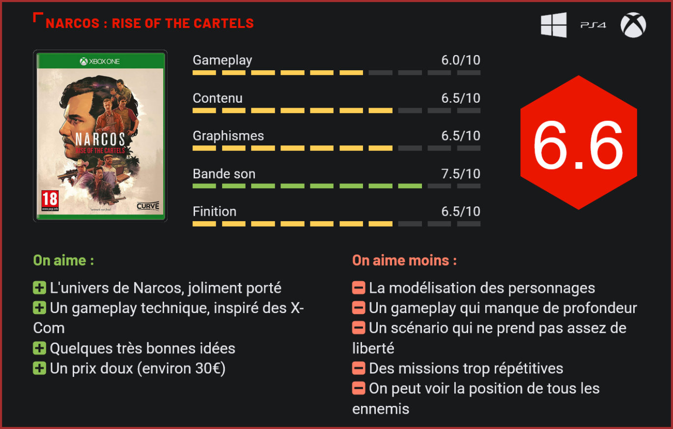 Après Stranger Things et en attendant Dark Crystal, c’est au tour d’une autre série culte de Netflix d’être portée en jeu vidéo avec Narcos : Rise of the Cartels. Confié à Curve Digital, ce portage n’aura décidément pas beaucoup fait parler de lui jusqu’à sa sortie – un élément qui trahit très souvent une qualité médiocre. Le résultat est pourtant plutôt séduisant pour un jeu à tout petit budget. Narcos s’inspire en grande partie de X-Com pour son gameplay. Les développeurs de Curve Digital ont eu l’excellente idée de X-Com pour ce jeu de guerre tactique au tour par tour, qui propose d’incarner au choix narcotrafiquants et force de l’ordre à travers une série de missions ayant pour cadre les années 80 et la guerre entre la DEA et Pablo Escobar. Paradoxalement, si le concept se révèle très intéressant, le scénario du jeu n’apporte pas grand chose de neuf par rapport à celui de la série de Netflix. Le contexte très original de X-Com-like lui donne toutefois un certain cachet. Car ici vous ne combattrez pas des aliens dans des vaisseaux spatiaux ou des complexes militaires mais des membres de cartels et agents de la DEA dans des environnements réels, des rues d’une petite bourgade colombienne aux demeures luxueuses des cartels. L’univers de Narcos est plutôt bien représenté. L’immersion dans l’univers de Narcos est également excellente avec des séquences tirées des films, la bande son officielle, des bruitages et doublages de très bonne facture et quelques cinématiques relativement efficaces. On reprochera toutefois à l’ensemble de ne pas beaucoup s’écarter du cadre posé par la série… Narcos ajoute une petite touche de fraîcheur en permettant au joueur d’incarner les agents sur le terrain. Côté prise en main, on se rapproche très fort de X-Com, avec toutefois quelques features inédites, comme la possibilité de passer en vue à la troisième personne pour incarner directement un agent sur le terrain et canarder joyeusement un ennemi. L’idée n’est pas mauvaise en soi, même si elle n’apporte au final pas grand chose aux rouages du gameplay. Comme dans X-Com, les combats se jouent au tour par tour. A chaque tour, le joueur décide quelles unités déplacer, quelles actions leur ordonner et ou se positionner exactement. Plusieurs classes de personnages sont au programme, avec pour chacune des spécificités propres. Chaque équipe est composée de 5 unités, que le joueur pourra choisir selon ses préférences. On retrouve des unités de destruction, lourdement armées, des assaillants lourds, des combattants légers, des unités très mobiles et des unités de soutien. Tout le gameplay de Narcos repose sur la combinaison de ces différentes troupes et leur déploiement sur le terrain. La limite de 5 unités par équipe réduit toutefois le champ des possibles. A ce titre, on pourra reprocher à Narcos de ne guère avoir la profondeur et la richesse d’un X-Com. Passé le cap des 8h de jeu, on commence vite à tourner en rond, là où un jeu comme X-Com permettait justement de dépasser largement la centaine d’heures de jeu sans avoir ce sentiment de répétitivité. Si différents objectifs viennent ponctuer la mission – de la récupération d’un document au placement d’un mouchard, l’action se réduit la majorité du temps à des affrontements dans les rues. On reprochera là aussi au jeu sa trop grande accessibilité. Contrairement à un X-Com, le joueur voit en permanence la position de ses ennemis et n’est jamais vraiment surpris par le déroulement de la mission. Très vite, on a également le sentiment de jouer les mêmes missions. Visuellement, le jeu est plutôt joli. C’est d’autant plus dommage que visuellement, le jeu est plutôt réussi avec ses décors naturels détaillés. Lorsqu’on zoome, on remarque vite les limites du moteur graphique, avec des modélisations des personnages assez simplistes. Mais de loin, les visuels sont plutôt jolis – et très colorés. Pour un jeu à petit budget, Narcos s’en sort donc globalement très bien. C’est bien sur la durée qu’il montre ses limites. Son gameplay un peu trop simplifié poussera la plupart des joueurs à lâcher leur pad avant le cap de la dizaine d’heures de jeu passé. Vu son prix réduit (environ 30€), ce n’est toutefois pas vraiment un drame. Conclusion On ne s’attendait pas franchement au jeu de l’année et il faut bien l’avouer, pour un jeu à tout petit budget vendu de surcroit à un tarif très compétitif, Narcos est plutôt une bonne surprise. Curve Digital nous livre un jeu de guerre tactique dans la lignée des X-Com, plutôt fun et fidèle à l’univers de Narcos, qui montre toutefois vite ses limites au niveau du gameplay et ne se montre pas aussi riche en contenu que son modèle. Plutôt joli, fidèle à la série de Netflix et divertissant, Narcos devrait largement satisfaire les fans de la franchise qui rêvaient d’en découvrir davantage sur l’univers de la série – et ce d’autant plus qu’il nous propose de découvrir le scénario des deux points de vue très différents, avec d’un côté les forces de la DEA et de l’autre les membres du cartel.