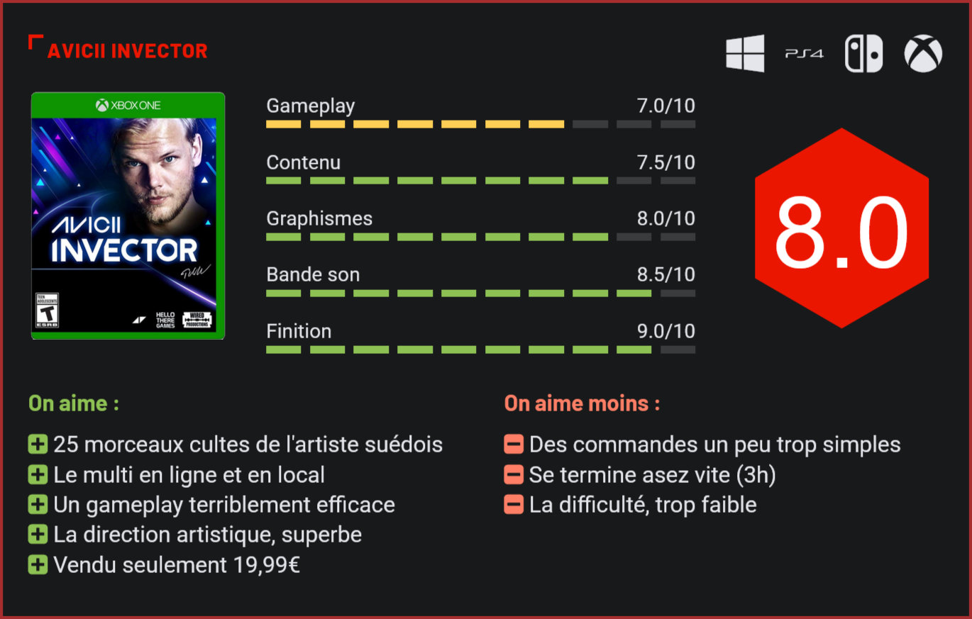 Après une sortie anticipée sur PS4, Invector revient sur tous les supports avec une version enrichie en contenu qui montre enfin tout le potentiel du jeu créé par le DJ Avicii. L’artiste suédois Tim Bergling, plus connu sous son nom d’artiste Avicii, avait mis fin à ses jours en 2018, lors d’un court séjour au royaume d’Oman. L’artiste, auteur de multiples tubes électro, aurait – selon ses proches – été victime d’une trop grosse pression, qui l’aurait conduit au suicide. Avant de mourir, Avicii avait toutefois collaboré à la création d’un jeu baptisé Invector. Le titre était sorti en exclusivité sur PS4 en 2017 et n’avait pas remporté un franc succès. 2 ans plus tard, le studio de développement nous livre une version enrichie en contenu de son jeu, transformé en un vibrant hommage à la carrière de l’artiste. Le jeu permet de jouer jusqu’à 4 en split-screen. Et cette fois, plus personne ne sera privé de cet excellent titre puisque le jeu débarque sur tous les supports. Le concept reste le même qu’en 2017. A mi-chemin entre un Thumper et un Guitar Hero, le jeu propose de contrôler un vaisseau spatial sur la playlist de l’artiste. Avicii Invector reprend pratiquement à l’identique la prise en main d’un Guitar Hero : le joueur devra appuyer en rythme sur les touches qui progressent dans sa direction et se diriger dans les bonnes directions lorsqu’une flèche apparaît à l’écran. Les séquences rythmiques sont entrecoupées de moments plus calmes durant lesquels le vaisseau quitte le tracé pour donner plus de liberté de mouvement au joueur. Pour marquer des points supplémentaires, le joueur devra tenter de faire passer le vaisseau par les anneaux qui apparaissent à l’écran durant ces phases de jeu. Si le gameplay du jeu est très simple, il se révèle également très efficace. On prend un pied formidable à marteler les boutons en rythme sur les plus grands morceaux d’Avicii, en se remémorant la formidable ascension de l’artiste. Au total, ce sont pas moins de 25 morceaux qui sont de la partie, dont les plus grands hits de l’artiste, “Hey Brother” et “Wake me up”. Visuellement, le jeu est très coloré. Malgré la simplicité des commandes et la répétitivité du jeu, on se surprend à enchainer les morceaux jusqu’à voir le bout de la playlist, après 3 petites heures de jeu. Si le jeu est court, on y reviendra toutefois volontiers à plusieurs. Les développeurs ont songé à intégrer un mode multijoueur très efficace, jouable jusqu’à 4 en ligne et en split-screen. Malgré la nervosité des commandes et la rapidité des morceaux, le titre reste très fluide, même à quatre joueurs. A ce sujet, on soulignera l’efficacité du jeu pour animer une soirée entre amis. Avicii Invector est vraiment un jeu très fun à plusieurs. Pour le reste, pas grand chose à redire : la direction artistique du titre est superbe, les effets visuels nous en mettent plein les yeux et on multipliera les “wow” tout au long de la playlist devant des amas de notes et des paysages mélancoliques. Alors certes, Invector se plie relativement rapidement mais son prix de vente très doux (19,99€) en fait un achat raisonné. Notre seul véritable regret concerne finalement la difficulté du jeu, assez faible. La plupart des morceaux pourront être bouclés d’une seule traite. Obtenir tous les rangs S demandera en revanche un certain doigté! Conclusion Un an après le décès du DJ suédois, Hello There Games rend un vibrant hommage à l’oeuvre d’Avicii, avec un jeu de course rythmique terriblement fun, idéal pour animer des soirées entre amis avec son mode multijoueurs en split-screen. Sa playlist de 25 titres vous fera redécouvrir la formidable ascension de l’artiste de façon ludique, en tapant en rythme sur les boutons qui s’affichent à l’écran. Le concept, directement hérité d’un Guitar Hero, fonctionne à merveille malgré la simplicité des commandes. Si on lui reprochera sa trop grande accessibilité, Avicii Invector n’en reste pas moins un jeu rythmique terriblement efficace, beau et généreux en contenu avec ses 25 morceaux légendaires, son mode multi en ligne et son multijoueurs en écran partagé. A 19,99€, il s’agit incontestablement d’une très bonne affaire, et d’une très belle façon pour les fans du DJ de saluer une dernière fois ce très grand homme.