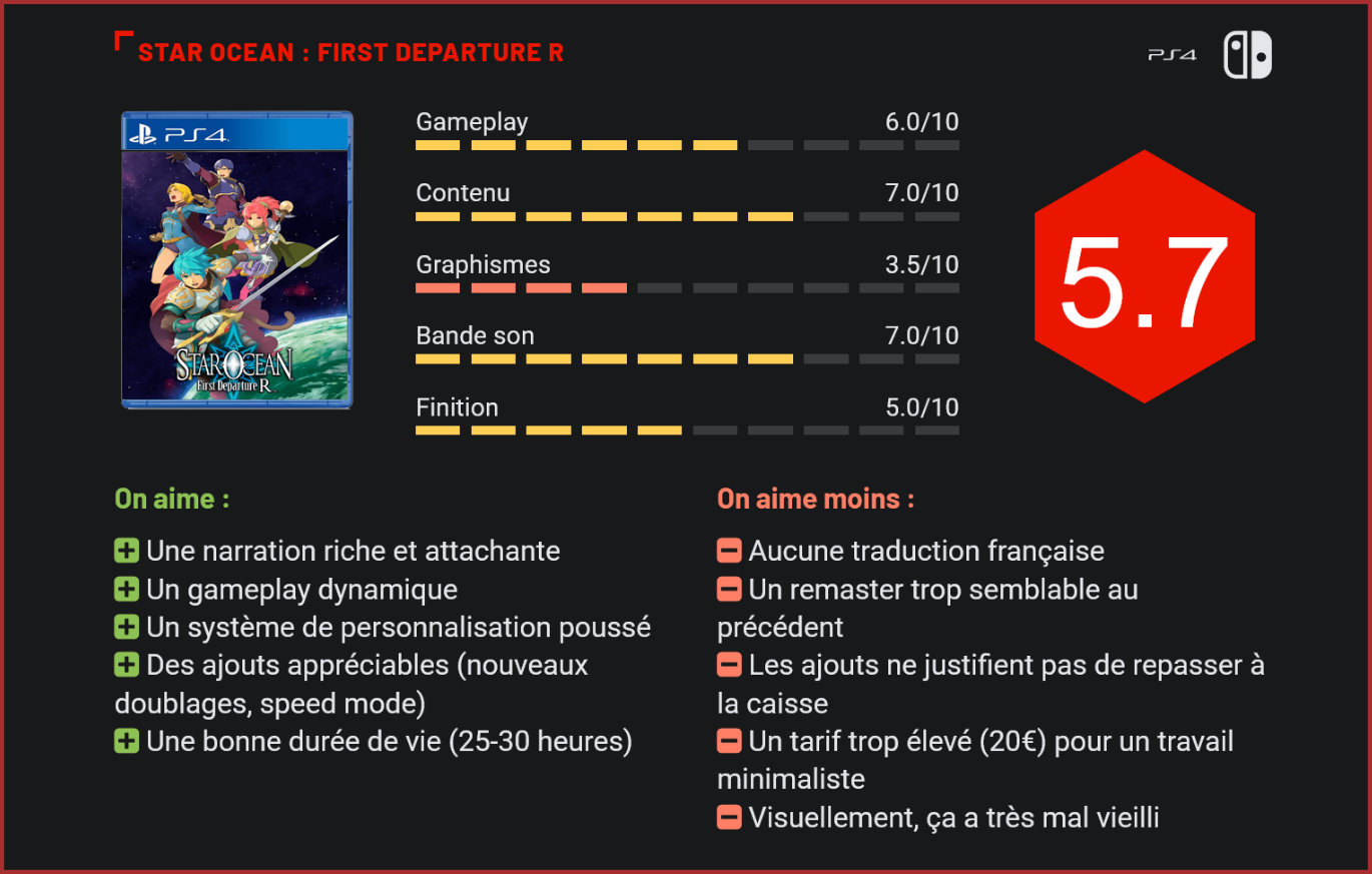 Square Enix continue sur sa lancée des remaster avec le retour du premier épisode de Star Ocean. L’occasion pour l’Occident de (re)découvrir ce JRPG qui avait marqué les joueurs japonais à l’époque. Il est vrai que cette année, Square Enix s’est montré particulièrement productif en matière de remasters. Après Collection of Mana et Romancing SaGa 3, nous avons droit au retour de Star Ocean avec First Departure R. Un choix étonnant de la part de l’éditeur étant donné que le dernier volet Star Ocean : Intergrity and Faithlessness sorti en 2016 avait été un véritable échec. De plus, le second volet de la saga avait davantage marqué les joueurs que le premier épisode, pourquoi ne pas remasteriser celui-ci ? À moins que Square Enix pose les bases pour un renouveau de la saga ? Autre élément étonnant, le premier épisode de Star Ocean sorti en 1996 au Japon avait déjà eu droit à remaster en 2008, sur PlayStation Portable. Et lorsqu’on se penche sur ce nouveau remaster, on n’en comprend pas forcément l’intérêt. Une narration prenante et attachante On se laisse attendrir par l’univers du jeu et porter par le scénario de Star Ocean : First Departure R. Star Ocean : First Departure R nous plonge dans un univers à la croisée des mondes ; l’un est futuriste, l’autre est plutôt médiéval fantastique. Suite à un fléau qui s’abat sur leur planète, une équipe de gardiens vont partir en quête d’un remède. Rapidement, ces derniers vont se rendre compte que l’origine du fléau n’est pas naturelle. Ils vont alors embarquer dans une aventure mêlant magie et technologie et affronter de nombreux ennemis. Second remaster ou non, le matériau scénaristique de base reste encore aujourd’hui plaisant. La narration au sein de Star Ocean : First Departure R est riche et tient la route, malgré un nombre important de rebondissements et de personnages. On se laisse porter par l’univers et la mission menée par Roddick et Millie. Un nombre important de personnages à incarner Le joueur dispose d’un large choix de personnages pour constituer son équipe de guerriers. La richesse du jeu tient également dans le large choix de personnages à engager dans sa petite troupe. Au nombre de 13, ces personnages apporteront avec eux toute leur personnalité, mais joueront aussi un rôle important dans certaines situations. Aspect qui poussera certains joueurs à relancer une partie et à modifier son équipe afin de découvrir de nouveaux enchaînements et de finalités à l’aventure de Star Ocean. Le choix des membres de notre équipe sera en réalité influencé par la manière dont le joueur oriente les dialogues et noue des relations avec tel ou tel membre de son équipe. Au cours des Private Actions, le joueur pourra aller vers ses coéquipiers afin d’apprendre à la connaitre davantage. En fonction des choix faits durant ces scènes, vous vous rapprocherez plus de tel ou tel personnage. Et cela aura une influence sur le déroulement de l’aventure. Les développeurs ont mis tout en œuvre pour proposer une important rejouabilité. Ces aspects sont très plaisants et permettent d’impliquer le joueur dans l’aventure de manière active. Des combats dynamiques Le jeu propose des combats dynamiques, ainsi que des techniques de combat riches qui se diversifieront au fil de la progression. Étant donné qu’il s’agit d’un remaster, on retrouve forcément des caractéristiques des jeux vidéo japonais des années 90. Ainsi, en se baladant hors des villes, le joueur peut se faire happer par des monstres – invisibles sur la carte – et se retrouver téléporté dans une arène. Les combats se font en temps réel, on peut aller à la confrontation directement, sans passer par la sélection d’une attaque ou autre – même si cela est possible. Lors des combats, la dimension de la distance est importante puisque les personnages ne sont pas statiques et peuvent se déplacer pour aller taper les ennemis. Un aspect qui tranche avec les JRPG d’antan. Cela rend les combats dynamiques et satisfaisants, même si on regrette l’impossibilité de pouvoir cibler un ennemi en particulier. Il est courant de frapper à côté parce que celui-ci bouge ou autre. Il aurait été intéressant d’intégrer cet aspect dans ce remaster. Une personnalisation poussée de l’aventure Les personnages disposent d’attaques magiques efficaces. Le jeu laisse une grande place à la personnalisation du joueur. Celui-ci peut choisir la formation de son équipe, contrôler tel ou tel héros, mais aussi paramétrer des attaques magiques ou autres techniques de combats. La spécialisation des personnages est poussée à l’extrême dans le jeu ; outre les specials arts et la magie, chaque personnage peut se spécialiser dans un « skill » qui lui permettra d’améliorer certaines statistiques et compétences. Celles-ci seront utiles lors des combats, mais pas que puisque certains personnages pourront reconnaître des objets inconnus ou customiser des armes. On est face à un jeu vidéo conséquent avec de nombreuses facettes. Difficile de ne pas voir des similitudes avec la série des jeux vidéo Tales Of, notamment les déplacements libres durant les combats. Un point qui s’explique assez facilement puisque le studio à l’origine de Star Ocean compte parmi ses rangs plusieurs anciens développeurs de Tales of Phantasia. Du point de vue gameplay et expérience vidéoludique, Star Ocean : First Departure R ressemble à s’y méprendre à la version de 2008. On n’a pas l’impression que quelque chose a été revu ou corrigé à ce niveau. Un remaster qu’on n’explique pas Le contraste entre les phases de cinématiques et de gameplay est particulier. En réalité, tout l’intérêt du remaster repose sur des détails graphique et sonore. En effet, le jeu s’offre une nouvelle traduction japonaise et il est possible de jongler entre les trois doublages du