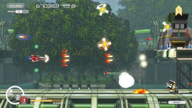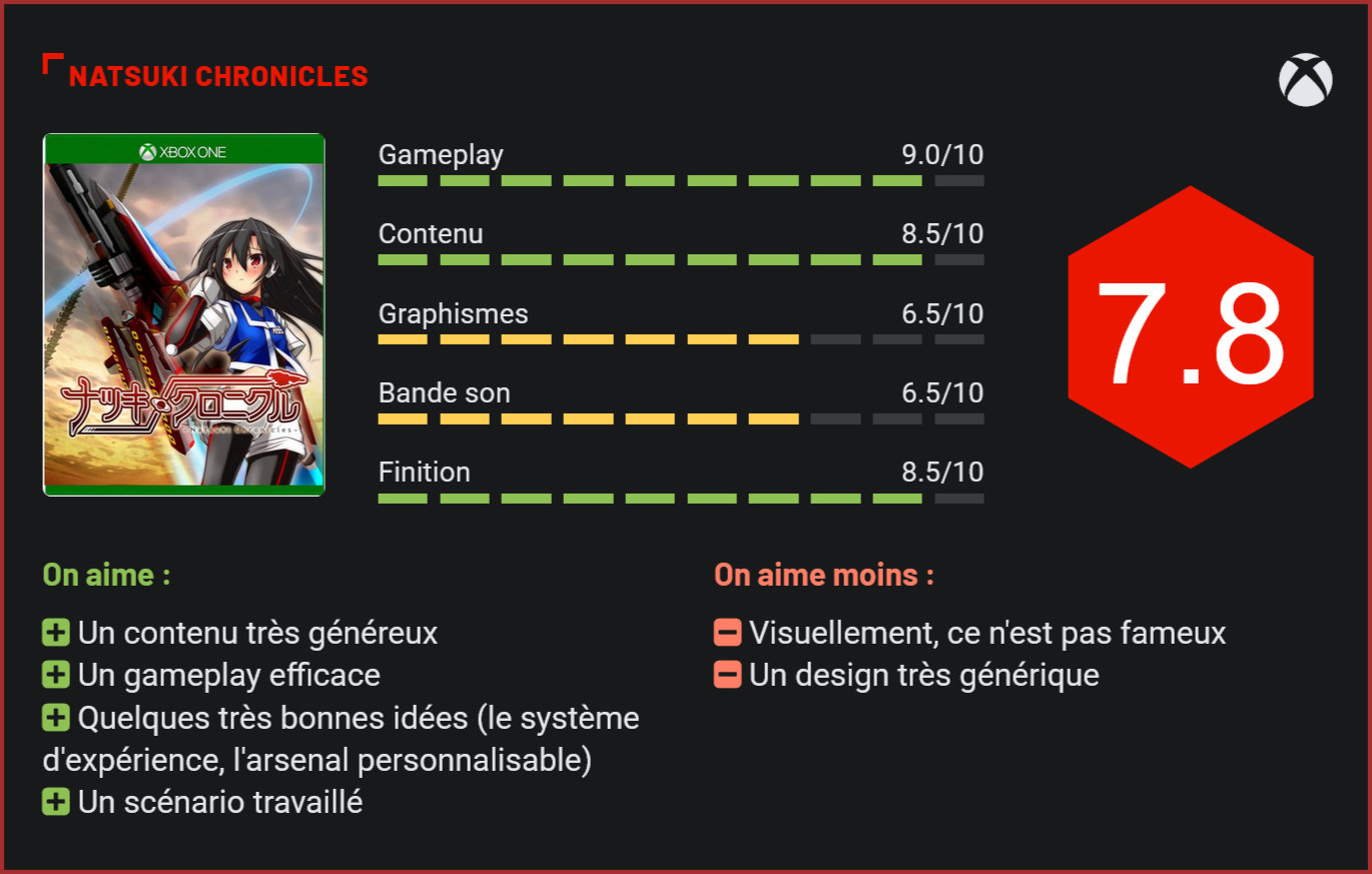 En développement depuis près de 5 ans, le nouveau jeu du studio japonais Qute modernise un genre qui n’avait que très peu évolué ces dernières années. Si la Xbox 360 avait brièvement redonné vie aux shoot them up à l’ancienne, la dernière génération de consoles n’avait accueilli qu’un nombre très limité de revivals. Le studio japonais Qute, auteur des sympathiques Ginga Force et Eschatos sur Xbox 360, livre sa première production sur les consoles de dernière génération avec Natsuki Chronicles, un nouveau shoot them up en 3D qui tente d’introduire quelques nouvelles idées innovantes… Dans Natsuki Chronicles, le joueur peut entièrement personnaliser son arsenal. En développement durant près de cinq années, Natsuki Chronicles était devenu l’une des plus belles arlésiennes du jeu vidéo. Le nouveau titre des créateurs d’Eschatos débarque aujourd’hui un peu par surprise sur le Xbox Store, à un tarif qui fera sans doute tiquer de nombreux joueurs puisqu’il faudra débourser pas moins de 42,49€ pour en faire l’acquisition. Un tarif qui se justifie toutefois pleinement au vu du contenu très généreux du jeu et du genre, qui s’adresse à un public de niche. Et il faut bien l’admettre, si Natsuki Chronicles n’est pas une claque graphique, le jeu de Qute introduit quelques très bonnes idées. Côté gameplay, on se retrouve face à un shoot them up horizontal au déroulement plutôt classique. Le joueur doit survivre à des vagues d’ennemis en engrangeant un maximum de points. L’originalité du jeu vient de son système de progression unique, basé sur l’expérience acquise en cours de partie. Dans chaque partie, le joueur gagnera des points d’expérience qui permettront de débloquer de nouvelles armes principales, secondaires et spéciales mais également de débloquer des vies supplémentaires. Grâce à ce système, il ne faudra plus recommancer à zéro le jeu en cas de game over. Juste le niveau, avec, très régulièrement, de nouvelles vies supplémentaires. Vous pourrez en cumuler jusqu’à 15 – si vous êtes vraiment très mauvais. Car en moyen, la plupart des niveaux se terminent du premier ou du deuxième coup. Lors des combats de boss, vous affronterez des ennemis titanesques. La dimension RPG du jeu, avec son système d’expérience, lui donne une réelle profondeur, tout en le rendant beaucoup plus accessible qu’un schmup de Cave par exemple. Car ici, vous pourrez choisir vos combinaisons d’armes parmi un large arsenal. Et c’est ce qui fait toute la richesse du jeu dans les modes de difficulté plus élevés. Combiner des grenades à un bouclier antimissile et des tirs latéraux permettra d’adopter une stratégie davantage axée sur la défense. Les plus téméraires opteront pour des combinaisons plus agressives. On notera au passage que dans ce jeu, les ennemis peuvent arriver de tous les côtés, par devant comme par derrière. Il est donc important de choisir avec précaution son arsenal. Dans la pratique, Natsuki Chronicles se montre étonnamment technique. Il faudra parfois recommencer un même niveau plusieurs fois avant de trouver le bonne combinaison d’armes pour le boûcler. Comme il est de tradition, chaque niveau se termine par un boss, d’allure titanesque. Si ce sont ces derniers qui se montrent les plus intéressants, de par leur complexité, le déroulement des missions n’en reste pas moins très intéressants. Le jeu se révèle également étonnamment généreux en contenu, avec sa dizaine de missions (plus du double de ce qu’on a l’habitude de trouver dans un shoot them up!), ses nombreuses combinaisons d’armes, son mode arcade très fun et ses nombreux niveaux de difficulté. Le boûcler une première fois ne devrait pas vous prendre plus de 4h en ligne droite. Pour en faire le tour complètement, il faudra compter entre 10 et 20h – l’achat est donc largement rentabilisé sur la durée. A la fois très accessible et technique, Natsuki Chronicles parviendra sans doute à séduire aussi bien les vrais amateurs de shoot them up que les joueurs débutants et à ce titre, le jeu de Qute est plutôt une belle réussite. Les développeurs de Ginga Force sont parvenus à un joli tour de force en osant intégrer des fonctionnalités innovantes à leur jeu, avec un système d’expérience inspiré des RPG, des combinaisons d’armes innovantes et des affrontements très stratégiques avec des ennemis qui apparaissent partout à l’écran. On admire également la volonté du studio de vouloir nous proposer un jeu au scénario plus travaillé que d’accoutumée – le genre n’étant pas le plus adapté aux envolées lyriques. Le résultat est là aussi plutôt convaincant. Malheureusement, c’est au niveau de la direction artistique et de l’univers – sous-exploité – que le bas blesse. Visuellement, le jeu est plutôt joli, mais il est loin d’exploiter les capacités de la console et surtout a l’apparence d’un shoot them up très générique. Face à un Mushihimesama Futari, un Caladrius ou un Castle of Shikigami, Natsuki Chronicles peine à développer une identité visuelle qui lui est propre. Les décors manquent cruellement de profondeur et l’univers de charme. Et c’est très probablement le seul vrai défaut d’un jeu réellement très bien pensé, mais qui ne parvient jamais réellement à éblouir au niveau de sa réalisation. Même constat malheureusement au niveau de la bande son, sympathique et plutôt efficace, mais en aucun cas grandiose. Aussitôt le jeu terminé, vous aurez déjà oublié la plupart des morceaux. Et c’est bien là tout le problème car si dans le fond Natsuki Chronicles est un excellent shoot them up, il lui manque ce petit quelque chose qui lui aurait permis de s’imposer comme un incontournable. Conclusion Après 5 longues années de développement, le studio nippon Qute nous livre l’un des meilleurs shoot them up de cet