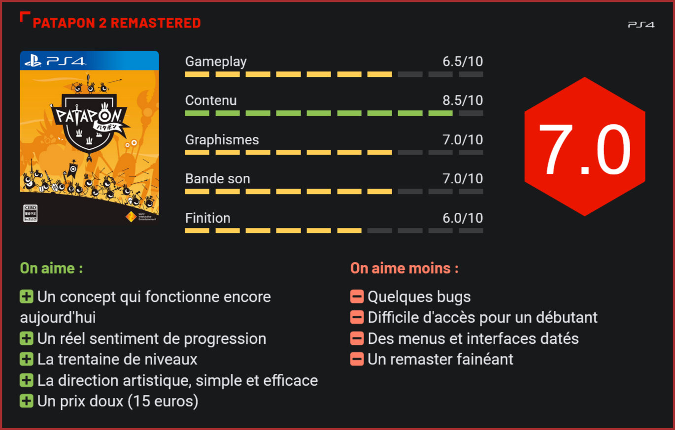 Exclusivité PlayStation, le second volet de Patapon sorti sur PSP en 2009 fait son grand retour sur la dernière génération de console du constructeur japonais. Un retour totalement inattendu qui fera le bonheur des fans de la franchise. Certains propriétaires de PlayStation Portable ont eu la chance d’explorer l’univers si particulier des Patatons, ces petits bonshommes avec leur globe unique. Si le jeu vous avait occupé durant de longues heures à l’époque, son grand retour surprise sur PS4 devrait vous plaire. Patapon premier du nom avait lui aussi eu droit à un remaster sur PS4 en 2018, réussi quoique fainéant. À la recherche d’un foyer Une histoire simple, mais efficace Suite à un naufrage, les Patapons se retrouvent éparpillés sur une île habitée. Les petits bonshommes mono-œil vont devoir arpenter cette terre inconnue pour trouver un nouveau lieu pour y dresser leur camp, récupérer les Patapons égarés et repousser les indigènes locaux. En tant que divinité, le joueur contrôle les petits bonshommes durant leur périple, sur le rythme des tambours de guerre. Un concept qui fonctionne toujours Un concept de gameplay qui fonctionne toujours. En tant que jeu de rythme, Patapon 2 Remastered ne peut pas véritablement tenir tête à des jeux plus techniques. Pourtant, le titre du studio Pyramid place tout de même la barre haut. Tout repose ici sur le rythme, ainsi que sur une certaine mémorisation, mais Patapon 2 Remastered mélange également des aspects de jeux d’action et de plateformes. Il n’est pas simplement question de jouer avec le rythme, le jeu se veut plus aventureux. Ainsi, pour avancer, le joueur devra appuyer sur 4 touches en suivant le tempo – carré, carré, carré rond ou Pata Pata Pata Pon (vous l’avez en tête ?). La recette est la même pour attaquer ou pour se protéger. Les possibilités sont assez limitées, d’autant que les petits bonshommes ont parfois du mal à suivre nos ordres – comment ça on n’a pas le rythme ?! Après avoir passé laborieusement la démo – qui repasse en boucle si jamais vous ne parvenez pas à avoir les bons réflexes –, les choses semblent étrangement plus faciles. On prend un intense plaisir à faire avancer notre petite troupe dans les différents niveaux, une trentaine au total, que ça soit pou récupérer des acolytes, pour repousser ou chasser les animaux, indigènes et autres menaces qui leur font face. On a vraiment l’impression d’avancer dans le jeu. En fonction des talents rythmiques de chacun, la durée de vie du jeu sera plus ou moins longue. Enfin, le joueur devra faire preuve de stratégie pour venir à bout de ses ennemis au risque de voir ses petits bonshommes anéantis. Le joueur devra équiper ses Patapons pour les rendre résistants et efficaces, mais aussi former ses rangs d’une certaine manière en fonction des obstacles. Sous ses airs simplistes, Patapon 2 Remastered offre une expérience de jeu assez conséquente, pour un prix très correct puisqu’il ne faudra pas débourser plus d’une dizaine d’euros pour mettre la main dessus. Un univers charmant Les graphismes ont été modernisés. La première chose qui choque quand on lance Pataton 2 Remastered, c’est la qualité visuelle du jeu. S’il s’agit d’un remaster, on a l’impression de se retrouver en réalité en face d’un simple portage du jeu PSP. Les écritures ne sont pas intégrées à l’image, ce qui les rend parfois illisibles, les animations ne sont pas non plus très d’actualité et les interfaces et autres menus auraient clairement mérité un petit lifting. Visuellement, le jeu a été affiné mais le travail reste minimaliste. Heureusement, cette première impression se dissipe lorsqu’on se lance effectivement dans l’aventure. Si les menus sont datés, le jeu en tant que tel se révèle plutôt agréable à l’oeil. On se laisse porter par l’univers 2D dépeint dans le jeu. La direction artistique, bien que simpliste, fonctionne toujours. Les niveaux prennent un certain temps à se renouveler, mais se différencient assez bien. On a vraiment l’impression d’avancer dans l’histoire et de découvrir de nouveaux environnements. Pour ce qui est de l’ambiance sonore, en tant que jeu de rythme, le jeu s’en sort parfaitement, même si le tout est particulièrement simpliste. Les mélodies restent – malheureusement – longtemps en tête. Quant aux animations des personnages, on a difficilement de quoi critiquer. La recette fonctionne toujours aussi bien. Même si on essaye de toutes nos forces de ne pas apprécier le jeu – la version sur PSP a laissé quelques cicatrices –, on se laisse embarquer par l’univers du jeu. Conclusion Onze ans après être sorti sur PSP, Patapon 2 revient sur PS4 dans une version remastérisée. Si le jeu est toujours une petite pépite, le travail de remasterisation est resté très minimaliste, pour ne pas dire carrément fainéant. L’interface a très mal vieilli et le jeu pique aux yeux, malgré sa jolie direction artistique. Fort heureusement pour lui, Patapon 2 reste un jeu totalement atypique. A mi-chemin entre le jeu de rythme, d’action et de plates-formes, Patapon 2mettra les nerfs des joueurs à rude épreuve avec ses affrontements rhytmés. Vendu une quinzaine d’euros, le titre devrait aisément séduire les amateurs de drôleries qui étaient passés à côté de ce jeu à part.