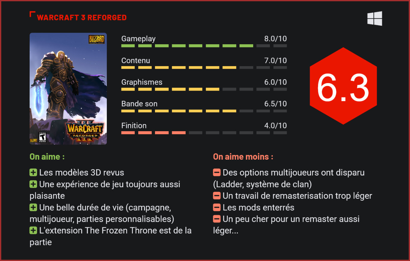Après avoir ressorti World of Warcraft premier du nom, Blizzard s’est lancé dans le remaster d’un autre de ses titres cultes ; Warcraft 3 : Reign of Chaos, un jeu de stratégie en temps réel qui était parvenu à séduire un large public à sa sortie en 2002. Avant de s’illustrer dans le merveilleux monde des MMORPG, Warcraft était avant tout une série de jeux de stratégie. Le troisième volet de la saga Warcraft avait marqué un tournant dans la série déjà fort appréciée. Warcraft 3 : Reign of Chaos apportait de nombreuses nouveautés qui ont largement enrichi l’expérience de jeu, faisant de lui un incontournable du genre, à l’époque. Avec cet épisode, Blizzard intégrait de nouvelles races de personnages, les Elfes de la nuit et les Morts-vivants et revoyait entièrement le moteur du jeu, qui passait à la 3D. Mais Warcraft 3 introduisait surtout un système de héros inspiré des jeux de rôles. Le joueur faisait évoluer ses troupes mais devait également veiller à utiliser les talents de ses héros pour remporter la partie. À la sortie du jeu, les critiques sont particulièrement enthousiastes, tant du côté des journalistes que des joueurs, et les souvenirs qu’en a gardé la communauté de gamers sont toujours aussi positifs. De quoi pousser Blizzard à nous livrer un remaster. Un univers qui n’a pas pris une ride L’univers est toujours aussi plaisant et riche. Warcraft 3 Reforged nous plonge au cœur d’Azeroth, un monde médiéval fantastique envahi par les Orcs dans les précédents volets de la série. Les Humains et eux se livraient à une énième bataille lorsqu’une nouvelle menace est apparue dans le ciel. La campagne se découpe en 9 chapitres ; les 5 originaux avec le premier servant de tutoriel et les 4 de l’extension The Frozen Throne sortie en 2003. Chaque campagne permet de réaliser des dizaines de missions qui vous apprendront à gérer au mieux les mécanismes de jeu de Warcraft 3 Reforged, tout en nous plongeant dans l’histoire du jeu. Les 4 premières campagnes mettent le joueur à la tête d’une race de personnage ce qui lui permet de se familiariser avec chacune d’entre elles. À noter que tous les chapitres sont liés les uns aux autres. Si certains joueurs préfèrent se lancer à corps perdu dans le multijoueur, les campagnes sont tout de même un excellent moyen d’appréhender les mécanismes de jeu et d’affiner ses stratégies. La progression dans la campagne est fun et prenante. Le jeu nous plonge donc au cœur des différentes tensions qui lient les 4 races qui peuplent Azeroth. On y découvre le destin tragique de certains personnages, le retournement de veste d’autres, mais aussi plusieurs menaces qui viendront s’abattre sur nos héros. Le jeu livre une histoire tout aussi complexe et prenante que l’original qui rendra nostalgiques les joueurs de Reign of Chaos et qui captivera sans difficulté les nouveaux venus. Le scénario complexe du jeu se traduit assez bien au niveau du gameplay, proposant une multitude de missions qui vont de batailles épiques à la protection d’un camp. On se laisse embarquer par cette riche campagne. Et pour ceux qui ne s’inquiètent pas trop de l’histoire, les missions se révèlent assez consistantes pour les occuper. D’ailleurs, certaines d’entre elles ont été retravaillées ce qui apporte un peu de renouveau pour les vieux joueurs. Un RPS mythique Globalement, l’expérience de jeu est toujours aussi plaisante. Mais ne l’oublions pas, Warcraft 3 Reforged est un jeu de stratégie en temps réel qui intègre également des éléments RPG avec la présence de héros. Au lieu de diriger simplement ses unités, le joueur pourra passer un certain temps à faire progresser son héros. Celui-ci pourra apprendre de nouveaux sorts et de nouvelles compétences ce qui le rendra plus efficace. Chaque camp peut disposer de jusqu’à 3 héros et chaque race dispose de ses propres attaques et spécificités. Ainsi, le Paladin peut guérir ses équipiers, tandis que le Long-Voyant des Orcs lance des sorts. En massacrant des ennemis, le joueur pourra récupérer des pièces d’équipements, mais aussi des objets consommables. Warcraft 3 Reforged propose donc une double expérience de jeu, à la fois RPG et RTS, et ces dernières sont intrinsèquement liées puisque plus les héros seront forts, plus vous serez efficace au combat avec vos troupes. Pour ce qui est de l’aspect jeu de stratégie, on retrouve les bases du genre avec la collecte de ressources qui s’articule avant tout autour de l’or et du bois. On retrouve également la sphère construction dans ce TPS. Pour développer ses unités et sa puissance, le joueur devra mettre un point d’honneur à construire différents bâtiments utiles à la bataille. Chaque race de personnages disposera de ses propres bâtiments, mais aussi de ses différentes logiques pour ramasser du bois ou extraire de l’or. Par exemple, avec les Morts-vivants, il faudra préalablement hanter une caverne avant d’en extraire son précieux métal. Les Elfes de la nuit récoltent du bois en respectant la nature, etc. Au joueur de découvrir quelle race il préfère. Au fur et à mesure de vos constructions, vous pourrez agrandir vos bâtiments, ainsi que vos troupes histoire de le rendre plus efficace. Dix-huit ans après, la campagne se révèle au final tout aussi plaisante qu’à l’époque, et ce, même si presque rien n’a changé. Le matériau de base étant très bon, la petite cure de jouvence dont a profité Warcraft 3 ne lui a fait que du bien à ce niveau. Un multijoueur qui perd de sa richesse Le constat est moins positif du côté du multijoueur. En effet, celui-ci a perdu plusieurs éléments phares qui avaient fait le succès de l’original. Ainsi, on se retrouve face à un menu qui ne propose qu’un type de mode multijoueur ; la confrontation à 1 contre 1, 2 contre 2, et du chacun pour soi. Il n’est plus po