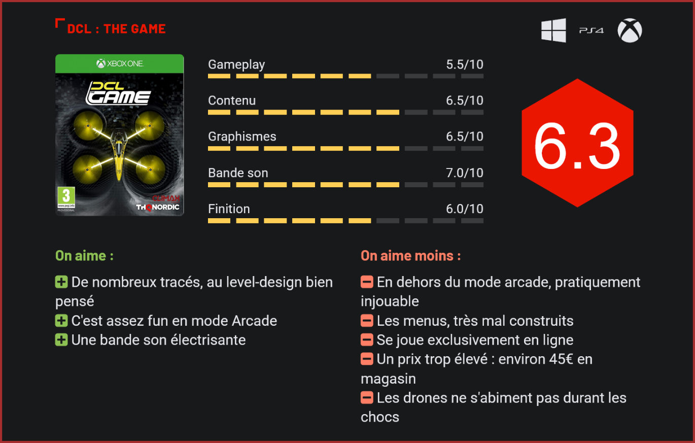 Drôle d’idée que celle de THQ Nordic et de Climax de nous proposer un jeu de courses de drones officiel. Et pourtant, le concept fonctionne plutôt bien… Les courses de drones ont la cote. Il existe aujourd’hui même une ligue officielle avec un championnat mondial, la DCL. Face à la déferlante de simulations en tous genres, THQ Nordic a voulu être le premier à se lancer dans une adaptation (risquée) de la discipline sous la forme d’un jeu vidéo. Et le résultat est étonnamment plutôt convaincant. Les décors sont plutôt variés et les tracés intelligemment construits. Porté par Climax, le studio britannique qui se cache notamment derrière les anciens Moto GP et qui s’est récemment spécialisé dans la réalité virtuelle, DCL The Game est un jeu à relativement budget qui tente – assez péniblement – de nous faire vivre l’intensité des compétitions de drones à travers le globe. Le premier contact est plutôt douloureux. Les menus sont mal fichus, les tutoriels se limitent à un renvoi vers le site officiel du jeu et à vrai dire, on a beaucoup de mal à saisir ce que l’on est présumé faire. D’entrée de jeu, on remarque qu’il existe plusieurs modes de contrôles : 3 ultra-élitistes, qui s’adressent aux “professionnels” de la course de drones, et un mode arcade beaucoup plus accessible. S’il est intéressant de découvrir comment se contrôle un drone dans la réalité, les 3 modes de jeu mentionnés sont simplement inaccessibles pour le commun des mortels. Le mode arcade a à l’inverse la fâcheuse tendance de trop simplifier le gameplay du jeu qui est réduit ici à une course sur un tracé. Si le jeu se révèle beaucoup plus accessible en mode arcade, il ne montre pas beaucoup de profondeur puisque le joueur contrôlera uniquement la vitesse et la direction du drone. Il ne devra jamais gérer son altitude. Second très gros défaut du jeu : ses modes de jeu ne font pas vraiment fantasmer. Il existe un mode libre pour tester la navigation manuelle, le time attack est sympa pour découvrir les différents tracés, on découvre des courses en multijoueurs en ligne et un mode défis, qui propose d’accomplir une succession de courses pour tenter d’obtenir le meilleur score face aux autres joueurs. Il n’y a toutefois aucun vrai mode carrière pour venir pimenter l’aventure. S’il existe une belle diversité dans les modes de jeu, l’absence de vrai mode solo, de surcroit accessible hors-ligne, lui fait cruellement défaut. Visuellement, c’est très correct, mais les décors manquent cruellement de détails. Au cours des parties, le joueur débloquera des crédits, qui lui permettront de personnaliser l’apparence de son drone. Assez paradoxalement, il n’existe toutefois aucune diversité au niveau des drones, qui sont tous les même au niveau des performances. Votre succès dans les courses dépendra donc de vos compétences de pilote et non pas des performances de votre drone. Un peu déstabilisant pour les débutants… Pour autant, et malgré tous ses défauts, DCL The Game n’en reste pas moins un titre agréable à parcourir et même étonnamment fun dès que l’on passe le cap des premiers tracés. Le level-design est ingénieux et les compétitions acharnées. La moindre erreur vous coûtera plusieurs places dans le classement. Rapide et nerveux, le jeu de Climax s’apparente finalement à une sorte de jeu de course futuriste, très efficace le temps de quelques parties, mais qui montre relativement vite ses limites en terme de gameplay. La réalisation du jeu est plutôt solide malgré son petit budget, avec ses musiques électrisantes, ses bruitages réussis, ses décors variés mais qui manquent de détails. Le jeu ne donne pas vraiment l’impression d’avoir été bâclé. Pour un premier essai, il s’agit même plutôt d’une belle réussite pour le studio de développement. On regrettera toutefois que malgré ses nombreux défauts, DCL The Game soit facturé aux alentours de 40€, un tarif qui reste trop élevé au vu du contenu proposé. La bonne nouvelle, c’est que compte tenu de sa direction très arcade, DCL The Game pourrait très bien séduire un public qui ne s’intéresse pas du tout aux courses de drones, en plus des fans de la discipline. Ce qui représente en soi déjà un petit exploit. Conclusion Le premier jeu de courses de drones officiel est plutôt une jolie réussite. Climax nous livre un jeu de course fun, décomplexé et plutôt joli, à la fois accessible au grand public et destiné aux fans purs et durs de la discipline. DCL The Game souffre toutefois de vilains petits défauts, de l’absence de vrai mode carrière et de tutoriels à ses menus laborieux et sa prise en main tantôt trop simple (en mode arcade), tantôt beaucoup trop complexe. Pour un premier essai, Climax s’en sort plutôt bien. A voir si le public y sera réceptif…