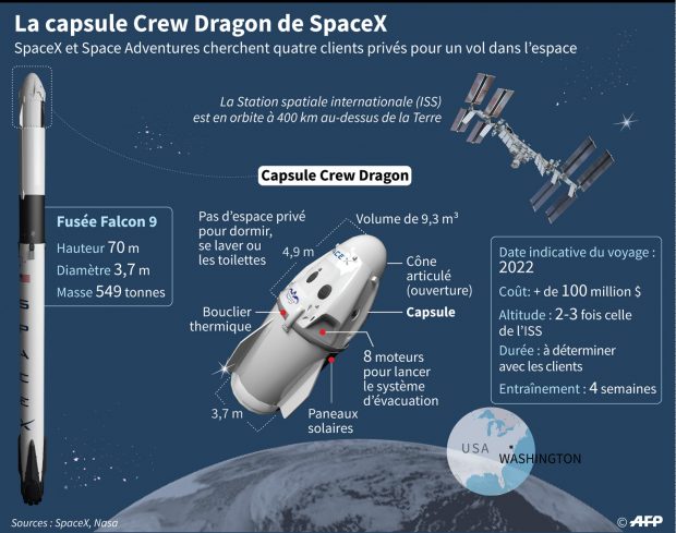 La compagnie spatiale américaine SpaceX a annoncé lundi un partenariat pour envoyer jusqu’à quatre clients privés dans l’espace d’ici 2022, une mission qui coûtera sans doute plus de 100 millions de dollars mais dont le prix reste secret. SpaceX a passé un accord avec la société Space Adventures, basée près de Washington et qui a servi d’intermédiaire dans le passé pour envoyer sept riches touristes spatiaux lors de huit missions vers la Station spatiale internationale (ISS), grâce à des sièges achetés à l’agence spatiale russe dans les fusées Soyouz. Le premier fut Dennis Tito en 2001, qui avait payé 20 millions de dollars pour un séjour de huit jours dans l’ISS. Le dernier en date fut le fondateur du Cirque du Soleil, Guy Laliberté, en 2009. Cette fois, SpaceX lancera ses touristes de Cap Canaveral en Floride à bord de sa capsule Crew Dragon, qu’elle a développée pour transporter des astronautes de la Nasa et qui devrait effectuer son premier vol habité dans quelques mois, à une date non encore fixée. Mais ce vol privé ne s’amarrera pas à l’ISS: Dragon volera en orbite de la Terre pendant plusieurs jours, cinq au maximum, dit à l’AFP le président de Space Adventures, Tom Shelley. Descriptif de la capsule Crew Dragon de SpaceX – AFP / AFP “Notre but est d’aller à environ deux à trois fois l’altitude de la station spatiale”, poursuit-il, soit 800 à 1.200 kilomètres. Ce qui offrira une vue inédite. Au plus tôt, la mission aura lieu fin 2021, selon Tom Shelley, mais “le plus probable est au cours de 2022”. La capsule pourra accueillir quatre passagers. Conçue pour faire la navette entre la Terre et l’ISS, elle n’est pas prévue pour des séjours longue durée: elle a neuf mètres cubes de volume pressurisé et n’a aucun d’espace privé pour dormir, se laver, se soulager…. La durée exacte dépendra de ce que voudront les passagers, dit Tom Shelley, en rappelant que le module de commande Apollo, avec lequel les astronautes revenaient de la Lune, était encore plus confiné (6 mètres cube). – Des semaines d’entraînement – Combien coûtera le billet? “Ce n’est pas peu cher”, répond Tom Shelley dans une litote. Mais le coût sera au minimum celui du lancement par une fusée Falcon 9 (prix public: 62 millions de dollars), plus la fabrication de la capsule Dragon. Cela dépassera-t-il 100 millions de dollars ? “Votre évaluation est correcte, mais je ne peux pas commenter spécifiquement ces chiffres”, dit le patron. “Nous avons un bon réseau de personnes fortunées dans le monde, dont beaucoup aimeraient voler dans l’espace un jour”, dit Tom Shelley. “Il faut simplement trouver la bonne mission, au bon moment, pour la bonne personne”. Contrairement aux missions vers l’ISS, l’entraînement des passagers se comptera en semaines et se fera aux États-Unis. Pour Soyouz, les touristes devaient s’entraîner à Moscou pendant cinq à six mois. Après 12 ans d’interruption, un nouveau vol de deux touristes privés vers l’ISS à bord d’une fusée russe est prévu fin 2021, via Space Adventures. Cette société avait aussi annoncé fièrement, en 2005, l’envoi de deux touristes autour de la Lune… Mais Tom Shelley confirme que cette mission a été mise de côté. Dans le secteur du tourisme spatial, les sociétés Virgin Galactic et Blue Origin sont en train de développer des vaisseaux capables d’envoyer juste au-dessus de la frontière de l’espace (80 ou 100 km selon les définitions choisies par chaque société), pendant quelques minutes, des passagers privés, moyennant 250.000 dollars ou plus dans le cas de Virgin. Ce qu’offre SpaceX est une mission beaucoup plus ambitieuse, lancée par une fusée Falcon 9, la même qui envoie des satellites et acheminera des astronautes. “Cette mission historique ouvrira la voie aux vols spatiaux pour tous ceux qui en rêvent”, a déclaré Gwynne Shotwell, présidente de SpaceX, société fondée par Elon Musk. Parallèlement, Boeing est également en train de développer pour la Nasa un véhicule, Starliner, pour rallier l’ISS. Boeing veut y faire voyager des passagers privés à l’avenir, mais le développement de Starliner est freiné par d’importants problèmes de logiciels qui ont failli provoquer sa perte lors d’une mission d’essai non habitée en décembre.