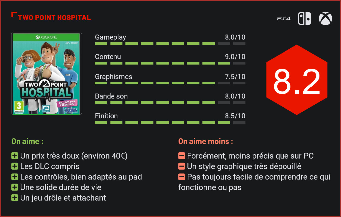 Succès inattendu sur PC, Two Point Hospital a aujourd’hui droit à un portage en bonne et due forme sur consoles. Un pari audacieux de la part du studio lorsqu’on connait les difficultés à porter un jeu de stratégie ou gestion sur consoles… L’avantage d’un Two Point Hospital par rapport à un Sudden Strike ou d’un Civilization, c’est que si le jeu reste très riche en features, il est également beaucoup plus accessible que la plupart des autres jeux de gestion & stratégie. Ce qui rend son portage sur consoles beaucoup plus facile… Le jeu de gestion d’hôpital de Sega s’inspire très ouvertement du cultissime Theme Hospital tout en n’hésitant pas à jouer selon ses propres règles. On reconnaît le style des créateurs de Dungeon Keepers! Two Point Hospital adopte un ton très humoristique et une approche très arcade du genre, bien qu’il soit toujours question d’agrandir son hôpital, d’engager de nouveaux effectifs, de licencier et de trouver des remèdes à des maladies rares. Le jeu de Sega s’écarte des simulations pour proposer une progression très arcade, avec une succession de défis parfois totalement improbables à braver. Durant l’aventure, vous devrez ainsi soigner des épidémies de grippe dans un hôpital trop frais. La gestion du chauffage occupera un rôle central dans la résolution du problème… Deux extensions sont livrées avec le jeu : l’île de Pebberley et Bigfoot. Vous vous en doutez, le délire est poussé très loin, et l’humour est d’ailleurs présent partout. Il ne faut donc pas s’attendre à un jeu réaliste, aux parties qui s’éternisent. Chaque mission reprend la structure d’un puzzle-game : il faut trouver une solution au problème le plus rapidement possible, en ayant pratiquement une totale liberté sur l’embauche du personnel, la création de salles et la stratégie adoptée. On notera au passage que les développeurs ont choisi de volontairement ne pas mettre en avant des maladies connues pour imaginer des infections et virus totalement atypiques, aux effets souvent hilarants sur les patients. Two Point Hospital verse volontairement dans la parodie, et le fait très brillamment. Difficile de s’embêter dans Two Point Hospital. De façon générale, le jeu reste très accessible. Difficile de rater les premières missions de Two Point Hospital. Le principal facteur d’échec sera ici la gestion du budget, qui peut entraîner une faillite. A tout prix, il faudra éviter les trop grosses dépenses pour maintenir le “commerce” à flots. On regrettera toutefois que si le titre est accessible et les options nombreuses, il soit souvent très difficile de comprendre si une stratégie fonctionne ou non. Vous l’aurez très vite remarqué : le game over et le retry font partie de l’expérience. Dommage toutefois que les compteurs n’en disent pas davantage sur les prises de décision du joueur. De façon générale, on reconnaît la patte des créateurs de Dungeon Keeper et Theme Hospital. Une grosse partie des équipes qui ont planché sur Two Point Hospital vient des studios de Lionhead et de Bullfrog. Le jeu est donc dans la droite lignée des précédentes productions de ce studio. A la fois très accessible, drôle, mais aussi plus riche qu’il n’y paraît dans son gameplay, Two Point Hospital est une véritable bouffée d’air frais dans l’univers des jeux de gestion. En plus du jeu d’origine, deux DLC sont offerts sur consoles. Si le portage sur consoles s’en sort plutôt bien, avec des contrôles bien maîtrisés, il va de soi qu’il reste plus confortable d’y jouer sur PC. La version consoles a toutefois le mérite d’être proposée à un tarif compétitif (environ 40€) et livrée avec plusieurs DLC payants sur PC. Depuis sa sortie, le jeu a aussi eu droit à de nombreuses mises à jour qui ont corrigé la plupart des bugs. La version finale sur consoles est donc beaucoup mieux optimisée que la version PC en son temps. Techniquement, Two Point Hospital fait également mouche malgré sa sobriété. D’apparence très épuré, le jeu fourmille en réalité de détails. Des centaines de patients se déplacent à l’écran, sans aucun ralentissement. En zoomant, on se rend également compte de l’incroyable travail réalisé par les développeurs, qui ont été très loin dans les détails. La direction artistique, très cartoonesque, confère également au jeu une identité vraiment unique. Pour ce qui est de la bande sonore, on reste dans le même esprit : cela reste très sobre, mais les musiques et bruitages sont efficaces et confèrent au jeu une identité unique. Bref, à moins d’être totalement allergique au genre, c’est un très grand oui. Conclusion Avec Two Point Hospital, Sega nous livre enfin le digne successeur de Theme Hospital. A la fois très accessible, drôle, attachant et fun, Two Point Hospital est un jeu de gestion d’hôpital résolument arcade, qui n’hésite pas à jouer la carte de l’humour avec ses maladies aux noms à coucher dehors, ses commentaires rigolos et ses animations cartoonesques. On reconnaît la patte des créateurs de Dungeon Keepers. Difficile de s’ennuyer une seule minute dans le jeu tant les défis vous forcent à vous remuer les méninges. Les sessions de jeu ne sont ni trop courtes ni trop longues et on prend un pied formidable à trouver des solutions aux problèmes rencontrés. Et si le jeu est certes moins précis au pad qu’au combo clavier / souris, ce portage sur consoles n’en reste pas moins une bonne surprise avec sa prise en main efficace, ses DLC inclus et ses bugs corrigés. Si vous étiez passé à côté du jeu sur PC, voici une belle occasion de rattraper cette grossière erreur!