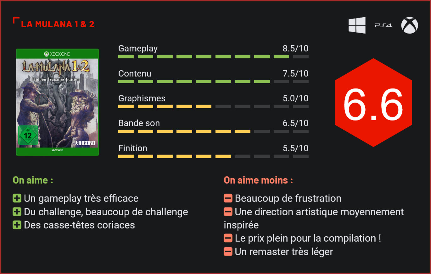 15 ans après ses débuts sous Windows, la série La Mulana a droit à une sortie sur tous les supports à travers une compilation qui rassemble les deux volets de la franchise. Hommage aux jeux de plates-formes old-school, La Mulana a connu un joli succès critique au moment de sa sortie, en 2005, sur Windows. Assez pour que l’éditeur NiS America se décide quelques années plus tard à offrir un petit lifting 16 bits à son jeu à l’occasion de sa sortie sur Wii et PS Vita et que pour l’éditeur se décide à sortir 10 ans plus tard une suite. Bien qu’il ait l’apparence d’un jeu sorti sur Super NES, La Mulana a pourtant bien vu le jour à l’ère de la 3D. Ses créateurs se sont inspirés très ouvertement des meilleurs Metroidvania pour créer un jeu d’aventure et de plates-formes 2D volontairement old-school, à la sauce Indiana Jones. Le premier jeu a l’apparence d’un jeu sorti sur Super NES. Au moment de sa sortie, le jeu a reçu un accueil très chaleureux des critiques grâce, en grande partie, à son level-design ingénieux et son niveau de difficulté élevé. Sa suite est parvenue à perfectionner la sauce, sans jamais s’écarter des sentiers battus. Mais qu’est-ce qui rend ces deux jeux d’aventure 2D si particuliers? La difficulté tout d’abord. Chaque niveau est un véritable défi. La mort fait partie intégrante de l’aventure et il ne sera pas rare de devoir recommencer plusieurs fois un même niveau pour avancer. Le mélange de genres ensuite, avec des pièges mortels à éviter, de la plate-forme, des affrontements avec principalement l’usage d’un fouet pour se défendre, des puzzles et énigmes et des dialogues loufoques. Et puis, bien sûr, la direction unique du jeu, à mi-chemin entre un Indiana Jones et un Tomb Raider, avec de l’exploration de tombeaux et de ruines à la recherche de trésors antiques. La recette de La Mulana fonctionne parfaitement et l’excellent level-design du jeu n’y est pas pour rien. Les boss titanesques sont aussi au programme de l’aventure. Dans son gameplay, le jeu de NiS America frôle la perfection. On le sent, les développeurs du jeu sont passionnés de rétrogaming. Les joueurs nostalgiques prendront d’ailleurs un pied formidable à parcourir l’aventure, malgré la simplicité du scénario et de la mise en scène. Côté réalisation, il ne faut pas s’attendre à une claque. Les deux jeux sont un hommage à la glorieuse époque des Metroidvania en 16 bits. Le rendu est donc proche d’un Castlevania ou d’un Metroid. Si la direction artistique est critiquable (notamment et surtout le character design, qui ne plaira clairement pas à tous), difficile de critiquer une réalisation technique d’un autre temps, totalement volontariste. Ce qui est critiquable en revanche, c’est le prix de cette compilation, facturée au prix plein en magasin – soit une grosse cinquantaine d’euros tout de même. Car d’un point de vue technique, le travail reste minimaliste. Le jeu n’a subi aucun lifting et n’intègre aucun contenu inédit. Chaque jeu aurait très bien pu être vendu une dizaine d’euros dans une version numérique. A plus de 50€, la pilule a donc du mal à passer. Le second volet reste très proche du premier dans sa direction. Si au niveau du contenu, cette compilation parvient à séduire avec deux excellents metroidvania délicieusement vintage, le prix risque donc d’être le principal frein à l’achat pour les joueurs, qui seront sans doute nombreux à regretter une tarification aussi élevée. Passer à côté de ces deux hits en puissance sur base uniquement du prix serait toutefois une grossière erreur tant le trip nostalgique mérite le détour. La Mulana 1 et 2 ne sont pas juste deux excellents metroidvania, il s’agit également de deux très beaux hommages aux jeux 16 bits, très respectueux de leur ADN, et de surcroît généreux en contenu. Conclusion Si elle est tarifée un peu cher, cette compilation des deux premiers volets de la série La Mulana aura le mérite de faire découvrir à de nombreux joueurs qui étaient passés à côté de ces deux monuments du jeu indépendant de découvrir ces deux excellents metroidvania, brillants hommages aux jeux 16-bits. A mi-chemin entre un Castlevania et un Tomb Raider à la sauce 2D, La Mulana reste un jeu d’aventure très punitif et totalement décomplexé, qui mêle brillamment plates-formes, combats contre des boss gigantesques, énigmes et exploration. Un incontournable pour tous les amateurs de rétrogaming, même s’il est vrai que la direction artistique très particulière des jeux ne plaira pas à tout le monde!