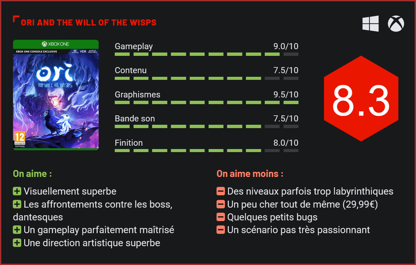 5 ans après Ori and the blind forest, Moon Studios nous livre le second chapitre des aventures d’Ori. Après une année 2019 “difficile”, les Xbox Games Studios nous avaient promis une cuvée 2020 magistrale. Le programme commence en force avec la sortie d’Ori and the will of the wisps, suite de l’une des exclusivités les plus plébiscitées sur Xbox One. Pour cette suite, Moon Studios a eu tout le temps qu’il souhaitait pour peaufiner son travail. Il aura fallu en tout près de 5 ans au studio pour nous livrer la suite du premier volet. Et si la formule n’évolue pas beaucoup, les développeurs maîtrisent désormais parfaitement leur recette. L’aventure reprend là où on l’avait laissée. Sur la terre de Niwen, Ori, notre héros, accompagne son nouveau compagnon, Kun, une jeune chouette qui apprend à voler. Séparé de son ami après un accident, Ori tentera de retrouver son chemin dans un monde où les dangers sont partout. Les combats de boss sont toujours aussi impressionnants. La recette n’a pas beaucoup évolué depuis le premier volet. Le scénario d’Ori and the will of the wisps rappelle d’ailleurs curieusement celui de son ancêtre. De façon générale, celui-ci reste mis en scène de façon minimaliste et c’est probablement le plus gros reproche que l’on fera au jeu. Dialogues, scénario et mises en scène ne donnent que peu de profondeur à l’univers d’Ori. Côté gameplay, les mécanismes de jeu restent les mêmes. On se retrouve ici face à un Metroidvania relativement exigeant, qui reste toutefois accessible grâce aux nombreux points de sauvegarde rencontrés. Malgré les apparences, Ori and the will of the wisps n’est clairement pas un jeu qui se destine aux plus jeunes. La frustration fait partie intégrante de l’expérience. De façon générale, les débuts dans le jeu seront également très difficiles au vu du hud, pas forcément évident à comprendre. Car Ori and the will of the wisp n’est pas un jeu de plate-forme old school qui se joue en ligne droite. Les environnements sont souvent labyrinthiques et le jeu regorge de quêtes secondaires. S’il est possible d’accéder à une carte pour mieux s’y retrouver, il n’est pas rare de s’y perdre. Les allers-retours sont également nombreux. Le plus gros atout du jeu, cela reste bien sûr sa superbe direction artistique. L’enchantement est permanent – des décors aux créatures rencontrées, tout transpire ici les contes féériques. Se perdre dans les superbes décors du jeu n’est donc en soi pas forcément une mauvaise chose. Par rapport au premier volet, on notera que les combats font davantage partie de l’expérience de jeu. Ori est capable de se déplacer rapidement, de sauter ou se laisser porter par le vent, mais aussi de frapper ses adversaires, d’utiliser des armes, de tirer à l’arc et même d’utiliser une sentinelle. La nervosité du jeu laisse au joueur la possibilité de multiplier les combos. Visuellement, Ori frappe très fort. Par rapport au premier volet, Ori and the will of the wisps gagne donc en nervosité, en action et en complexité. Pour donner un peu de substance au jeu, les développeurs ont également intégré des composantes héritées des RPG, avec par exemple des pouvoirs à améliorer à l’aide de fragments que les joueurs récupéreront en réalisant divers défis. Le concept est sympathique, même si dans la pratique, ces défis représentent juste une façon de gonfler artificiellement la durée de vie du jeu. Au niveau du level-design, le jeu parvient également à surprendre avec une belle diversité, des décors montagneux qui pousseront le joueur à voltiger d’un pic à l’autre, aux décors sous-marins dans lequel le joueur pourra se déplacer très rapidement. Il y a une réelle diversité et beauté dans ce titre, qui pousse beaucoup plus loin la formule du premier volet. On retrouve les mêmes mécanismes de progression et surtout les mêmes boss titanesques, qui laisseront une empreinte indélébile dans le cœur du joueur. Ori and the will of the wisps frappe fort en améliorant la recette du premier volet. De façon générale, le jeu est également beaucoup plus accessible avec ses nombreux points de sauvegarde automatisés. Cette plus grande accessibilité réduit toutefois drastiquement la durée de vie du jeu. Il ne faudra pas plus de 9 à 10h pour voir le bout de l’aventure. En fonçant en ligne droite, il sera même possible de boucler le jeu en moins de 4h! Cela reste donc assez maigre pour un jeu vendu 29,99€. La progression dans le jeu est facilitée par la présence de nombreux checkpoints. Pour le reste, Moon Studios réalise presqu’un sans faute en nous livrant un jeu visuellement superbe, qui exploite parfaitement tout le potentiel de la console de Microsoft et se dote d’une bande son également très réussie. Si les testeurs du jeu avaient évoqué la présence de nombreux bugs avant la sortie du jeu, le patch day-1 a corrigé la plupart des bugs. Il sera très rare d’y être confronté. La finition est donc soignée, bien qu’il ne sera pas impossible de rencontrer l’un ou l’autre bug. Conclusion Techniquement très impressionnant, Ori and the will of the wisps perfectionne la recette du premier volet. Grisant, le jeu de Moon Studios est sans aucun doute l’un des Metroidvania les plus aboutis de ces dernières années. Outre ses superbes visuels, Ori and the will of the wisps peut se vanter de disposer de l’un des gameplay les plus sophistiqués du genre. Par rapport au premier volet, le jeu gagne en nervosité. Les affrontements sont plus techniques et la tension toujours palpable. Plus accessible que son ainé, de par la présence de nombreux points de sauvegarde, le jeu n’en reste pas moins destiné à un public plutôt élitiste. Car sous ses airs de platformer très mignon, Ori and the will of the wisps reste un jeu de plates-formes et d’exploration exigeant, qui