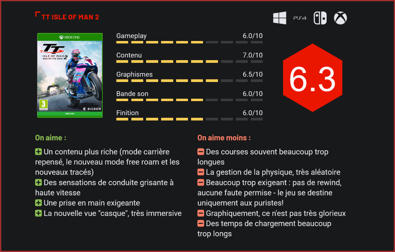 Après un premier volet plutôt séduisant, le studio de développement français Kylotonn revient déjà à la charge avec un second volet pour sa série de jeux de courses de motos, sobrement baptisé Isle of Man 2. Comme son nom l’indique, Isle of Man est un jeu de course de motos assez particulier puisqu’il ne suit pas une compétition mondiale mais se concentre sur un événement principal : le tracé de l’Ile du Man. Bien connu des amateurs de deux roues, ce tracé légendaire est l’occasion pour les pilotes les plus expérimentés de montrer leurs aptitudes sur l’une des courses les plus techniques au monde. Pas de panique toutefois, il n’y a pas qu’un seul tracé dans le jeu puisque Isle of Man 2 propose également de prendre part à d’autres compétitions avec des tracés se situant notamment en Irlande et au Pays de Galles. Les décors du jeu exercent un certain charme… Si le premier volet était parvenu à séduire les joueurs avec son gameplay exigeant, nombreux étaient ceux à critiquer le manque de contenu et les visuels du jeu. Le studio de développement l’a bien compris et a entièrement retravaillé le mode carrière tout en offrant un joli lifting au jeu. Pas de grosse surprise à l’horizon toutefois puisque le nouveau mode carrière d’Isle of Man 2 est entièrement calqué sur celui de WRC 8, une autre production du studio français. L’immersion est minimaliste. Pas de scénario ni de cinématiques. Il faudra se contenter d’une interface très sobre remplie de tableaux, dans lesquels le joueur devra sélectionner son équipe, ses objectifs de saison, les événements auxquels il souhaite participer dans l’agenda, et puis aussi les perks – des sorties d’avantages que le joueur pourra activer pour les courses suivantes, selon son ressenti – en se donnant par exemple un léger avantage sur ses concurrents en début de partie ou en réduisant l’impact économique sur les gains en cas d’un second départ… Graphiquement, ce second volet est au-dessus du précédent, mais le résultat reste très moyen. Le système de progression dans le mode carrière est plutôt bien fichu dans la mesure où le jeu pousse le joueur à explorer son contenu sur plusieurs saisons. Il y a donc largement de quoi faire même si, encore une fois, il ne faut pas s’attendre à un world tour. Le contenu du jeu reste principalement axé sur la compétition de l’Ile de Man et pratiquement tous les tracés se ressemblent ; vous y traverserez des petits villages perdus au milieu de nulle part, longerez des lochs et croiserez des milliers de clairières. Ce manque de diversité au niveau des décors finit d’une façon ou d’une autre par lasser le joueur… La bonne nouvelle, c’est que de nouveaux éléments entrent en jeu, avec l’introduction d’un mode free roam qui permet au joueur d’explorer 60 kilomètres de tracés librement. Parfait pour s’entraîner ! On retrouve également un système de personnalisation des bécanes, avec l’achat de pièces détachées pour personnaliser son véhicule, plutôt bien fichu lui aussi. Gros regret en revanche pour la disparition de la catégorie des side-cars, pourtant introduite avec le précédent volet. Il faudra se contenter ici des Superbike, Supersport et des Classiques. Les modélisations des bécanes sont impeccables. Côté graphismes, il y a aussi du mieux – surtout au niveau de la modélisation des bécanes et des coureurs -, mais le résultat reste très moyennement convaincant. Certains rendus sont totalement ratés, à l’image des lacs par exemple, qui ressemblent davantage à de gigantesques bâches en plastique qu’à des surfaces d’eau. Les effets de lumière à l’inverse sont très jolis. Du côté des décors, les résultats sont plus mitigés, avec davantage de détails que dans le premier volet mais encore une fois des rendus souvent étranges de la végétation. Assez paradoxalement, si le gameplay du premier volet était plutôt réussi, les développeurs ont entièrement revu la prise en main d’Isle of Man. On ressent ici davantage le poids des véhicules, avec un comportement plus réaliste des motos à faible vitesse. Il faudra donc davantage anticiper les mouvements que dans le premier volet. Etant donné qu’il s’agit d’une simulation pure, les néophytes en prendront pour leur grade. Le gameplay est très exigeant. La moindre sortie de route vous fera perdre plusieurs places au classement et il n’existe aucune fonction de rembobinage. Pire, si vous choisissez de recommencer la partie, vos gains seront réduits de 30%. Même un amateur de jeux de course aura besoin d’un gros temps d’apprentissage pour maîtriser la jouabilité du jeu, des plus crispantes. Dans le même ordre d’idée, on regrette le fait que le jeu de Kylotonn propose très souvent des tracés assez longs, avec des courses qui se parcourent très souvent sur des temps de 20 à 30 minutes de jeu. La moindre erreur pouvant être fatidique, il faut faire preuve d’une totale concentration. Très clairement, le jeu n’est donc pas destiné au grand public. Côté sensations, on apprécie l’introduction d’une nouvelle vue “à l’intérieur du casque”, d’un réalisme bluffant. Les sensations de vitesse sont là et l’immersion est totale. On apprécie un peu moins en revanche la physique parfois totalement surréaliste du jeu – notamment lors des sorties de route et des chocs avec les autres pilotes, qui pourront mener à des situations hilarantes, ce qui n’est jamais très bon signe pour une simu. Dans le même ordre d’idée, l’IA n’est pas forcément des plus efficaces. Les chocs sont nombreux et on a souvent l’impression que les autres pilotes suivent un tracé prédéfini sans trop se préoccuper de votre conduite. Les tracés offrent peu de diversité. Parmi les autres défauts à relever : des temps de chargement souvent beaucoup trop longs (et nombreux), des men
