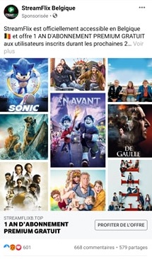Le soi-disant service de streaming propose de profiter de films actuellement en salle de cinéma gratuitement, et ce, pendant un an. Une nouvelle tentative de phishing sévit actuellement sur Facebook. Elle prend la forme de publications sponsorisées faisant la promotion d’un nouveau service de streaming officiellement lancé en Belgique. À cette occasion, Streamflix offre – étonnamment – un abonnement premium d’un an à tous ceux qui souscrivent à l’offre. Passé ce délai, l’abonnement passe à 2,90 euros par mois. Une offre très alléchante d’autant plus que le service propose de regarder des films qui sont encore à l’affiche dans les salles de cinéma, mais aussi des contenus provenant d’autres plateformes de streaming légales (Netflix, Hulu, Amazon Prime). Des poupées russes Il s’agit évidemment d’une arnaque aux procédés particulièrement efficaces qui misent avant tout sur la crédulité des internautes peu habitués. Lorsqu’on se rend sur le site de Streamflix, celui-ci nous rappelle l’offre exclusive à laquelle on a la chance de pouvoir profiter. Le site joue sur l’urgence pour inciter les visiteurs à s’inscrire sans faire preuve d’esprit critique puisqu’il indique que l’offre expire dans à peine 7 heures. Un compteur qui est étrangement remis à 7 heures 21 minutes à chaque fois qu’on rafraîchit la page. On notera également que Streamflix reproduit la police de Netflix. En cliquant sur « essayer gratuitement pendant 1 an », on est redirigé vers une plateforme qui ne porte plus le nom de Streamflix, mais de Bridlee. Un changement qui devrait vous mettre la puce à l’oreille. Très rapidement, le site vous demandera d’introduire vos informations bancaires. Une demande qu’il justifie assez maladroitement puisqu’il s’agirait simplement d’un moyen de vérifier votre adresse postale étant donné que le service n’est disponible que dans certains pays via votre numéro de carte de crédit valide. Une arnaque très poussée Sur le nouveau site, Bridlee, on peut aussi bien consulter les conditions d’utilisation que la politique de confidentialité. De quoi mettre en confiance le visiteur, même si on a pu déceler quelques fautes d’orthographe. Un numéro de téléphone belge est également proposé pour toute question ou demande. Et surprise, le numéro est bien actif. Cependant, vous n’entrerez pas en contact avec une personne, mais avec un assistant personnel qui, pour vous identifier, vous demander exclusivement votre numéro de carte de crédit… Lors d’un second appel, le message préenregistré n’était pas le même, les propositions étaient tout de même étranges. Nous avons pu rentrer en contact avec une personne anglophone. Celle-ci travaillait bien pour Bridlee, sauf qu’il ne s’agissait pas d’un service de streaming de films récents, mais bien d’un service payant qui proposait soi-disant des vieux films. Étrange. Or, en se rendant sur l’URL donné par le service client, il était en réalité question d’un service de streaming musical… La personne nous a pourtant assuré qu’il ne s’agissait pas d’une arnaque. Une arnaque internationale Une chose est sûre, il ne s’agit plus d’une offre de streaming de films encore à l’affiche ni de contenus provenant d’autres plateformes de streaming légales. D’ailleurs, on retrouve des copies de Streamflix dans d’autres langues, notamment en espagnol, mais ici, il s’agit de Playflix. La mise en plage est identique à celle de Streamflix et l’offre est la même. On trouve également des traces de cette fausse plateforme en automne 2019. Dans tous les cas, quand c’est trop beau pour être vrai, il y a de fortes chances pour que ça le soit. Une rapide recherche sur la toile vous permettra de savoir s’il s’agit effectivement d’une arnaque ou non grâce aux avis d’autres utilisateurs et ainsi d’éviter de mauvaises surprises. Malheureusement, on retrouve ce type d’arnaques assez régulièrement sur Facebook et si les internautes sont habitués, certains se font encore avoir.