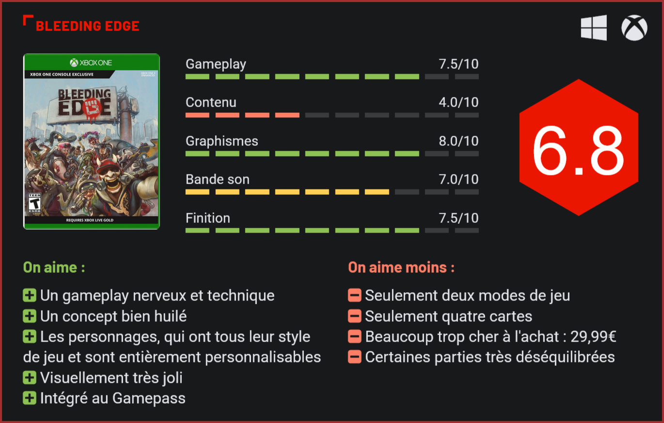 Attendu au tournant, le nouveau jeu de Ninja Theory (Hellblade) mélange plusieurs genres avec brio sans toutefois vraiment briller, la faute à un contenu vraiment trop limité pour un jeu vendu près d’une trentaine d’euros… Nettement moins attendu qu’Ori and the will of the wisps, Bleeding Edge était toutefois parvenu à attirer la curiosité des gamers avec son mélange de genres atypique et son character-design emprunté à Overwatch. Bien qu’il aurait très bien pu être un free-to-play, le nouveau jeu de Ninja Theory est pourtant bien vendu 29,99€. Un tarif élevé pour un jeu au très gros potentiel, qui souffre toutefois d’un contenu rachitique à son lancement… On ne vous le cachera pas, difficile de le conseiller au prix plein. Il faudra probablement attendre que le contenu du jeu soit enrichi pour passer à la caisse. En attendant, le jeu est disponible au sein de l’offre Gamepass et il n’y aucune raison de s’en priver… Le casting du jeu est plutôt coloré! Car comme de très nombreux autres jeux, Bleeding Edge souffre du syndrome du jeu “en construction”. Si au niveau de sa réalisation, le jeu impressionne, son contenu est pour l’heure beaucoup trop léger. On retrouve en effet seulement deux modes de jeux et quatre cartes. Mais Bleeding Edge, c’est quoi au juste? Un mélange improbable de TPS, beat them all et jeu de combat en arènes, qui se joue exclusivement en ligne. Côté character design et univers, Bleeding Edge tire clairement son inspiration d’un Overwatch. C’est coloré, vivant, et ça rappelle très souvent un cartoon. Globalement, Bleeding Edge s’en sort très bien à ce niveau avec ses décors animés, ses personnages ultra-charismatiques qui se contrôlent tous d’une façon très différente et ses parties au rythme très nerveux. Côté prise en main, on se situe quelque part entre un Overwatch et un League of Legends. On contrôle son personnage à la troisième personne et on active sans cesse des pouvoirs pour faire apparaître un mur de protection, soigner un allié, lancer un déluge de feu ou se vaporiser. Chaque personnage du jeu dispose de ses propres pouvoirs – tous customisables selon les souhaites du joueur puisqu’il est possible de faire évoluer ses personnages et de déverrouiller de nouvelles capacités. Le casting du jeu est plutôt riche et tous les personnages présentent un réel intérêt avec des combattants lourds, des soigneurs, et des combattants plus légers qui préféreront s’infiltrer dans le dos de l’adversaire. Chaque personnage a sa propre identité et il faut bien le reconnaître, tous sont très réussis. Difficile de ne pas avoir l’envie de tous les découvrir… S’il reste léger, le casting du jeu est assez varié pour vous occuper durant une bonne dizaine d’heures. S’il se joue souvent comme un beat them all, Bleeding Edge est pourtant bien davantage un TPS dans lequel la coopération est primordiale. Deux équipes de quatre joueurs s’affrontent ici dans de courtes sessions de jeu (d’environ 5 minutes), à travers deux modes : un mode domination qui consiste à capturer des points d’intérêt pour faire grimper son compteur de points, et un mode récupération, dans lequel le joueur devra récupérer des cellules d’énergie puis les rapatrier dans un point de collecte si possible sans se faire descendre. Il n’y a pas de deathmatch ni de team deathmatch, ni aucun autre mode de jeu plus original. Si la recette fonctionne plutôt bien et la tension est palpable dans chaque partie, on pourra émettre à l’encontre de Bleeding Edge deux reproches principaux. Tout d’abord, son gameplay est trop basé sur la coopération. Par conséquent, si une équipe n’intègre pas les bons personnages – par exemple, un soigneur, indispensable – la partie se termine souvent par une défaite. Dans Bleeding Edge, le rôle du soigneur est central. Dans le même ordre d’idée, il vaudra mieux de préférence rester à quatre. Les affrontements sont d’une rare violence et dès que la balance a tendance à pencher en faveur d’une des deux parties en particulier, la partie finit vite par être totalement déséquilibrée. Il ne sera pas rare ainsi de terminer un match avec un score de 600-20. Celui-ci sera représentatif d’un manque de coopération au sein de l’une des deux équipes. Mieux vaut donc éviter les boulets et de préférence y jouer avec des amis… Quant toutes les conditions sont réunies et que les joueurs ont bien appris à coopérer, Bleeding Edge monte un vrai potentiel – celui d’un jeu qui aurait sa place dans l’e-sport aux côtés des plus grands. Chaque personnage dispose de 3 pouvoirs (personnalisables) et peut activer une super-attaque. Malheureusement, on en revient encore et toujours au même problème : le manque de diversité au sein du jeu fait qu’on en fait très vite le tour. Pas tant au niveau du casting mais davantage au niveau des modes de jeu et des niveaux. Vigor, un free-to-play exclusif à la Xbox One lui aussi, avait été lancé avec facilement trois plus de contenu. On s’en doute, tout cela vient de la volonté de l’éditeur de faire évoluer son jeu à travers le temps. Si les développeurs tiennent leurs promesses et apportent régulièrement du contenu supplémentaire, Bleeding Edge pourrait bien se faire une place aux côtés des plus grands jeux compétitifs dans la sphère de l’e-sport, et qui sait peut-être même séduire le grand public. Tous les éléments d’un très bon jeu sont là : le gameplay est nerveux et terriblement exigeant, graphiquement c’est très joli, le jeu a une véritable identité, el character design est superbe, c’est fun, intense et la personnalisation des personnages est poussée. Bref, il s’agit incontestablement d’une très bonne surprise. Le jeu de Ninja Theory risque toutefois de beaucoup souffrir de l’empressement de l’éditeur à le lancer le plus vite pos