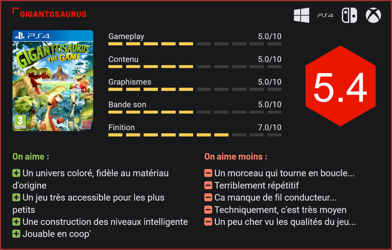 Gigantosaurus, vous connaissez? La série d’animation française cartonne auprès des plus jeunes. Au point qu’Outright Games s’est décidé à porter le concept en jeu vidéo… Devenu spécialiste des adaptations de films & séries d’animation pour les plus petits en jeux-vidéo, Outright Games nous livre ce qui sera sans doute l’un des jeux les plus accessibles pour les plus petits de ce début d’année. Non seulement Gigantosaurus se base sur une franchise qui cartonne auprès des plus jeunes, mais en plus, le titre d’Outright Games ose une approche différente du jeu de plates-formes. Quatre héros. Et d’un clic, vous pouvez passer de l’un à l’autre. Car ici, pas de jeu de plates-formes linéaire. Le joueur se retrouve plongé dans des mini open-world dans lesquels il devra retrouver des œufs, planter des arbres, récupérer des glands et participer à des courses de karts. La construction des open-world est telle que la progression n’est pas linéaire et que le joueur est amené, selon l’objectif qu’il décide de suivre, à explorer des niveaux à la verticalité bien pensée. Il y a ici un vrai jeu de plates-formes. Intelligemment conçu, le jeu d’Outright Games sait faire preuve d’originalité dans son gameplay en mettant le joueur aux commandes d’un petit gang de quatre personnages, aux capacités uniques. D’une simple pression de bouton, le joueur passe d’un personnage à l’autre. Et vu qu’il faudra utiliser les capacités de chacun pour progresser, on finit vite par s’habituer à jongler avec nos quatre héros. S’il reste très simple techniquement, Gigantosaurus a le mérite d’être coloré et de proposer des niveaux de grande taille. Très accessible, le jeu a très clairement été pensé pour les plus petits, qui découvriront dans ce titre une formidable mise en bouche aux jeux d’aventure. On pourra toutefois reprocher à Gigantosaurus une absence de réel fil conducteur avec des mondes bac à sable et des missions sans grand enjeu. Le jeu est par essence répétitif, mais pas forcément déplaisant. D’autant plus qu’il est possible d’y jouer à deux en coopération. Fidèle au matériau d’origine, cette adaptation a le mérite d’oser une approche différente des autres adaptations de séries et films d’animation. On ne se retrouve pas ici face à un jeu d’aventure en 3D hyper scripté dans lequel on avance en ligne droite. On lui regrettera toutefois une réalisation assez décevante. Le jeu a son charme, c’est fluide et plutôt bien fichu, mais les textures sont d’un autre âge, les modélisations restent très simple et la bande son semble faire tourner le même morceau en boucle à l’infini. A 39,99€, cela reste un peu cher, mais vu à quel point il est difficile de trouver un jeu pour les plus petits qui débutent, Gigantosaurus pourrait bien trouver son public. Il s’agit en tout cas selon nous d’une bonne pioche pour occuper les plus jeunes durant cette période de confinement… Conclusion S’il n’est pas très réussi sur le plan graphique, le nouveau jeu d’Outright Games représente une très belle mise en bouche pour les plus petits, qui débutent dans l’univers des open-world. Très accessible, le jeu a le mérite d’être également jouable à deux et de proposer une aventure non-dirigiste dans des niveaux ouverts qui regorgent de secrets à découvrir. Le concept est un peu répétitif et l’aventure manque d’un fil conducteur, mais l’univers à son charme et la construction des niveaux est assez intelligente. Au final, il s’agit donc d’un jeu très efficace pour occuper les plus petits durant plusieurs heures en cette période de confinement. Reste qu’à 39,99€, l’addition est quand même assez salée pour un jeu à si petit budget…