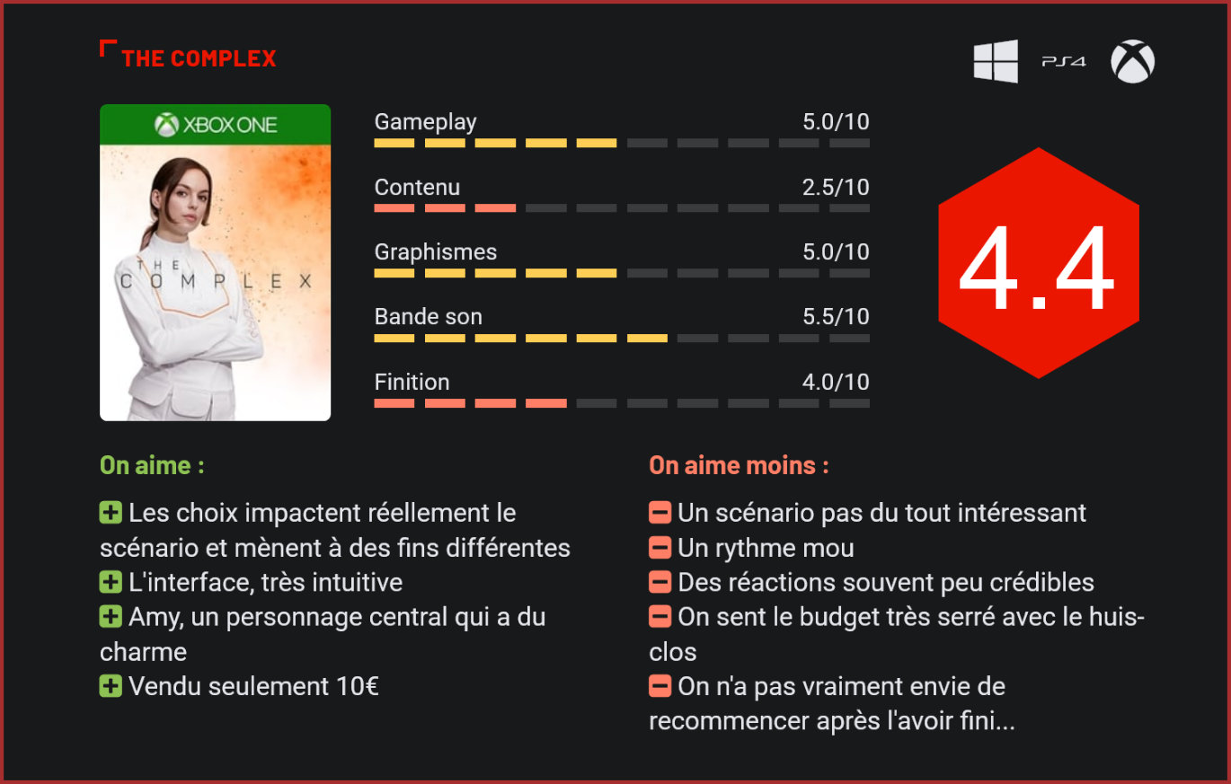 Wales Interactive n’aurait pas pu rêver meilleur timing pour son nouveau jeu, baptisé The Complex, qui reprend la formule de ses précédentes créations en mêlant cinéma et jeu-vidéo. Jamais la frontière entre le cinéma et le jeu-vidéo aura été aussi fine qu’avec les jeux de Wales Interactive qui avait anticipé le potentiel des films interactifs bien avant la sortie de Bandersnatch sur Netflix. Certaines de ses précédentes productions avaient montré un réel potentiel, à l’image du très sympathique Late Shift. Avec The Complex, les Gallois nous livrent un projet encore plus ambitieux qui arrive avec un timing absolument parfait sur le marché. Dans The Complex, chaque choix aura un impact sur le scénario. Dans le rôle d’Amy Tennant, une spécialiste des nanotechnologies, le joueur se retrouve enfermé dans un centre de recherche aux côtés d’un individu visiblement victime d’une étrange maladie qui pourrait mener à une pandémie. La jeune femme s’est effondrée quelques heures plus tôt dans le métro londonien. Pour la sauver et découvrir les mystères qui entourent son existence, le joueur devra explorer les différentes pistes du scénario. Chaque décision aura un impact sur l’histoire principale et les relations entre Amy et ses collègues. Comme les autres productions de Wales Interactive, The Complex est un jeu qui se regarde comme un film, avec lequel le joueur interagit une vingtaine de fois pour prendre différentes décisions. Le concept est très séduisant et fonctionne dans la pratique plutôt bien. On ne peut en revanche pas en dire autant du scénario… Pas de pandémie, en réalité, The Complex se déroule entièrement en huis-clos. Car c’est bien là que le bas blesse, The Complex est un film à petit budget médiocre. Pas dans sa réalisation ni son jeu d’acteur, mais dans son écriture. Les choix qui sont proposés au joueur sont souvent très peu réalistes et très dirigistes. Les réactions des rôles principaux sont la plupart du temps très dramatiques et mèneront de toute façon le joueur à un bain de sang. Sur fond de théorie complotiste, le scénario de The Complex finit par se perdre après seulement 30 minutes dans l’absurdité complète, quand un commando de 3 hommes débarque au cœur du complexe et qu’aucune mesure n’est prise par la direction pour les arrêter. Rien ici n’est crédible. Pas même le comportement des rôles secondaires (ce petit clin d’oeil au moment du sacrifice mériterait à lui seul un Razzie Award). Alors certes, le personnage d’Amy s’en sort plutôt bien et oui, le divertissement est plutôt bien filmé, mais il est souvent très difficile de garder ses yeux rivés sur l’écran pour voir apparaître les propositions d’action. Il faut bien l’admettre : on s’ennuie souvent dans The Complex. Au point qu’on n’aura pas forcément l’envie de relancer le jeu pour découvrir les autres choix scénaristiques qu’il propose. Et cela montre à quel point le jeu est un échec. Car malgré sa réalisation de film à petit budget, Late Shift était parvenu à accrocher les joueurs avec son scénario efficace et ses multiples rebondissements. Cette fois, la magie n’opère plus. Le “film” manque globalement d’intensité. C’est d’autant plus dommage que techniquement, The Complex est plutôt une jolie réussite malgré le budget serré de sa production. Le jeu d’acteur est plutôt bon, à quelques choix scénaristiques près, les angles de caméra soignés et la bande son efficace. Mais le scénario ne parvient jamais à décoller, sombrant très vite dans les théories complotistes. C’est mou, lent et pas franchement passionnant, et même si ce n’est vendu que 10€, difficile de le conseiller à quiconque. Late Shift sera probablement un bien meilleur choix si le concept de Bandersnatch vous avait séduit. Conclusion Très séduisant sur le papier, The Complex ne parvient toutefois pas à convaincre dans la pratique, la faute à un rythme mou et à un scénario qui sombre beaucoup trop vite dans les théories complotistes. Très proche d’un Bandersnatch dans son concept, The Complex n’a toutefois pas la carrure du film interactif de Netflix. Wales Interactive était pourtant parvenu à nous livrer quelques brillants essais avec notamment le très sympathique Late Shift. The Complex est aux toutefois antipodes des précédents films-interactifs de l’éditeur gallois : bourré de raccourcis idiots et sans aucun enjeu. A 10€, vous ne risquez pas grand chose toutefois, si ce n’est de sombrer très vite dans l’ennui…