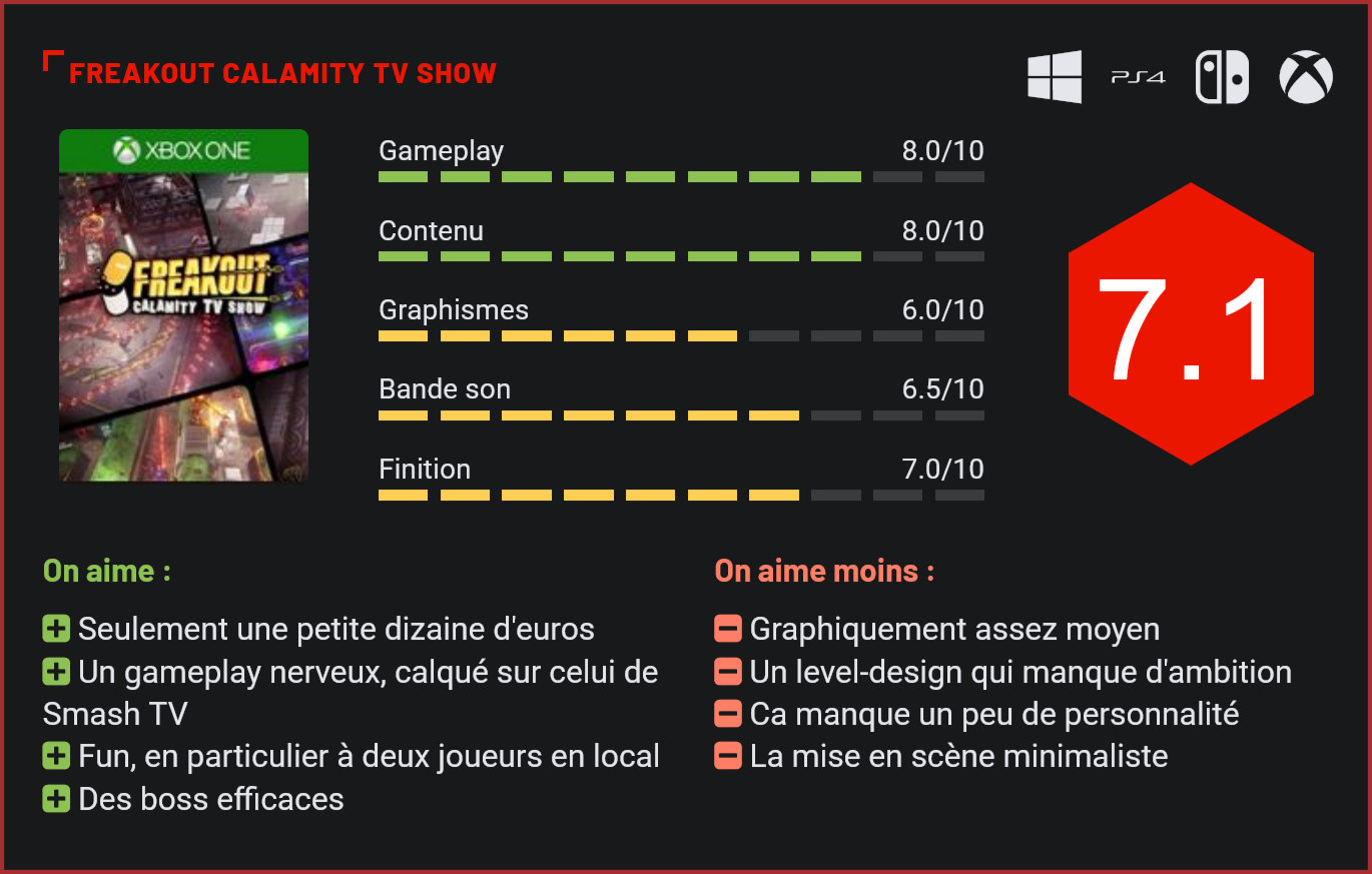 A côté des Resident Evil et autres Final Fantasy, les gamers ont également droit à quelques jolies surprises en ce mois d’avril 2020, avec notamment le très sympathique Freakout Calamity TV Show. Avec son concept calqué sur celui de Smash TV, Freakout Calamity TV Show est le jeu parfait pour se détendre entre deux parties de Resident Evil 3 et Final Fantasy VII. Car ici, exit les longues sessions de jeu, le titre d’Immaterial Studio joue la carte du fun instantané et de la “couch-coop” – la coopération à deux en local. Quelque part à mi-chemin entre un twin-stick shooter un bullet hell, le jeu d’Immaterial Studio parvient à séduire avec son univers cyberpunk. Transformé en vedette d’un show télévisé, le joueur devra survivre à une succession de niveaux en massacrant des hordes de mutants qui lui sont jetés en pâture. Le moindre contact avec l’une de ces monstruosités est synonyme d’une mort instantanée. A deux, c’est encore plus fun! Relativement exigus, les niveaux pousseront le joueur à rester très mobile, puisqu’il existe plusieurs points d’entrée pour les hordes de monstres. Il faudra utiliser à son avantage les quelques power-ups éparpillés sur la map et éviter soigneusement les pièges tendus par les présentateurs. Fun et décomplexé, le jeu à 100% la carte du die & retry. Si le titre n’est pas bien long, la difficulté est au programme. Il faudra parfois recommencer plusieurs fois un niveau avant d’en voir le bout. Chaque chapitre se termine par un combat de boss d’une rare intensité. Seul à deux joueurs, le titre est très agréable à parcourir. On regrette toutefois un certain manque d’ambition dans le level-design, souvent très paresseux, et la mise en scène ultra-minimaliste. Freakout Calamity TV Show est barré, mais sans doute pas suffisamment, et c’est finalement le plus gros reproche que l’on pourra lui faire. Les combats de boss sont particulièrement réussis. Car à un peu plus de 10€, le jeu d’Immaterial Studio est très clairement une excellente surprise. Fun, décomplexé et livré d’entrée de jeu full-options avec son mode coop local, Freakout Calamity TV Show est un twin-stick shooter très réussi, idéal pour animer une soirée entre amis. S’il ne fait pas preuve d’une grande originalité, le studio français connait ses classiques et nous livre un titre d’une rare efficacité qui compense finalement sa réalisation un peu légère par un prix de vente tout doux et un fun instantané. Assurément, une très très bonne surprise. Conclusion Sorti de nulle part, Freakout Calamity TV Show est une excellente surprise pour tous les amateurs de twin-stick shooters. Nerveux, le jeu d’Immaterial Studio se révèle très efficace, seul ou à deux en coop locale. Si ses niveaux manquent un peu de diversité, le titre parvient à renouveler l’intérêt du jour tout au cours de sa petite campagne avec de nouveaux ennemis, de nouvelles armes à débloquer et surtout des combats de boss très intenses. S’il est loin d’être parfait – on lui reprochera surtout sa réalisation assez minimaliste et un level-design parfois paresseux -, Freakout Calamity TV Show n’en reste pas moins un twin-stick shooter très fun, qui a de surcroît le mérite d’être proposé à un prix très bas.