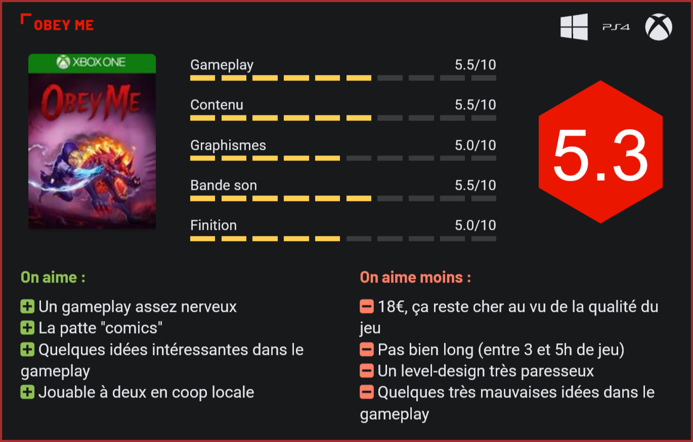 Ambitieux, le nouveau projet de Blowfish Studios marche sur les traces des Hunter et autres Marvel Ultimate Alliance. Le petit studio indépendant Blowfish nous livre en ce début d’année 2020 sa dernière création, un beat them all old-school qui nous propose de partir à la chasse aux démons en compagnie de Monty, un chien de l’enfer. Graphiquement, le résultat est relativement décevant. Avec un scénario signé par un vétéran de Marvel et un comic-book comme background, on pouvait attendre de ce Obey Me une bonne surprise, au moins au niveau de la narration. Et s’il est vrai que quelques jolis efforts ont été consentis, notamment au niveau des doublages en anglais, d’excellente qualité, on est malheureusement loin d’un jeu au scénario en béton armé. Dans la peau d’une chasseuse d’âmes, le joueur devra partir à la chasse aux démons. Plat, le scénario du jeu n’est qu’un prétexte pour nous plonger dans des environnements très sombres. Les dialogues sont souvent très creux et maladroitement mis en scène à travers des cinématiques utilisant des artworks que l’on aura très vite tendance à zapper. Pad en main, le résultat est un peu plus convaincant. Vanessa se contrôle assez facilement et se révèle même très agile puisqu’elle est capable de réaliser des dashs pour progresser plus vite ou éviter des pièges dans les niveaux. Si le jeu est assez linéaire, la progression n’en reste pas moins bien pensée avec une succession d’affrontements et de pièges qui mènent le joueur jusqu’à un combat de boss qui clôturera efficacement chacun des 12 niveaux du jeu. A l’exception du premier affrontement, les combats de boss sont plutôt convaincants. Tous les éléments d’un bon beat them all sont là avec des séries de combos, des attaques légères et puissantes, des dashs, un compagnon canin qui pourra être incarné par un second joueur et venir prêter main forte durant les combats, des capacités à débloquer en récoltant les âmes des défunts et de nouvelles armes à acquérir. Pour autant, même si le jeu n’est pas désagréable à parcourir, on peste très souvent contre le manque de lisibilité à l’écran, la latence occasionnelle entre les commandes et les actions et le level-design particulièrement paresseux du jeu. De façon générale, Obey Me a la fâcheuse tendance à nous tenir par la main du début à la fin du niveau. Ultra-linéaires, les niveaux du jeu ne donnent que peu d’espace à l’exploration. Il y aura certes quelques collectibles à récupérer, mais ceux-ci sont généralement très simples à localiser. Le jeu de Blowfish Studios tend également à être un peu trop facile, un peu trop brouillon et pas suffisamment profond. Inutile d’être trop technique, foncer dans le tas est souvent la solution la plus efficace. A bien des égards, le jeu de Blowfish nous a rappelé le sympathique Hunter the Reckoning d’High Voltage dans sa prise en mains. Comme lui, le jeu est bourré de très bonnes idées mais souffre également de quelques grossiers défauts. Le level-design du jeu est souvent très paresseux. Par exemple, les très étranges choix du studio en matière de conception du level-design, avec des mines qui explosent au moindre contact, des espèces de champignons qui vous feront rebondir dans toutes les directions et des tentacules qui vous agrippent. Mixés les trois éléments dans un espace confiné, et vous vous rendrez très vite compte que vous venez de créer un gigantesque flipper duquel le joueur ne ressortira que frustré. Car dès qu’il fait un pas de côté, le joueur subit une succession de rebonds auxquels il ne pourra se soustraire qu’après avoir perdu une part substantielle de sa vie. Paradoxalement, ce ne sont pas les démons ni les boss qui font le plus mal dans Obey Me mais le level-design du jeu. Autre vilain défaut : si vous choisissez de parcourir le jeu à deux en coop’, votre pauvre compagnon aura souvent l’impression de ne pas servir à grand chose. Beaucoup moins puissant que vous, il lui faudra parfois jusqu’à 6x plus longtemps pour venir à bout d’un adversaire. Il compense ce manque de force par son immortalité certes. Reste que dans la pratique, incarner Monty n’est pas ce qu’on pourrait appeler une expérience inoubliable. Quelques secrets se cachent dans chaque niveau. Sur le plan technique, le jeu n’est pas non plus fantastique. Si sa patte graphique très “comics” lui donne une identité qui lui est propre, les modélisations des personnages restent souvent très grossières et quelques petits ralentissements pourront même se faire sentir en cours de partie. Ajoutez à cela une durée de vie finalement assez courte (entre 3 et 6h en ligne droite) et vous comprendrez qu’il est difficile de justifier le tarif de 18€ du jeu. A condition de ne pas être trop exigeant, le titre se révèle efficace et même agréable à parcourir. Mieux vaudra toutefois attendre patiemment des soldes pour mettre la main dessus. Conclusion S’il n’est pas désagréable à parcourir, le nouveau beat them all de Blowfish Studios est malheureusement loin d’être une totale réussite. Malgré quelques bonnes idées (la coop locale, les compétences à débloquer avec l’XP, l’importance du dash), Obey Me peine à convaincre, la faute à un level-design très paresseux et un gameplay qui est quelque peu gâché par quelques idées très mal exploitées, à l’image de la coop’ qui place le second joueur dans la peau d’un personnage qui est clairement désavantagé dans la progression, ou des pièges très frustrants desquels le joueur aura beaucoup de mal à s’extirper. Au final, on se retrouve ici face à un beat them all très conventionnel. Dommage, car l’univers du jeu avait du potentiel. Avec son prix de vente de 18€ et sa durée de vie assez courte, Obey Me tiendra difficillement la comparaison face aux nombreux très bons bea