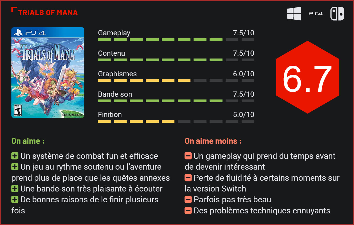 Après un remake catastrophique de Secret of Mana en 2018, nous étions en droit de nous poser la question. La refonte de Trials of Mana allait-elle connaître le même sort ? Plus connue au pays du Soleil-Levant sous le nom “Seiken Densetsu”, la série Mana est une série d’Action-RPG de Square Enix devenue très populaire au début des années 1990. Ayant connu son déclin dans la deuxième moitié des années 2000, elle est aujourd’hui un simple souvenir pour de nombreux joueurs. Pourtant, lors de l’E3 dernier, un remake de Trials of Mana est annoncé. Sorti en 1995, Trials of Mana est le troisième épisode de la série. Un épisode qui est resté exclusif au territoire japonais jusqu’en 2019 où il est ressorti entièrement traduit dans la “Collection of Mana”. Moins d’un an plus tard, c’est son remake qui arrive sur PC, Playstation 4 et Nintendo Switch. Une refonte complète en 3D, modernisée, fidèle au jeu d’origine, et avec du nouveau contenu. Notez également qu’il n’est pas nécessaire d’avoir joué aux autres jeux de la série pour jouer à cet épisode. À la manière d’un Final Fantasy ou d’un Persona, les histoires des jeux sont déconnectées. L’arbre Mana perd de sa puissance. À la recherche de l’épée sacrée L’histoire prend place alors que l’arbre mana s’épuise, et que de mystérieux individus complotent pour réveiller les Bénévodons, des créatures maléfiques scellées dans les pierres de mana disséminées à travers le monde. Des fées sont alors envoyées pour trouver des héros capables de manier l’épée de Mana et de ramener la paix. Ces héros, ce sont trois personnages que vous devrez choisir parmi six. Un choix qui aura de l’importance puisqu’il existe plusieurs fins selon le personnage principal que vous aurez choisi. Les événements au cours du jeu vont également varier selon les personnages qui vous accompagnent. Si le scénario est simpliste au premier abord, chaque personnage aura sa propre intrigue qui viendra former un tout plus fournis. Chacun des héros possède son objectif personnel lié de près ou de loin à cette histoire d’épée de Mana. Il faudra alors explorer un monde vaste. Nous y verrons les complots et conflits entre les différentes nations, et nous devrons faire face aux nombreux antagonistes qui nous barreront la route. La première moitié de l’aventure sera assez linéaire avant de nous laisser un peu plus de libertés par la suite. Ce scénario n’est pas toujours passionnant, ni toujours brillamment écrit, mais l’histoire sait rester agréable à suivre avec un rythme soutenu. D’autant plus que le jeu est assez dirigiste, et qu’il y a peu de tâches à accomplir en dehors de l’histoire. Celle-ci est donc réellement au cœur du jeu. Le système de combat garde le dynamisme bien connu de la série. Le système de combat reste fidèle à ses racines. Les combats se déroulent en temps réel et vous pouvez contrôler vos trois personnages quand bon vous semble. Il est possible d’esquiver, de sauter, d’utiliser des attaques faibles ou puissantes. Utiliser ces dernières rempli une jauge qui vous permet d’utiliser des compétences plus impressionnantes. Vous avez également accès à un menu en plein combat qui vous permet d’utiliser des objets ou des sorts magiques si vos personnages en ont la capacité. Les six personnages sont en fait assez uniques. Ils apprennent des compétences différentes et ils peuvent aussi changer de classe, ce qui donne accès à plus de possibilités. On peut également leur équiper des effets passifs que l’on obtient en interagissant avec certains personnages non-joueurs, ou simplement en leur attribuant des points dans certaines statistiques. À chaque montée de niveau, vos personnages gagneront un point que vous pourrez attribuer à une statistique parmi la force, la résistance, la chance, l’intelligence et la sagesse. Cela vous permettra d’influer sur l’évolution de vos héros. Les compétences à apprendre se multiplient au fil de l’aventure. Le jeu va donc se jouer différemment selon la composition de votre équipe. Il est possible que ce soit très bourrin ou alors beaucoup plus lent et plus tactique. Malheureusement, ce système de combat va prendre du temps avant de révéler son potentiel. Il faudra au moins attendre une dizaine d’heure avant de pouvoir changer de classe et d’avoir plus d’options offensives. Mais une fois ce stade dépassé, le jeu est vraiment très agréable à parcourir. Un jeu techniquement faiblard Là où le jeu se montre peu convaincant, c’est au niveau de sa présentation et de sa technique. Trials of Mana est entièrement doublé en anglais et en japonais. Si le doublage japonais est de bonne facture, le doublage anglais n’est pas toujours à la hauteur. Les comédiens jouent souvent à côté de l’émotion qu’ils doivent faire passer. Mais c’est aussi plutôt mou en terme de mise en scène, et les animations des personnages durant les cinématiques sont peu convaincantes. Sans parler de nombreux bugs d’affichage tout au long du jeu, comme les textures qui prennent quelques secondes avant de s’afficher correctement ou encore le clipping incessant dans les environnements. Le version Switch a également quelques soucis de fluidité lors des combats. On ressent que Trials of Mana est un jeu réalisé avec un petit budget. S’ils ne sont pas techniquement renversants, les environnements gardent un certain charme. Si le jeu est techniquement loin d’être impressionnant, sa direction artistique est pourtant assez solide et très fidèle à l’esprit “Mana”. Les couleurs vives ne rattrapent cependant pas les textures très datées qu’on peut trouver un peu partout dans les environnements. Il faut tout de même souligner la bande-son déjà très bonne à l’époque et qui est entièrement remastérisée ici. Trials of Mana est tout de même un jeu au co