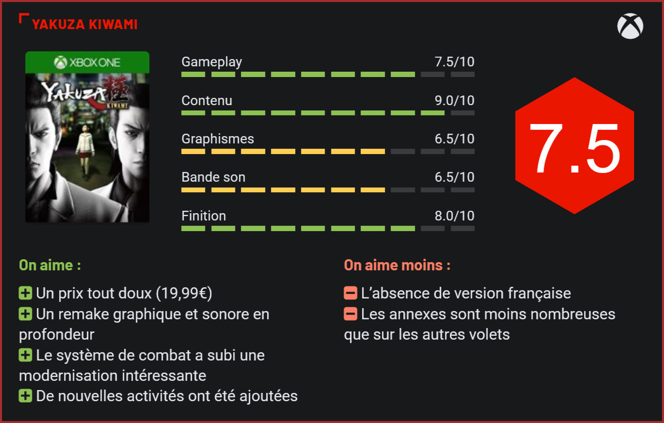 Sorti en 2005 sur Playstation 2, Yakuza reste un monument du jeu vidéo. Son remake de 2017 sorti sur PS4, lui avait redonné un peu de fraîcheur. Aujourd’hui, c’est au tour des joueurs Xbox de revenir aux origines de la franchise… Car oui, c’est bien une vieille histoire que nous refourgue Sega. Sorti en 2005 sur Playstation 2, Yakuza – ou Ryū ga Gotoku – est le premier titre d’une saga de 6 épisodes qui compte presqu’autant de spin-off. Développant l’univers des mafiosi japonais, Yakuza a souvent été qualifié de la version asiatique de GTA. Crime, meurtre, mais aussi honneur et loyauté sont les mots d’ordre de cet univers rempli de malfrats, pots de vin, victimes et abus. Graphiquement, le jeu n’a pas trop vieilli. Le titre avait déjà connu un portage en 2012 sur Playstation 3 et sur Wii U en 2013, mais Sega semble vouloir user jusqu’à la corde cette histoire puisqu’il sort un nouveau remake en 2016, au Japon, sur PS4 cette fois. Ce n’est qu’en août 2017 que le reste du monde pourra profiter d’un Yakuza Kiwami totalement retravaillé. Rien que pour la qualité et la beauté des images, on pardonne le manque d’originalité scénaristique. On soulignera tout de même l’ajout d’une cinématique de 30 minutes totalement inédite. Petite parenthèse tout de même sur la saga pour les non familiers. Jeu d’action-aventure, Yakuza mêle les phases d’exploration et d’aventure à travers divers chapitres. La progression est parfois linéaire avec un développement de l’histoire principale et parfois non-linéaire où le joueur peut se balader à travers l’environnement, découvrir de nouveaux quartiers japonais, réaliser des quêtes annexes et collecter de nouveaux objets. Axé aussi beaucoup sur les combats, Yakuza demande une grande familiarité avec les touches et les enchaînements afin de terrasser la vermine avec des combos surpuissants. Honneur et courage sont aussi des mantras importants de la saga, code de la famille des Yakuzas. Le scénario conserve son charme. Riche et parfaitement construit, Yakuza Kiwami nous plonge dans le destin honorablement tragique de Kazuma Kiryu, un ex-yakuza emprisonné pendant 10 ans pour un crime dont il avait endossé la responsabilité pour protéger son ami d’enfance, Kazama Shintarô. Celui-ci avait assassiné l’un des grands parrains japonais pour avoir tenté d’abuser de sa petite sœur. Après dix ans loin des codes de la rue, Kiryu devra réapprendre à survivre dans un monde où il sera à la fois rejeté par sa famille de mafieux et rechercher par les proches de celui qu’il a soi-disant tué. Malheureusement pour lui, son ami d’enfance Kazama Shintarô ne lui sera pas d’une très grande aide étant donné qu’il est devenu l’un des parrains les plus cyniques des Yakuza. Relations compliquées, retournements de situation et folie meurtrière sont au rendez-vous et entrainent le joueur dans la vie compliquée d’un gangster dont le mantra est l’honneur et le courage. Des qualités peu communes dans les rues où seule la loi du plus fort semble désormais régner. Les cut-scenes sont très travaillées. Si le jeu comporte plusieurs séquences d’exploration, Yakuza est avant tout une série de jeux de « Beat’em all ». Pour combattre la pègre et se défendre face aux Yakuzas mécontents, notre cher Kazuma Kiryu va devoir réapprendre à maitriser les techniques ancestrales des arts martiaux. Et quelle richesse ! On est loin des coups de poings et de pieds basiques, ici, on enchaine avec tous les parties du corps et objets trouvés au sol. Coups de pied circulaires, manchettes, écrasements des vertèbres, batte de baseball. Sensible, s’abstenir. Le tout est de maîtriser les touches. Durant la progression, un tutoriel viendra aider les mafieux en herbe à intégrer la complexité des enchainements. La concentration est de rigueur, surtout face à 3, 4 ou 5 ennemis. Les combats sont rarement à nombre égal ici. Mais cela n’est rien comparé aux affrontements des boss. Chacun ayant son style, notre Kiruy – et le joueur – devra maîtriser les 4 modes des combats plus intensément qu’avec des malfrats de premier ordre. Sega a d’ailleurs modernisé les combats à ce niveau par rapport au titre de 2005. Chaque situation implique son mode ; Brawler, Rush, Beast et Dragon de Dojima, chacun ayant ses avantages et inconvénients. La maîtrise est accompagnée par une puissance de frappe grisante pour le joueur. Les combats sont grisants. On notera également l’apparition répétée et incongrue d’un personnage devenu clé dans la saga : Majima. Un mafieux plutôt perturbé qui bondit devant notre héros meurtri à n’importe quel moment pour un combat épique. Les Majima Everywhere ont la particularité d’apporter un petit côté comico-flippant à l’aventure. Les quêtes secondaires et l’extermination des vermines viendront compléter le gain d’expérience, utile pour améliorer ses techniques de combats. Kazuma Kiryu pourra également s’équiper de bon nombre d’arme en tout genre et déguster des mets afin de restaurer sa jauge de vie. Pour ce remake, Sega offre deux nouvelles activités dans le quartier de Kamurocho. Le premier, le Pocket Circuit Car Racing est une course de voitures sur circuits électriques. Le second, MesuKin : Battle Bug Beauties est un jeu de combat Pierre-Papier-Ciseau plutôt particulier puisque ce sont des jeunes dames en petite tenue qui s’affrontent. Vous vous en doutez, avec un tel contenu, la durée de vie du jeu est tout bonnement exceptionnelle. Ceux qui accrocheront au concept en auront donc largement pour leur argent. D’autant plus que le jeu n’est vendu que 19,99€ sur Xbox et est intégré à l’offre GamePass! Les mini-jeux sont toujours de la partie. La saga n’a jamais caché son attachement pour le 7ème art. De par son inspiration dans les films de gangsters japonais (Aniki, mon frère), les sc