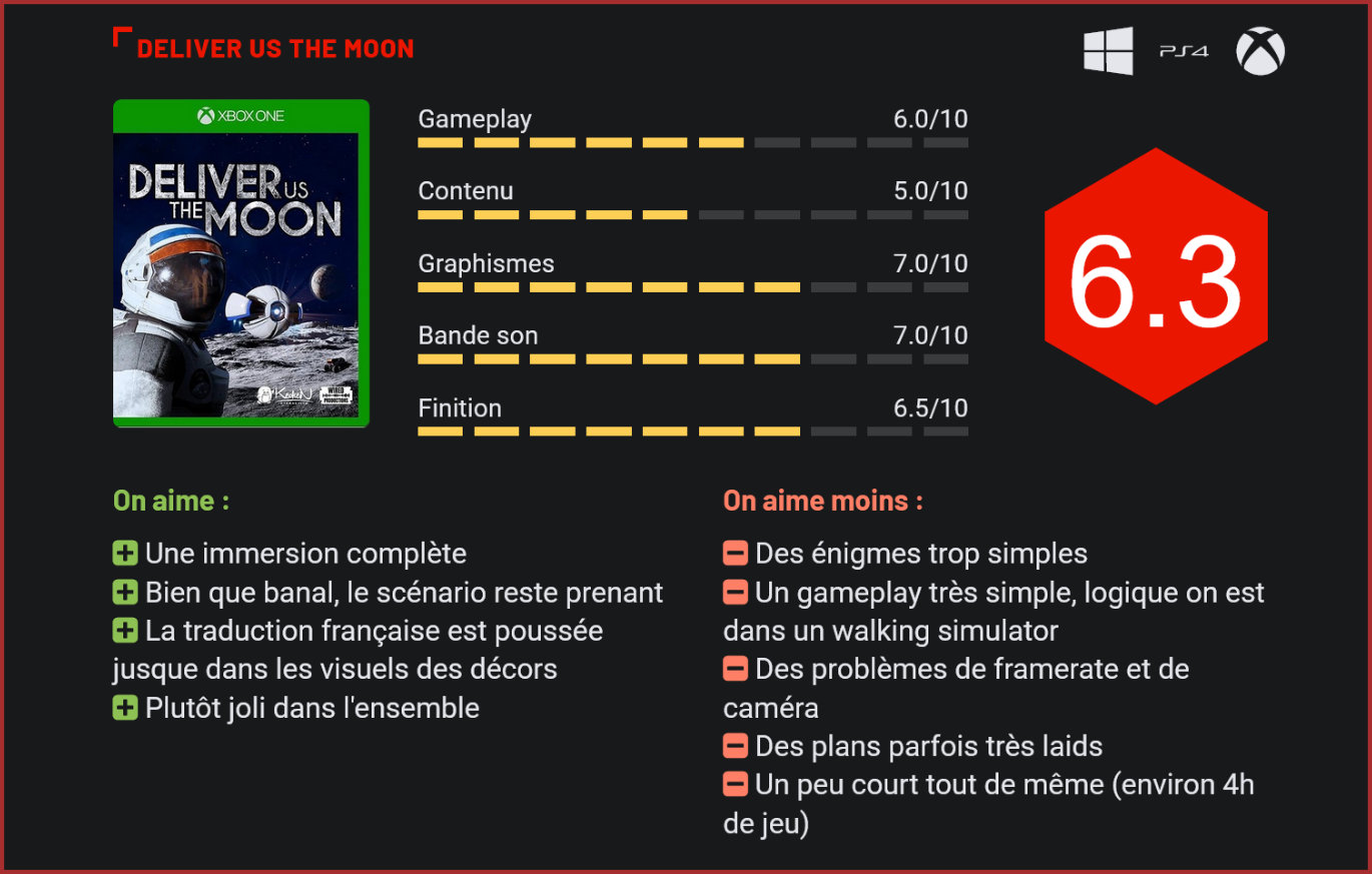 Sorti l’année passée sur PC grâce à un financement participatif, Deliver Us The Moon débarque enfin sur consoles de salon. L’occasion de se plonger dans mystérieux jeu d’aventure qui nous propose de partir à la conquête de l’espace… Un scénario connu qui ne manque pas de magie Deliver Us The Moon favorise la découverte de son histoire plutôt qu’un gameplay nerveux. Amateurs de sensations fortes et de gameplay nerveux, passez votre chemin. Le titre de KeokeN Interactive n’est rien de tout ça, mais il n’en reste pas moins immersif et intriguant. Deliver Us The Moon nous emmène quelques années dans le futur, en 2054 pour être exact. Alors que les ressources de la Terre s’amenuisent, les scientifiques parviennent à exploiter une ressource de la Lune, l’hélium 3, et à le rapatrier très facilement vers la planète bleue. Mais un jour, sans raison, toutes les transmissions avec les colons lunaires cessent et le transfert d’énergie est stoppé, mettant en péril les terriens. La mission est simple : retourner sur la Lune et enquêter sur ce qu’il s’est passé sur la base lunaire. Voilà le cadre dans lequel nous fait voyager Deliver Us The Moon. Un scénario catastrophe sur fond de science-fiction qui, à première vue, est loin d’être original. Pourtant, la magie opère. On se laisse transporter dans cette mission, on enfile les bottes de l’astronaute sur lesquelles reposent tous les espoirs de la Terre. La mise en scène et la manière avec laquelle on découvre les éléments de l’histoire parviennent parfaitement à pallier le manque d’originalité du scénario. Après une cinématique d’introduction et des interactions avec la Terre, on se retrouve à explorer la base lunaire seul. Pour comprendre les tenants et aboutissants de la mission et ce qu’il s’est passé là-haut, le joueur devra récolter des enregistrements audio et plusieurs documents. La compréhension de l’histoire repose donc sur l’exploration des modules lunaires. Cette manière de découvrir l’histoire rend le tout plus mystérieux encore. Une immersion à chaque instant Le jeu enchaîne avec des vues à la première et à la troisième personne. Lors de phases à la première personne, le joueur s’immerge totalement dans l’aventure. La principale qualité de Deliver Us The Moon est la manière avec laquelle il parvient à nous mettre dans la peau de l’astronaute solitaire. En récoltant les divers enregistrements audio et documents, on découvre en même temps que notre héroïne ce qu’il s’est passé là-haut. La quête des pièces du puzzle a une place importante dans le jeu. L’immersion de Deliver Us The Moon passe aussi par le gameplay. Si certaines phases se font avec un point de vue externe, les moments les plus intéressants se font à la première personne ce qui renforce le sentiment d’immersion. Un ressenti aidé par les différentes manœuvres que devra réaliser le joueur pour ouvrir une porte, accéder à la pièce suivante, allumer et amarrer la fusée, etc, des exercices qui exigent une vraie implication du joueur. Qui dit base spatiale, dit apesanteur – bien que le jeu débute sur Terre. Là-dessus, le jeu ne nous déçoit pas. En effet, l’impression d’apesanteur est très bien retranscrite dans le jeu, quitte à être très frustrante parfois puisqu’il n’est pas simple de se mouvoir en apesanteur. Dans tous les cas, cela vient encore une fois renforcer le sentiment d’immersion et celui de stress durant certaines phases chronométrées. S’il ne propose pas un gameplay nerveux, le jeu offre tout de même des phases stressantes grâce à des contraintes (oxygène, chronomètre) En tant que jeu narratif, Deliver Us The Moon ne propose pas un gameplay particulièrement nerveux, même s’il n’en reste pas moins stressant à certains moments. Le jeu repose essentiellement sur l’exploration et la résolution d’énigmes. Malheureusement, les énigmes proposées par KeokeN Interactive sont plutôt simples à résoudre, mais le studio a eu la bonne idée d’intégrer une contrainte, la réserve d’oxygène, pour corser les choses. L’association des deux permet effectivement de relever le niveau et de rendre les phases de jeu plus stressantes, d’autant plus que cela renforce l’aspect immersif. Bien qu’il s’agisse d’un walking simulator, Deliver Us The Moon parvient à se renouveler un minimum au fur et à mesure qu’on progresse grâce à l’arrivée d’ASE, un robot, qui sera contrôlable pour réaliser diverses énigmes. L’astronaute disposera également d’un laser et pourra même se balader en Rover à certains moments. Par ailleurs, toutes les petites interactions proposées dans le jeu demanderont une certaine précision ce qui est plutôt intéressant. Vers l’infini et au-delà À l’exception de quelques passages, le jeu est très joli. Les décors sont bien réalisés. De manière globale, le titre est visuellement réussi. Les cinématiques sont excellentes et les phases de gameplay sont tout à fait jolies. On notera tout de même quelques chutes inexpliquées de framerate, des textures moins travaillées, ainsi que des plans l’une laideur absolue que, là non plus, on ne s’explique pas. Les plans larges de la Terre pixelisée choquent en comparaison au travail fourni sur le reste de l’œuvre. La lumière y est d’ailleurs particulièrement bien travaillée. Les différents modules de la base lunaire sont très travaillés. Au lieu de proposer des décors fermés, le studio laisse entrevoir d’autres pièces auxquelles on n’aura jamais accès. C’est intéressant, cela donne davantage de vie à l’œuvre, mais cela n’en reste pas moins frustrant. Au final, les niveaux dans lesquels on progresse sont assez fermés et on ne peut s’empêcher d’éprouver un sentiment de frustration à ce niveau. On aurait préféré avoir davantage d’espace à explorer, même si le stu
