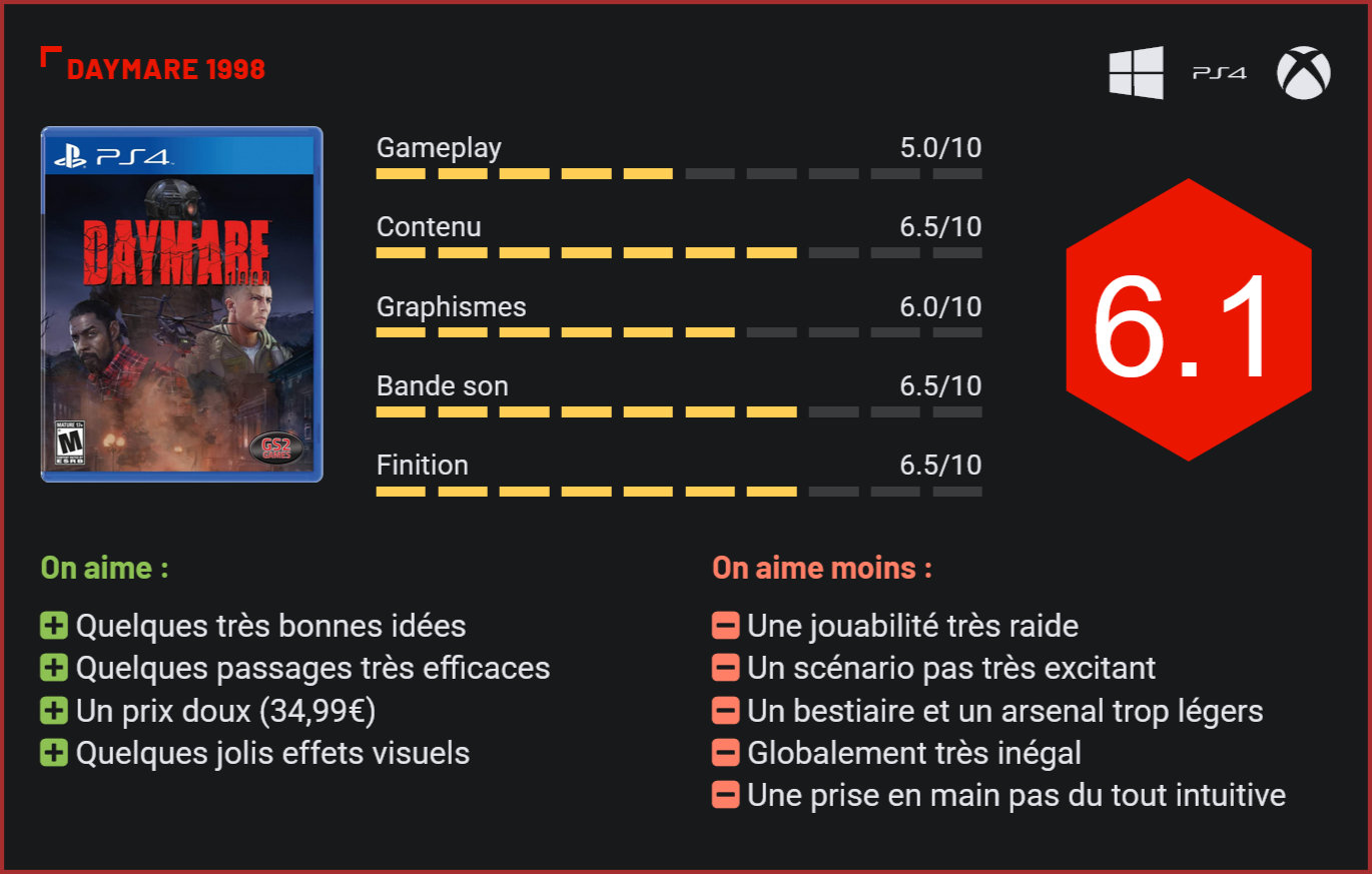 Initialement pensé comme un remake de Resident Evil 2, Daymare 1998 est l’oeuvre d’un petit studio indépendant italien qui joue la carte de la nostalgie en nous livrant un survival-horror old-school. Développé par une petite équipe de passionnés fans de la série Resident Evil de Capcom, Daymare 1998 était à l’origine un remake non-officiel du second Resident Evil. Le développement du jeu a toutefois dû être abandonné suite à une lettre de l’éditeur nippon, qui planchait déjà de son côté sur un remake du jeu. Qu’à cela ne tienne, le petit studio de développement italien a décidé de transformer son projet en un jeu stand-alone. S’il n’a plus rien d’un Resident Evil, Daymare 1998 a toutefois bel et bien construit sur les bases du projet amateur. Rien de surprenant dès lors à ce que l’univers du jeu et son scénario se nous rappellent très souvent Resident Evil 2. Au début du jeu, on incarne un soldat d’élite chargé de faire le nettoyage dans un labo où une expérience a mal tourné… Keen Sight, la ville que le joueur traversera dans Daymare 1998, est une réplique de Raccoon City. L’aventure débute toutefois sous un angle très différent puisque le premier chapitre du jeu nous place dans la peau d’un soldat d’élite du groupe HADES envoyé dans un laboratoire top-secret pour faire le ménage après un incident. S’il n’a rien de très original dans son scénario, avec son histoire de virus qui a contaminé toute une ville, Daymare 1998 fait un joli effort dans sa narration en nous faisant incarner 3 personnages différents au cours de l’aventure pour donner plusieurs angles à l’histoire. Le scénario est efficace, à défaut d’être passionnant. Pour le reste, Daymare 1998 est pratiquement une copie conforme de Resident Evil 2 dans sa construction, à ceci près que le gameplay est ici beaucoup plus rigide. On sent très clairement le manque de moyens. La visée, les déplacements, exigent une réelle concentration. Plus orienté action que son modèle – on commence l’aventure bien équipé! -, Daymare 1998 propose également quelques passages plus calmes, en mêlant exploration, loot et petites énigmes, très proches elles-aussi de celles croisées dans la saga de Capcom. Le cocktail fonctionne plutôt bien, à défaut de surprendre. Quelques jolis effets visuels sont au programme. Côté gameplay, on retrouve pratiquement les mêmes mécanismes de jeu que dans Resident Evil. Il faudra looter tout ce que vous pouvez. Grâce à un système de crafting, le joueur peut même créer ses propres potions énergisantes. La prise en main n’est toutefois pas aussi intuitive que dans Resident Evil. On regrette le système de recharge très particulier, qui vous fera gaspiller de nombreux chargeurs puisqu’ici, on retrouve deux boutons de recharge, un bouton de recharge classique et un rapide qui “gaspille” les munitions non-utilisées. C’est réaliste, mais dans l’action, il n’est pas rare de faire une erreur et de gaspiller ses balles… Dans le même ordre d’idée, pas de pause ici. Le joueur pourra accéder à son équipement en utilisant un écran tactile accroché à son avant bras. Il devra le faire apparaître puis s’équiper du bon objet. Il existe certes aussi un système de raccourcis mais dans l’ensemble, le gameplay du jeu reste très confus et il ne sera pas rare de s’effondrer sous les attaques des morts-vivants en tentant d’accéder à un accessoire dans son inventaire… Le jeu est bien évidemment très sombre : ne vous attendez pas ici à des décors colorés! Autre vilain défaut du jeu : un certain manque de logique dans sa construction. Si certains zombies s’effondreront après une balle entre les deux yeux, d’autres pourtant similaires nécessiteront 4 ou 5 cartouches dans la tête. Il semble très souvent qu’il n’y ait pas de localisation des dégâts. Très clairement, Daymare 1998 n’est que l’ombre du jeu qu’il aurait dû être. S’il n’est pas un mauvais jeu, il souffre d’un réel manque de finition et d’un budget beaucoup trop serré. On regrette ainsi la linéarité des niveaux, le manque de diversité du bestiaire et l’arsenal très limité qui nous est proposé (quatre malheureuses armes seulement!) Bien sûr, le jeu d’Invador Studios compense ces défauts par un prix de vente très doux : il ne faudra dépenser que 34,99€ pour en faire l’acquisition. Si sa réalisation n’est pas splendide, le titre s’en sort relativement bien pour un petit projet indépendant, rappelons-le. Certains effets visuels sont très réussis – notamment la gestion de la lumière – et les développeurs sont parvenus à donner une ambiance très glauque à leur jeu. Les modélisations d’objets et les visages des personnages manquent très clairement de détails, mais dans l’ensemble, le jeu tient la route et à défaut d’être une claque graphique, il se révèle “plutôt joli”. Même constat en ce qui concerne la bande son, qui “fait le travail”, avec ses musiques d’ambiance réussies et ses doublages de qualité. Ne vous attendez pas à découvrir une B.O. d’enfer toutefois. Un joli travail a été réalisé au niveau de l’ambiance du jeu. S’il sera difficile pour lui de se débarrasser de cette image de clone de Resident Evil 2, Dayamre 1998 parvient pourtant bien à développer quelques idées brillantes, qui lui confèrent une identité propre. On citera par exemple cette idée brillante de codes à rentrer sur un site internet (via son smartphone ou son ordinateur) pour obtenir des informations complémentaires sur le scénario du jeu, un concept qui rend l’aventure encore plus immersive. Plusieurs séquences de jeu plutôt inspirées également, à l’image des hallucinations de Samuel, l’un des 3 personnages principaux, ajoutent un petit plus. Troublé, le personnage ne sait plus distinguer la réalité de ses propres visions, c