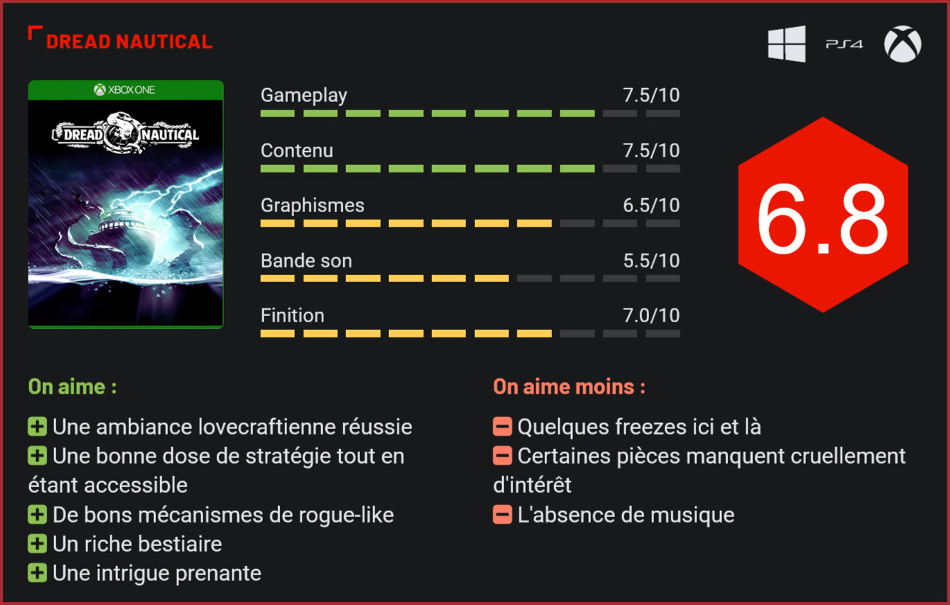 Initialement sorti sur smartphones en septembre dernier, Dread Nautical débarque sur PC et consoles de salon pour venir nous hanter… Un cadre et une ambiance particuliers Le joueur devra mener son enquête pour comprendre ce qu’il s’est passé sur le paquebot Hope. Alors que le paquebot de croisière Hope vogue sur l’Atlantique, de mystérieuses créatures apparaissent et s’en prennent aux passagers. La tranquille croisière se transforme alors en véritable cauchemar. En plus des créatures féroces apparues, les lois du temps et de l’espace semblent avoir été totalement renversées. Voilà le cadre dans lequel Dread Nautical plonge le joueur. Un contexte mystérieux qui emprunte largement aux histoires lovecraftiennes et à la légende de Cthulhu. Sous ses faux airs de petit jeu bon enfant, Dread Nautical dissimule en réalité une histoire intrigante et mystérieuse qui poussera les joueurs à explorer les différents niveaux du bateau pour comprendre quel mal cible le paquebot et son équipage. En plus d’enquêter sur ce qu’il se passe, le joueur devra retrouver les derniers survivants du navire et les mettre en lieu sûr ou les enrôler pour l’aider dans sa quête. La déconstruction du scénario est particulièrement intéressante et donne véritablement envie d’en savoir plus sur l’histoire. De plus, Zen Studios développe une atmosphère de mystère très bien maîtrisée, ainsi qu’une tension tout au long de l’aventure, malgré le nombre restreint d’intervenants. Mécanismes simples, mais efficaces L’aventure de Dread Nautical repose donc sur l’exploration du paquebot. Or, nous l’avons dit, le temps et l’espace ne fonctionnent pas comme dans notre réalité. Ici, les journées sont plus ou moins courtes et se ressemblent toutes. Les souvenirs des personnages ne sont pas fiables et ces derniers ne savent pas depuis quand ils sont là. Quant à l’espace, celui-ci n’en fait qu’à sa tête. À chaque nouvelle exploration, les différents niveaux prendront forme de manière aléatoire. Impossible de se fier à sa mémoire pour atteindre son objectif, la corne de brume pour appeler les secours. Au-delà de son aspect rogue-like, Dread Nautical prend la forme d’un tactique RPG au tour par tour. Ainsi, en parallèle de l’exploration, le jeu devra faire preuve de stratégie lorsqu’il croisera le chemin des nombreux monstres qui pullulent dans la vingtaine d’étages du navire. Passer sans être détecté, attaquer furtivement, fuir ? Le joueur aura parfois le choix, mais pas toujours. Si les créatures le repèrent, il devra utiliser avec sagesse ses points d’action pour se déplacer ou attaquer, tout en anticipant la réaction de ses adversaires. Cet aspect du jeu fonctionne plutôt bien, même si les monstres semblent nous repérer de manière aléatoire. On passe parfois aperçu alors qu’on passe vraiment à proximité d’eux, alors qu’à d’autres moments, ils font preuve d’une ouïe très fine. Le fait est que Dread Nautical intègre un bestiaire particulièrement diversifié. Monstres “basique”, énervé, mastodonte ou cracheur et leurs attaques rapides, incapacitantes, brutales, mortelles.se dévoilent très rapidement dans le jeu. Ils renforcent l’atmosphère tendue qui règne sur le bateau. La tension monte rapidement, notamment lorsque plusieurs monstres vous prennent en chasse. Pour y faire face, le joueur pourra compter sur un arsenal tout aussi diversifié. En progressant, il pourra récupérer du butin ici et là, notamment des armes (très diversifiées), des bandages et de quoi améliorer son équipement via sa base. Dans la cale du bateau qui sert de quartier général aux survivants, le joueur pourra effectivement améliorer ses armes et leurs caractéristiques via sa table de bricolage. Des aspects RPG plutôt classiques -le joueur y sera d’ailleurs confronté dès le début du jeu puisqu’il devra choisir entre 4 personnages types en fonction de leurs caractéristiques (vie, points d’action, bonus) – auxquels se rajoutent la faim et l’état d’épuisement psychologique de notre héros. En réalité, l’aventure que propose Dread Nautical est plutôt complète et complexe puisqu’il faudra prendre de nombreux éléments en compte pour mener à bien la survie de son héros. Ainsi, avant chaque nouvelle exploration, le joueur devra préparer l’équipement de son personnage, car il ne pourra emporter qu’un nombre limité d’objets. Il devra également faire des choix quand il tombera sur de nouvelles armes et accessoires. Mais ce n’est pas tout. Il faudra choisir son équipement et ses équipiers avec sagesse avant de se lancer dans un nouveau niveau. Le titre de Zen Studios se veut également stratégique lors des rencontres avec les survivants. Lorsque le joueur croisera un rescapé, il devra faire en sorte de choisir les bonnes réponses à lui donner pour s’assurer que celui-ci rejoigne le QG et fasse potentiellement équipe avec lui. Le joueur devra alors choisir les survivants qui l’accompagneront pour gravir les niveaux du paquebot en fonction de leurs caractéristiques, mais aussi les équiper et leur attribuer un rôle lors des combats. Sans ça, ça sera retour à la case départ et il faudra donc recommencer tout le niveau qui aura été généré une nouvelle fois de manière aléatoire. Et si ce survival-horror se révèle plutôt exigeant en mode normal tout en étant largement accessible, il l’est d’autant plus en mode difficile et “insane”. De quoi allonger la durée de vie de Dread Nautical qui demandera une quinzaine d’heures pour être terminé en mode normal. Des personnages sans voix S’ils parlent, les personnages de Dread Nautical ne bougent pas pour autant la bouche. Un choix qui renforce l’identité visuelle du jeu. Le moins que l’on puisse dire, c’est que Dread Nautical jouit d’une direction artistique qui lui est propre. Avec son univers
