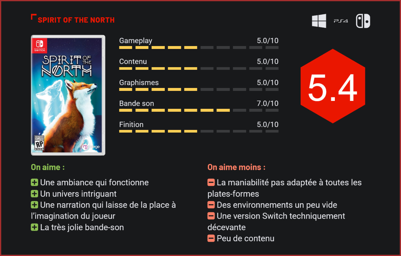 Développé par un studio indépendant basé aux Etats-Unis, Spirit of the North est un curieux mélange entre une expérience contemplative et un jeu de plate-forme/réflexion qui peine à convaincre. Spirit of the North est le tout premier jeu de Infuse Studio, un petit studio indépendant qui ne compte que quelques membres. Il s’agit d’un jeu d’aventure qui nous plonge dans la peau d’un renard roux dont le destin semble lié à une ancienne civilisation perdue, ainsi qu’à l’esprit d’un autre renard mystérieux. Le jeu est sorti en novembre 2019 sur PC et Playstation 4, il est ensuite ressorti sur Nintendo Switch en ce mois de mai 2020. Cette région renferme de nombreux mystères Dans Spirit of the North, direction les vastes étendues nordiques. Le joueur devra y suivre d’immenses fumées rougeâtres émanent d’un endroit lointain. Dès les premières minutes du jeu, les inspirations du jeu sont très claires. Spirit of the North emprunte vraisemblablement à des jeux de type “Walking simulator” comme Journey. Notre objectif durant une bonne partie de l’aventure va donc être d’explorer les différents environnements. On rentre très rapidement en contact avec l’esprit d’un autre renard qui nous guide vers les vestiges d’une civilisation perdue avant de nous donner ses pouvoirs. Spirit of the North n’est pas très bavard, il n’y a aucun dialogue et très peu de textes durant toute l’aventure. La mise en scène est également très minimaliste. Cela ne l’empêche pas de raconter une histoire à travers ses quelques personnages et surtout grâce à ses environnements. Le jeu nous donne l’occasion de traverser quelques lieux différents où nous pouvons trouver de nombreuses pierres gravées qui donnent des indices sur cette civilisation disparue. Spirit of the North ne nous donne jamais clairement sa version de l’histoire, ce qui permet de laisser libre cours à l’imagination du joueur pour comprendre ce qui se passe et ce qu’il s’est passé à l’époque de cette autre civilisation. L’univers du jeu devient donc un puzzle à reconstituer à coups d’hypothèses, ce qui fonctionne très bien et est en accord avec ses mécaniques de Walking simulator. L’ambiance de Spirit of the North est particulièrement réussie. En particulier grâce à sa bande-son maîtrisée. On sent un soin tout particulier apporté aux ambiances sonores et aux bruitages tandis que les musiques sont aussi très belles. La direction artistique est impeccable. Les décors sont inspirés de paysages de l’Islande, ce qui donne un cachet “nordique” au jeu qui est bien appréciable. Spirit of the North se dote donc d’un côté contemplatif bien rodé. Le problème avec cette approche contemplative c’est que l’aspect visuel du jeu devient un élément primordial pour apprécier le titre. Hors, cette nouvelle version Switch n’est malheureusement pas à la hauteur. Si les versions PC et PS4 s’en sortent bien avec une technique plus qu’honorable, la version Switch souffre de nombreux problèmes. À commencer par un très gros downgrade graphique qui est flagrant. De nombreuses textures et animations semblent datées et les problèmes de clipping sont légion. Le jeu est également beaucoup moins fluide sur Switch et jouer en mode portable n’est pas très agréable. Cette version devient donc la plus dispensable de toutes. La version Switch n’est malheureusement pas très belle Mais Spirit of the North n’est pas juste un Walking simulator, le jeu possède également des phases de plate-forme et des énigmes. À partir du chapitre 3, votre renard pourra utiliser des pouvoirs. On peut puiser de l’énergie dans des fleurs bleues et le but sera souvent de reverser cette énergie dans des stèles pour ouvrir un passage vers la suite. Vous obtiendrez d’autres pouvoirs au fil du jeu comme par exemple la possibilité de séparer votre âme de votre corps physique pour activer plusieurs mécanismes en même temps. Ces énigmes restent assez simples mais ont parfois un côté frustrant à cause de l’exigence que certaines d’entre-elles demandent. Il faudra parfois exécuter certaines actions avec un timing serré. Il y aura également quelques passages de plate-forme, mais la maniabilité est assez imprécise. Le renard est assez lourd à contrôler et il est impossible d’ajuster la direction du personnage en plein saut. Le jeu possède également des “collectibles” sous forme de bâtons à ramener à ce qu’il reste de leurs propriétaires, ce qui permettra de libérer leurs âmes. Ces collectibles débloquent des apparences différentes pour votre renard, mais c’est à peu prêt tout le contenu annexe qu’il y a dans le jeu. Cela rend Spirit of the North assez court, comptez environ 5h pour le terminer. Cet aspect plate-forme et énigme n’est malheureusement pas très engageant. Il n’y a pas de punitions ni de challenge mais pourtant le jeu reste assez frustrant. Les seules traces de challenge sont liées à la maniabilité qui manque de précision et certaines énigmes tendues. Cependant, cela ne nous empêche pas d’être porté par l’expérience que nous offre Spirit of the North. On en vient à regretter que le jeu n’assume pas son côté Walking simulator jusqu’au bout puisque c’est, sans aucun doute, l’aspect qui fonctionne le mieux. Conclusion Spirit of the North est un étrange mélange entre un Walking simulator et un jeu de plate-forme/réflexion où l’on incarne un renard dans un univers empli de mystères. Le premier jeu d’Infuse Studio n’arrive malheureusement pas à convaincre entièrement. Son aspect Walking simulator fonctionne véritablement grâce à ses décors mystérieux et son univers enchanteur. Grâce à sa direction artistique et à sa bande-son réussie, son ambiance se démarque des autres jeux du genre. Sa narration cryptique qui laisse de la place à l’imagination du joueur est un v
