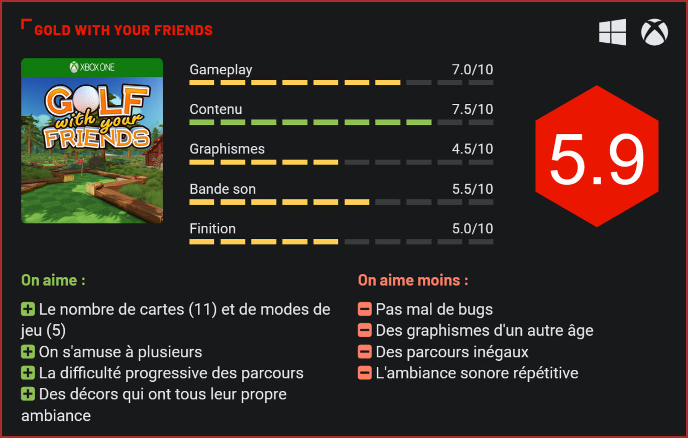 En accès anticipé depuis 3 ans sur Steam, Golf With Your Friends a enfin droit à une sortie officielle et sur consoles de salon. Un party-game sur fond de mini-golf au potentiel de fun insoupçonné. Plus que du mini-golf Gold With Your Friends ne se limite pas au mini-golf et propose plusieurs modes de jeu fun et amusants. Golf With Your Friends est – sans surprise – un jeu de mini-golf amusant qui propose aux joueurs de s’affronter sur le « green ». Avec ses onze cartes thématiques, le titre de Blacklight Interactive dispose d’un vrai potentiel de fun. Chacune dispose de son propre univers visuel, mais aussi de ses parcours à la difficulté progressive. Il n’est pas juste question d’envoyer sa balle dans le trou, mais de prendre en compte les différents obstacles plus ou moins élaborés pour y arriver. Ces derniers sont d’ailleurs très diversifiés et varient en fonction du thème de la carte. On est véritablement surpris de la richesse des parcours et on se surprend à réellement s’impliquer pour terminer les 18 trous en moins de tirs possibles. Le jeu fait en réalité beaucoup appel à la logique des joueurs. Il est d’ailleurs possible de prendre quelques secondes pour visualiser les parcours dans leur globalité pour établir une stratégie de jeu si on ne veut pas enchainer à l’infini les tirs pour arriver au drapeau. Golf With Your Friends est moins un jeu de golf qu’un jeu de logique, voire de plateforme à certains moments. Preuve que le titre n’est pas qu’un simple jeu de golf avec ses cinq modes de jeu. Au-delà du mode classique qui correspond à une compétition pure et simple avec un chrono, le jeu propose également d’explorer les différents parcours en vue de se préparer à la compétition classique. Le mode Dunk propose de faire rentrer la balle de golf dans un panier de basketball placé en hauteur – pourquoi pas. Dans le mode Hockey, la balle se transforme en palet qu’il faut faire rentrer dans un goal. Enfin, le mode groupe qui reprend les bases du mode classiques avec des bonus à activer sur le green. Et s’il ne se limite pas à être qu’un simple jeu de mini-golf, le titre de Blacklight Interactive n’en reste pas moins exigeant. Comme d’autres jeux du genre, il faudra viser avec précision et surtout avec la bonne puissance modulable grâce à une barre de force pour parvenir à atteindre la cible, le tout en vision à la première personne. Un point qui ne gêne aucunement l’expérience. La prise en main n’en reste pas moins très facile. Des parties et des balles personnalisables Les parties sont entièrement personnalisables. Pour ajouter un peu plus de fun, Golf With Your Friends intègre également un système de personnalisation de la balle de golf (couleur, chapeau, petit personnage, effet de tir). Un aspect qui prend principalement sens lorsqu’on joue à plusieurs et qui n’a pas d’autre intérêt que son côté amusant. Cerise sur le gâteau, le jeu propose aux joueurs de paramétrer totalement ses parties, quitte à créer des compétitions à part entière avec un nombre limité de tirs possibles, avec des bonus, un mode collision, etc. Comme son nom l’indique, Golf With Your Friends est avant tout un jeu qui se joue à plusieurs en local ou en ligne, même s’il est possible de s’entrainer en solo. Avec son nombre et sa diversité de mondes qui comprennent chacun 18 trous, le titre a de quoi animer les soirées entre amis. Le potentiel de fun et de jouabilité du titre fera presqu’oublier les graphismes datés et son prix de 20 euros sur consoles de salon. Graphiquement daté S’il ne brille pas par ses graphismes, Golf With Your Friends propose différents biomes propres et fun. Le plus gros défaut du jeu reste ses graphismes. Techniquement, c’est daté, pour ne pas dire moche. Les décors manquent de détails, et l’aspect cartoon joue les cache-misère. La finition n’est pas non plus exemplaire. Souvent, la balle de golf répond avec un temps de latence, à certains moments elle ne répond tout simplement plus. Il faut alors relancer le jeu. Ce n’est globalement pas très joli, même si le titre profite d’une diversité visuelle impressionnante grâce à ses 12 cartes (forêt, Égypte ancienne, manoir hanté, etc.) composées de 18 trous chacune. On notera par exemple comment les développeurs de Blacklight Interactive sont parvenus à retranscrire parfaitement l’univers des Worms dans ce jeu de golf. Les mines, missiles et les fameuses bombes Hallelujah sont de la partie et sont véritablement intégrées au jeu puisqu’elles envoient notre balle dans le décor au moindre contact. Le jetpack fait également partie des accessoires disponibles. Pour ce qui est de l’ambiance sonore, si le studio a tenu à proposer une ambiance musicale en adéquation avec les différentes cartes – ce qui est évidemment un bon point –, on regrette que celle-ci se limite à un thème unique qui se répète en permanence. Enfin, côté bruitage, ces derniers sont assez peu nombreux, mais coïncident parfaitement avec l’environnement ou les différentes actions des joueurs ou des décors. Conclusion Sous ses airs de petit jeu de mini-golf banal, Golf With Your Friends dispose en réalité d’un vrai potentiel de fun. Avec ses nombreuses cartes composées de multiles parcours et ses différents modes de jeu, le titre de Blacklight Interactive a de quoi occuper les joueurs en solo ou en multi, jusqu’à 12 joueurs en local ou en ligne. Le fun est là. Côté technique en revanche, ce n’est pas fameux. Si les univers disposent chacun de leur propre identité visuelle, on regrette que les graphismes soient aussi datés. La finition est également loin d’être à la hauteur, avec de multiples bugs qui viennent entraver le plaisir de jeu. S’il peut paraître un peu cher, le jeu a le mérite d’être intégré à l’offre GamePass. Pratique pour l’essayer sans devoir débour