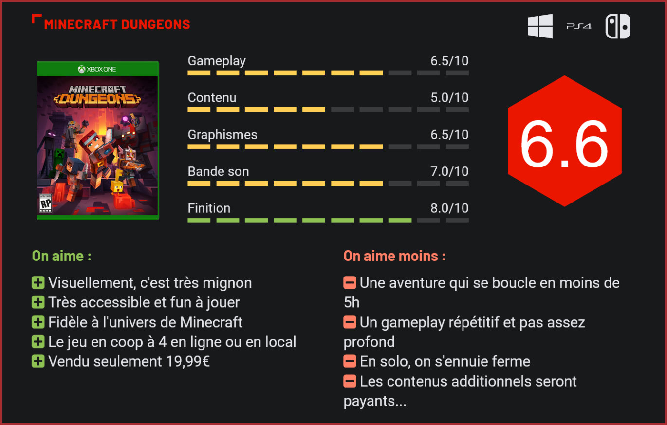 Attendu au tournant, le premier “vrai” spin-off de Minecraft s’inspire des Diablo et autres hack & slash pour proposer une expérience radicalement différente, basée sur la coopération des joueurs. Cette fois, pas de craft ni de construction. Minecraft Dungeons est un Diablo-like dans la plus pure tradition du genre qui propose au joueur de partir en raids avec des amis pour massacrer diverses créatures de l’univers de Minecraft, récolter des ressources et récupérer des armes toujours plus puissantes. Visuellement, ça reste très fidèle à Minecraft. Proposé à 19,99€ – un tarif qui donne franchement envie de craquer, ne serait-ce que pour essayer -, le jeu de Mojang se distingue des autres hack & slash par son orientation qui est très axée sur son mode multijoueurs. N’ayons pas peur de mettre les pieds dans le plat directement : on s’ennuie assez vite en solo, et à plusieurs, le jeu a tendance à être beaucoup plus fun ne serait-ce que pour ses affrontements de boss qui vous forceront à venir en aide à vos amis, ou la compétition qui s’installe très vite pour récupérer le meilleur matos. Car oui, il faudra être plus rapide que les autres, un peu comme dans Gauntlet. Si vous êtes un joueur de Minecraft, il est toutefois fort probable que vous ne compreniez pas la référence. Pour en revenir au jeu, donc, Minecraft Dungeons se positionne comme un couch-coop fun, qui se joue jusqu’à quatre en local ou en ligne. On fonce dans des décors assez linéaires, mais variés et inspirés de l’univers de Minecraft en massacrant tout ce qui se présente, en ce compris les veaux et moutons, qui serviront à récupérer un peu d’énergie. Une grosse partie du gameplay repose sur les affrontements, mais aussi l’exploration des niveaux, qui comportent des zones secrètes et coffres à débloquer. Certains niveaux se termineront avec un combat de boss, souvent grandiose. Le jeu a été vraiment pensé pour la coop’, mais il est possible d’y jouer aussi seul… Malheureusement, les niveaux sont courts et assez dirigistes. Il n’y a pour ainsi dire pas de quête annexe et si le jeu est très accessible, il manque cruellement de profondeur. C’est d’ailleurs la raison pour laquelle en solo, la formule ne fonctionne qu’à moitié. A plusieurs, c’est plus fun, surtout quand on relève le niveau de difficulté, mais cela n’empêche que les mécanismes du jeu restent très simples et le gameplay très limité. Concrètement, il y a une touche pour frapper (quelle que soit l’arme au corps à corps), une pour envoyer une flèche, et puis différents raccourcis pour la potion, l’appel d’un familier qui vient vous aider ou différents sorts. Ca fonctionne, mais il n’y a pas par exemple de système de combo. Dans le même ordre d’idée, les interactions avec les PNJ se réduisent ici à l’achat de “pochettes surprises”, qui permettent de récolter un équipement aléatoire grâce à une monnaie virtuelle – qu’on ne peut dieu merci pas acheter in-game, juste accumuler à travers les niveaux. Le campement vous permettra ainsi de récupérer quelques nouveaux objets auprès de marchands. Et puis, c’est à peu près tout ce que le jeu a à proposer… Etalé sur une période 5h tout au plus. Oui, Minecraft Dungeons est très court. Et oui, il y aura des DLC payants. C’est d’ailleurs ce qui explique le tarif du jeu, vendu 19,99€. Les deux premiers DLC devraient être offerts aux acheteurs de l’édition spéciale, vendue 29,99€. Faites le calcul. Les décors sont plutôt variés. Que peut-on donc reprocher objectivement au jeu? L’absence de classe sans doute, un classique pourtant pour le genre, de combos également, qui auraient apporté un réel plus à l’aventure. Et puis, un level-design plus riche, qui ressemble moins à de longs couloirs, avec peut-être des niveaux plus ouverts, des quêtes secondaires. Minecraft Dungeons est trop facile et pas assez varié. Si, d’un côté, on apprécie sa très grande accessibilité, qui permettra tant aux plus petits qu’aux plus grands d’y jouer, sa longévité s’en trouve très limitée. On y rejouera sans doute une seconde fois, dans un mode de difficulté plus élevé, mais pas forcément plus. Sur Xbox et PC, le jeu a l’avantage d’être intégré au Gamepass. Il ne faudra être donc qu’abonné au service pour pouvoir y jouer. Inutile de le préciser, il s’agit d’un très gros plus car comme nous l’avons dit, Minecraft Dungeons n’est pas forcément le genre de jeu sur lequel on revient très souvent… Difficile toutefois de critiquer l’approche de Mojang, qui a su rendre accessible un genre aux plus jeunes, tout en respectant l’univers de Minecraft. Techniquement, le jeu est très réussi : très peu de bugs, de ralentissements, une optimisation poussée, une bande son efficace avec un thème principal accrocheur et un univers travaillé. Minecraft Dungeons n’est toutefois pas vraiment ce qu’on pourrait appeler une claque graphique compte tenu de ses décors volontairement pixélisés. Conclusion Avec Minecraft Dungeons, Mojang livre un spin-off très séduisant à son hit planétaire. Minecraft Dungeons rend accessible à tous un style de jeu qui s’adressait jusqu’ici à une niche. Il est non seulement très fun mais également accessible. Contrairement aux autres Diablo-likes, il se joue toutefois de préférence à plusieurs, en coopération. Fidèle à l’univers de Minecraft avec ses graphismes pixélisés et son humour particulier, Minecraft Dungeons manque toutefois cruellement de substance, avec son gameplay trop simpliste, son contenu très léger (comptez 5h max pour le boucler) et son manque d’ambition dans sa construction. Trop souvent, le jeu se réduit à du massacre de créatures en ligne droite. Seuls les boss apporte un peu d’intensité à l’aventure, très répétitive par essence. Certes, il n’est proposé qu’à 1