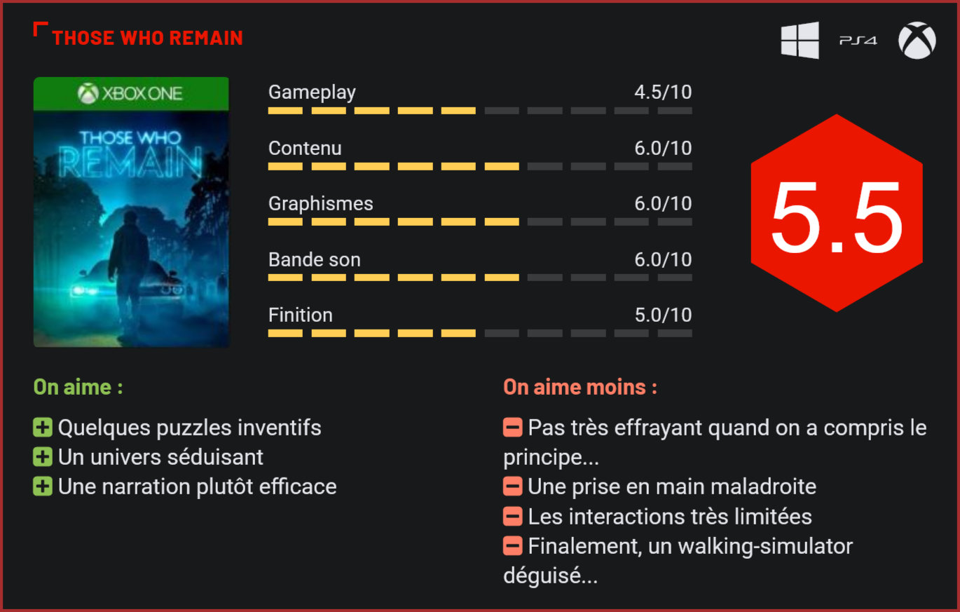 Après Someday You’ll Return et Infliction, un autre thriller psychologique se profile déjà sur PC et consoles. C’est au petit studio américain Camel 101 que l’on doit ce nouveau thriller psychologique à l’ambiance très sombre, qui rappelle parfois Alan Wake de par sa conception et ses décors. Direction en effet l’Amérique profonde dans ce jeu, qui vous propulse dans la peau d’Edward, un jeune homme suicidaire sur le point de passer à l’acte dès la première minute de jeu, qui change finalement ses plans pour retrouver sa maîtresse dans un motel. Sur place, l’homme se rend compte que le lieu est désert. Il devra enquêter dans le petit village de Dormont sur la disparition des villageois et tenter en parallèle de se rappeler les tristes souvenirs de son existence… Les décors du jeu sont sombres, mais soignés. Si vous vous attendiez à un survival-horror, vous risquez d’être déçu. Sans surprise, Those who Remain se rapproche en effet davantage d’un walking-simulator que d’un clone de Resident Evil ou d’Alan Wake. Il y a certes un peu d’action, mais le tout est généralement très scripté. Il ne faudra pas s’attendre ici à des gunfights mais de longs trajets à pied, quelques résolutions d’énigmes et quelques jolis échanges narratifs. Si l’atmosphère du jeu est soignée, son gameplay l’est beaucoup moins. La jouabilité très lourde du jeu – même au pad -, en fait un titre pas très agréable à prendre en main. Les commandes manquent terriblement de précision et de façon générale les interactions avec les objets restent très limitées. Vous pouvez par exemple soulever pratiquement n’importe quel objet et le balancer où vous voulez, mais c’est à peu près tout… Ces terrifiantes créatures vous suivront partout… Tout le gameplay du jeu se fonde sur l’usage de la lumière. Car ici, l’obscurité cache les ombres de créatures à l’apparence humaine qui vous déchiquèteront si vous tentez de les approcher. Pour avancer, il faudra suivre les éclairages, allumer des lampes et remettre en place des ampoules. Le concept est séduisant, mais dans la pratique, on finit vite par ne plus vraiment s’occuper des ombres, qui resent bêtement immobiles dans le noir. La tension est souvent proche de zéro. Et c’est finalement là tout le problème dans ce survival qui manque de frissons. Pour varier les plaisirs, les développeurs ont bien pensé à nous faire revivre les mésaventures du héros à travers une série de flashbacks dans un monde fantastique. Le résultat est plutôt convaincant, même si là aussi, le tensiomètre est proche de zéro. En revanche, là où le jeu fait mouche, c’est dans ses énigmes parfois très inventives, qui vous forceront à faire des allers-retours, activer des objets et à être parfois très perspicace. Quelques passages vont grimper un peu le tensiomètre, mais globalement, le jeu n’est pas très effrayant… Finalement, malgré son univers soigné et les tentatives des développeurs de créer une atmosphère pesante, Those Who Remain ne parvient pas franchement à convaincre, la faute à des mécanismes de jeu qui manquent souvent de naturel et un gameplay trop bancal. C’est et cela reste un walking simulator, un peu plus inventif que la moyenne mais qui n’en reste pas moins très dirigiste dans sa conception. Côté réalisation, on trouve du très bon (l’éclairage, certains effets visuels et l’atmosphère globale), et du très mauvais (la modélisation des visages, certains rendus, certains décors). S’il n’est pas vendu très cher, Those Who Remain reste un jeu qui aurait mérité quelques mois de plus de travail, ne serait-ce que pour en peaufiner le gameplay ou la réalisation. En l’état, le titre reste séduisant pour les mordus du genre, mais ne parvient jamais vraiment à impressionner. Conclusion Séduisant sur le papier avec son univers sombre qui rappelle celui d’Alan Wake et son scénario ambitieux, Those Who Remain ne parvient toutefois pas à convaincre, la faute à des mécanismes de jeu qui restent trop simples. Comme tous les walking simulators, le jeu de Camel 101 s’emmêle les pinceaux très rapidement avec sa progression très linéaire. Si l’on apprécie la richesse des énigmes, le jeu ne parvient pas vraiment à effrayer, et pour cause puisqu’une fois qu’on a compris le principe, on ne se laisse plus trop surprendre. Techniquement, ce n’est pas non plus extraordinaire, même s’il faut bien l’admettre, l’univers du jeu a une certaine dégaine. Trop ambitieux sans doute, le jeu de Camel 101 a toutefois le mérite de bénéficier d’un scénario intéressant à suivre, et plutôt joliment mis en scène.