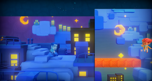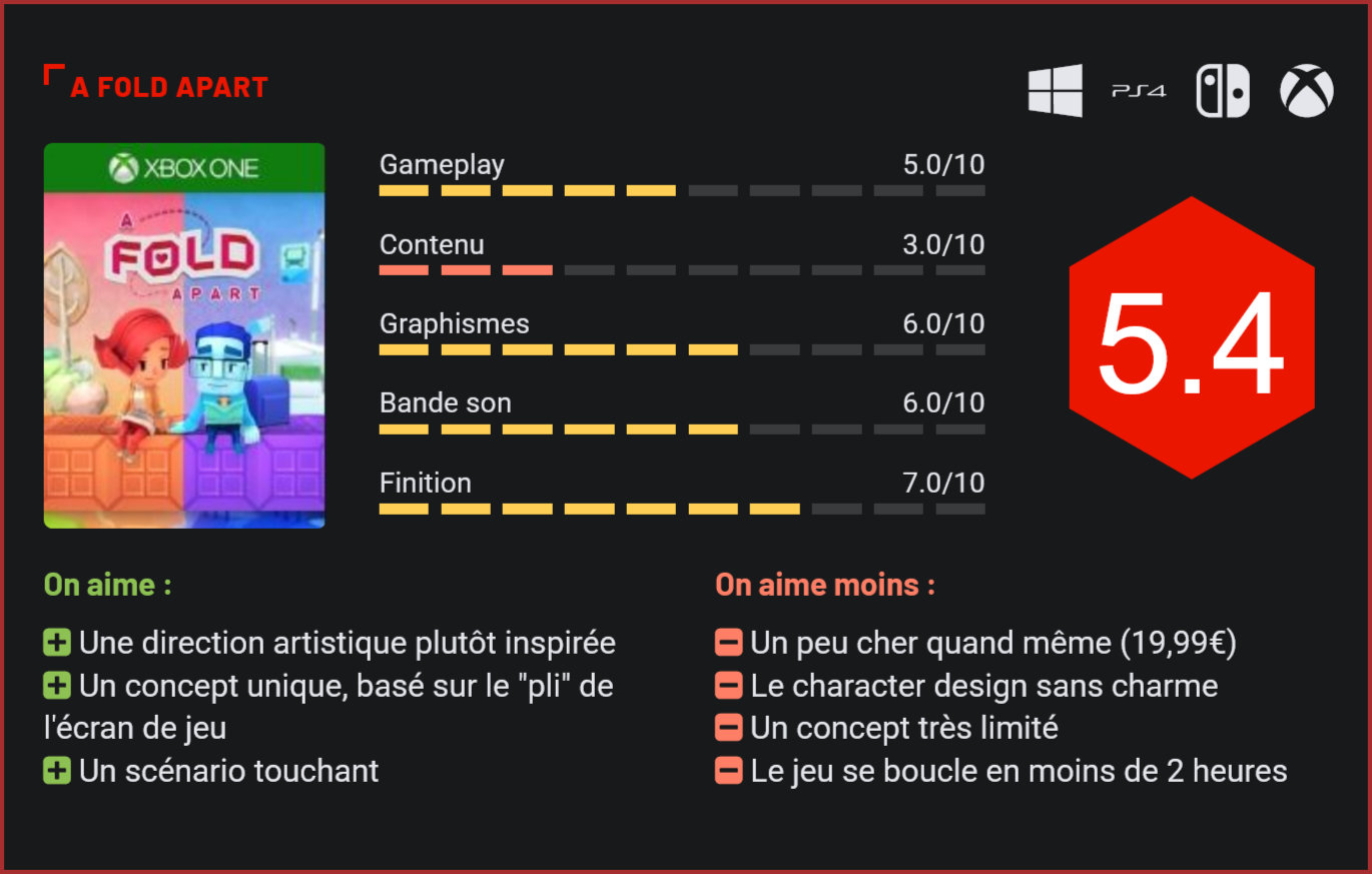 Premier projet du tout petit studio Lightning Rod Games, A Fold Apart se situe à mi-chemin entre le jeu de plates-formes et le puzzle-game. On ne l’attendait pas forcément au tournant. A Fold Apart faisait en effet partie de ces sorties-surprises du mois de mai 2020. Atypique, le jeu de Lightning Rod Games propose une expérience unique avec un concept qui mêle brillamment plateformes et puzzles. La narration est au cœur de l’expérience. Dans A Fold Apart, le joueur suit les difficultés d’un couple en relation longue-distance. Les deux amoureux tentent malgré leurs différences de rester en contact. Le jeu nous présente la relation sous la forme d’échanges par SMS. Une approche originale et brillante, d’autant plus que l’écriture est excellente. Le titre parvient également à sortir des sentiers battus en illustrant les difficultés du couple à communiquer. Certains messages causeront une panique chez chacun deux protagonistes. Le jeu se transformera alors en puzzle-game dans lequel il faudra user et abuser du “pli” pour progresser, tout en lisant les pensées du personnage qui s’affichent à l’écran. Tout le gameplay d’A Fold Apart se base sur un concept atypique. A la base, il s’agit d’un platformer très simple – presqu’un walking simulator en 2D. Le joueur doit résoudre des petites énigmes en pliant l’affichage 2D de l’écran et en faisant interagir ainsi différents plans pour modifier l’univers du jeu et le niveau. Un trou empêche votre personnage d’avancer? En pliant le plan, vous ferez apparaître un nouveau décors qui vous permettra de franchir l’obstacle. Le concept est séduisant, même s’il reste globalement très simple. Le tuto vous apprendra tout du concept atypique du jeu. Car c’est finalement le principal défaut de cette petite production indépendante. S’il est original, A Fold Apart montre très vite ses limites. Le gameplay est limité, la difficulté relativement faible et on finit le jeu en 2 heures top chrono. A 19,99€, c’est un peu cher tout de même. D’autant plus que l’on finit vite par se lasser par le gameplay répétitif du jeu. Pour autant, tout n’est pas à jeter dans ce platformer atypique. Son scénario touchant explore parfaitement les difficultés rencontrées par les couples à longue distance. Sa direction artistique très originale rappelle parfois celle d’un Là-haut. C’est mignon, coloré et plutôt joli, sauf peut-être pour ce qui est des personnages, au look, il faut le reconnaître, pas franchement inspiré. Malgré son concept ingénieux, A Fold Apart ne parvient donc pas vraiment à convaincre. A 5€, le jeu mérite le détour, ne serait-ce que pour son scénario des plus originaux. Au-delà, cela fait quand même cher l’heure de jeu. Conclusion Avec son concept atypique, A Fold Apart se présente comme un petit puzzle-game très séduisant. Tout le gameplay du jeu se base sur le fait de pouvoir plier le plan 2D dans toutes les directions pour redessiner le niveau et permettre à son personnage de progresser. Malheureusement, on fait assez vite le tour du propriétaire. Le jeu se plie en moins de 2 petites heures et le gameplay peine à se renouveler dès la première demi-heure. A Fold Apart parvient toutefois à nous surprendre dans sa narration, avec son histoire de relation à longue-distance brillamment présentée à travers des échanges de SMS. C’est mignon, coloré, touchant, et à 5€, le jeu aurait sans doute fait mouche. A 19,99€, A Fold Apart a beaucoup plus de mal à convaincre…