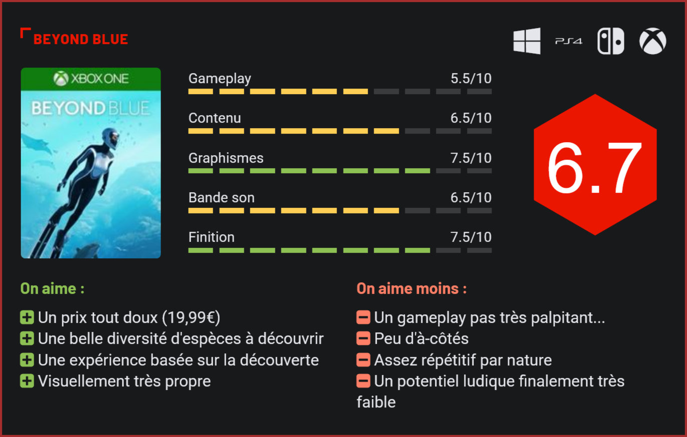 Avec Beyond Blue, le petit studio de développement E-Line Media nous propose de partir à la découverte des fonds marins dans un jeu qui se veut avant tout immersif. Les jeux de plongée sous-marine ne sont pas légion. Les quelques rares représentants du genre ont jusque là eu beaucoup de mal à convaincre, en s’orientant davantage vers le contemplatif que la simulation pure. Avec Beyond Blue, E-Line Multimedia dit vouloir rendre hommage aux océans en s’inspirant des documentaires cultes de la BBC. L’expérience de jeu est avant tout contemplative. Pas de simulation donc, mais une sorte de “walking simulator” aquatique, dans lequel la narration tient le joueur scotché à son pad. L’aventure nous propose en effet d’incarner une plongeuse expérimentée qui a accepté de rejoindre un projet innovant de live-streaming sous-marin. Chacune des plongées sera l’occasion pour le joueur d’explorer différents océans, à la recherche de créatures emblématiques des fonds marins, des baleines à bosses aux dauphins. On ne vas pas vous le cacher, le gameplay reste rudimentaire. La plupart du temps, vous vous contenterez de vous rendre d’un point A à un point B en scannant tout ce qui passe sous votre regard pour répertorier les espèces sous-marines. Occasionnellement, il faudra appuyer sur un bouton de la manette pour récupérer un objet ou activer une balise, mais c’est à peu près tout. Ne vous attendez pas à de grands frissons : vous ne serez pas pourchassé pas des requins ni surpris par un alligator. Beyond Blue est un jeu très chill et finalement très contemplatif. Les espèces animales sont nombreuses et fidèlement représentées. Paradoxalement, c’est le principal reproche qu’on lui fera également. A moins d’être réellement passionné par la vie marine, difficile de ne pas ressentir un profond ennui dans le jeu, dès la seconde plongée. Car certes, certains panoramas sont très jolis, mais il n’y a finalement pas grand chose à faire – et zéro challenge. Le côté ludique du jeu est complètement laissé de côté. On ne s’étonnera d’ailleurs pas non plus que le titre ait vu le jour plus tôt sur Apple Arcade… Dès les premières secondes de jeu, on sent qu’on est en contact avec un jeu très facile à prendre en main, qui a clairement été pensé pour le mobile. Pour les passionnés de plongée sous-marine, le jeu n’en reste pas moins intéressant car Beyond Blue se révèle être une véritable encyclopédie de savoir. Les informations à collector sont nombreuses, les plongées permettent de découvrir de nombreux environnements différents et l’histoire est intéressante à suivre… si tant est que le concept vous plaise. Plusieurs environnements sont à découvrir. Techniquement, Beyond Blue s’en sort également plutôt bien avec ses vastes décors sous-marins à explorer, souvent très colorés. La direction artistique du jeu est superbe et le rendu se rapproche souvent du photoréalisme. Les animations donnent également brillamment vie à l’univers sous-marin, plus réaliste que nature. De façon générer, le rendu apparaîtra comme très joli sur un écran HDR. On se surprend également à explorer le catalogue musical du jeu, qui intègre quelques jolis morceaux. Autre bonne surprise : Beyond Blue est rempli de bonus à débloquer, principalement des vidéos de très haute qualité qui vous en apprendront plus sur les fonds marins. Là aussi, les passionnés seront aux anges. On regrette en revanche qu’en dehors des plongées, les à-côtés soient aussi limités. Il n’y a finalement pas beaucoup de choses à découvrir par soi-même dans le jeu en dehors du scan de toutes les espèces animales… De façon générale, Beyond Blue est également horriblement répétitif dans sa construction et gâche un joli potentiel ludique. On aurait aimé découvrir quelques activités un peu plus originales, qu’il s’agisse de courses sous-marines, de défis ou d’affrontements… Les puristes vous diront que là n’était pas le but. Mais il n’empêche qu’il n’y a pas grand chose à faire dans ce jeu en dehors de la trame narrative principale… Au vu de son prix (19,99€), ce n’est pas bien grave, mais ne vous attendez clairement pas à y passer des dizaines d’heures. Conclusion S’il n’a finalement qu’un très maigre potentiel ludique, Beyond Blue n’en reste pas moins un jeu fascinant pour les amateurs de plongée sous-marine. Le jeu d’E-Line Media propose une expérience très contemplative à travers ses superbes panoramas sous-marins. On y scanne différentes espèces, récolte des informations et débloque des vidéos qui nous en apprennent davantage sur la plongée sous-marine. Bien que limité, le concept est intéressant. D’autant plus que visuellement, Beyond Blue est une jolie réussite. Reste qu’on s’ennuie malheureusement assez vite dans cet univers pourtant plein de vie. Si on finit assez vite le tour du propriétaire, Beyond Blue a le mérite d’être vendu à un tarif très attractif de 19,99€. Une bonne raison de céder aux charmes du grand bleu?
