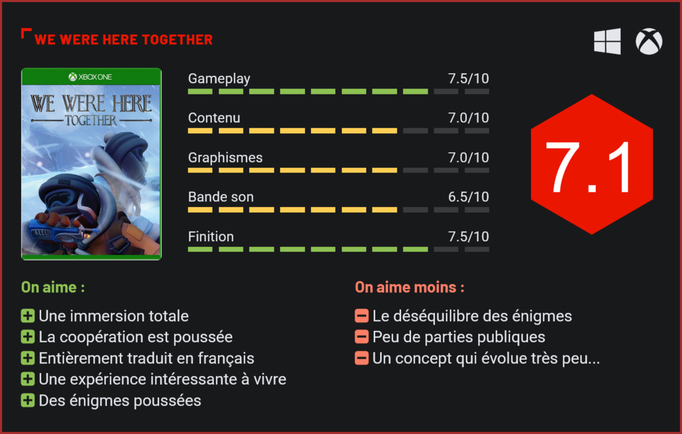 Un an après sa sortie sur PC, We Were Here Together part à la conquête des consoles de jeu avec une sortie sur Xbox. Le jeu coopératif du studio néerlandais Total Mayhem Games est une jolie réussite. Mais encore faut-il trouver un compagnon de jeu avec qui y jouer. Troisième volet de la saga des We Were Here, cet épisode repose sur le même principe que les deux autres ; la résolution d’énigmes et de puzzles sur fond de coopération en duo. Un concept que le studio néerlandais Total Mayhem Games a de nouveau brillamment exploité ici. S’il prend de l’ampleur au bout de quelques chapitres, le scénario n’en reste pas moins léger en comparaison du gameplay. On le mettra d’ailleurs facilement de côté pour se concentrer sur les énigmes. Sans grande introduction, We Were Here Together nous plonge au cœur d’une exploration qui a mal tourné en Antarctique. Plusieurs membres de notre groupe se trouvent dans une situation délicate, bloqués dans la neige suite à un incident. Incarnant un explorateur, le joueur doit collaborer avec le second membre de l’exploration resté à l’abri au campement pour venir en aide à leurs collègues en péril. Une mission qui obligera les deux individus à collaborer pour résoudre différentes énigmes et puzzles afin de rejoindre les explorateurs disparus. Pour y parvenir, les deux joueurs pourront compter sur leur talkie-walkie pour communiquer à distance et ainsi résoudre les énigmes et puzzles qui leur font obstacle. La communication est d’ailleurs au cœur de l’aventure. Chaque joueur devra faire preuve d’écoute pour comprendre ce à quoi son équipier fait face, mais aussi de précision lorsqu’il détaillera sa situation à l’autre. Une tâche qui ne sera pas toujours facile. Cet aspect, central au jeu sera d’ailleurs influencé par les équipes que formeront les joueurs, mais on y reviendra. Dans tous les cas, cette contrainte de s’écouter et de travailler ensemble est très intéressante et fonctionne très bien dans le jeu. On sent que celui-ci a été développé dans ce but. Tout est pensé pour que les joueurs parlent et réfléchissent ensemble pour progresser. La difficulté des énigmes varie énormément, allant du très simple au très complexe. L’aventure proposée par We Were Here Together repose donc sur la résolution d’énigmes et de puzzles en coopération. Un concept particulièrement bien intégré au jeu puisque chaque chapitre proposera un ou plusieurs casse-têtes. Leur résolution varie énormément en fonction de leur difficulté, mais aussi de la capacité de communication des deux coéquipiers. Cela aura un vrai impact sur la progression. De plus, bien communiquer ne sera pas suffisant, il faudra également se montrer très observateur. Certaines pièces du puzzle se cachant dans l’environnement. On regrettera d’ailleurs un certain déséquilibre entre les différentes énigmes. Certaines peuvent être résolues en quelques minutes seulement, alors que d’autres exigeront une réflexion plus poussée. Cela peut évidemment devenir très frustrant. Ajoutez à cela des séquences qui ne se lancent pas parce qu’on n’a pas fait exactement ce qu’il fallait dans l’ordre et on peut rapidement tourner en rond sans savoir quoi faire. Le jeu ne nous aide pas vraiment, voire pas du tout en fait. On est laissés à nous-mêmes, comme les deux explorateurs en mission que l’on incarne. Forcément, la durée de vie du jeu variera en fonction de la rapidité avec laquelle les joueurs parviendront à aller au bout des énigmes et autres casse-têtes. Les adeptes des escape games iront sans doute plus vite que des joueurs lambdas. Avec une dizaine de chapitres comprenant parfois plusieurs énigmes, l’aventure de We Were Here Together pourra se terminer entre deux et trois heures en fonction des joueurs. Cela peut évidemment prendre plus de temps si les joueurs ne coopèrent pas bien ou, tout simplement, parce qu’ils ont du mal avec les casse-têtes qui, nous l’avons dit, varient du très simple au très compliqué. Mais une fois qu’on a trouvé comment résoudre les énigmes, difficile d’imaginer qu’on puisse renouveler l’expérience. Le charme du jeu est rompu. À moins d’être un bon samaritain désireux de venir en aide aux joueurs en galère, la rejouabilité de We Were Here Together est plutôt limitée. Une petite tâche sur le tableau en comparaison à l’expérience de coop’ que représente le jeu. Pour une dizaine d’euros, le contenu est donc plutôt convaincant. Coopérer avec des inconnus pour résoudre des énigmes n’est pas forcément au goût de tout le monde. Bien que le jeu mise énormément sur la coopération, tous les joueurs ne sont pas forcément prêts à faire équipe avec des inconnus pour se lancer dans l’aventure. Quand on lance le jeu sur Xbox One, on aperçoit une liste de parties en cours ou en attente de joueurs. Malheureusement, la très grande majorité d’entre elles sont privées, on ne peut donc pas y entrer n’importe comment, il faut recevoir une invitation. Si on veut se lancer dans l’aventure avec un ou une inconnue, il faudra s’armer de patience. Nous avons attendu de (très) longs moments avant de pouvoir intégrer une partie. De même lorsque nous en avons créé une, personne ne nous a rejoint. La communauté du jeu est assez réduite et il faudra principalement compter sur un pote pour y jouer… On pourra toujours se tourner vers le matchmaking aléatoire, bien que le problème de la langue puisse se poser. On peut en effet choisir deux langues pour rejoindre une partie, le français et l’anglais par exemple, histoire de pouvoir communiquer avec notre coéquipier. Malheureusement, le niveau de chacun dans l’une ou l’autre langue aura forcément un impact sur la qualité de la communication et donc de la résolution d’énigmes. Les environnements sont jolis, mais manquent cruellement de finition