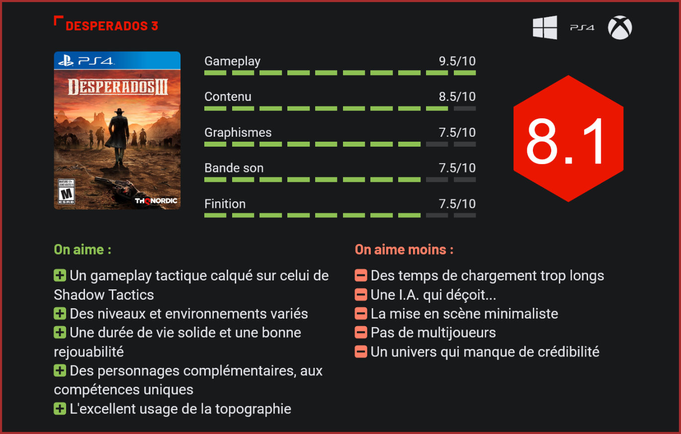 Treize longues années après son dernier épisode, la série Desperados fait un retour fracassant sous la direction du petit studio allemand Mimimi Games, qui était parvenu à surprendre les amateurs de jeux d’infiltration tactique avec le très bon Shadow Tactics. THQ Nordic est donc aller recruter un tout petit studio indépendant pour faire renaître de ses cendres l’une des plus prestigieuses franchises d’Infogrames. Une petite trentaine de développeurs ont ainsi travaillé d’arrache-pied durant plusieurs années sur ce projet de revival. Mimimi Games avait toutefois déjà prouvé tout son talent avec l’excellent Shadow Tactics. Difficile d’imaginer à ce titre une équipe plus qualifiée pour mener à bien ce projet… Chaque personnage a des compétences uniques et se joue d’une façon bien spécifique. Inutile de s’éterniser autour du sujet : Desperados III est la réussite que les fans attendaient. Il reste à la fois fidèle à son ADN tout en épousant un gameplay plus moderne, calqué sur celui de Shadow Tactics. Le premier contact avec le jeu laisse toutefois entrevoir ses faiblesses dès le premier coup d’oeil. Visuellement tout d’abord, il ne faut pas s’attendre à une claque. Les décors sont plutôt jolis, mais le moteur graphique accuse quelques années de retard et certains environnements paraissent bien ternes. Les modélisations des personnages sont également assez rudimentaires. La direction artistique très maîtrisée, les jolis effets visuels et le talent des développeurs en terme de level-design parviennent toutefois à insuffler de la vie à ce Desperados 3, qui en dépit d’être très réussi techniquement, a le mérite de proposer un univers très riche. On sent toutefois que le jeu a été développé avec des délais assez courts. Les temps de chargement sont atrocement longs, un léger temps de latence se fait ressentir à chaque sauvegarde manuelle et quelques petits bugs apparaissent ça et là. De façon générale, c’est pourtant bien au niveau de l’immersion que le jeu souffre avec des cinématiques réalisées avec le moteur du jeu, à bonne distance de l’action. On a déjà vu beaucoup plus immersif… Le level-design des niveaux offre généralement une belle liberté d’action. Si la technique déçoit, au niveau du gameplay, Desperados III est une franche réussite. Les premiers niveaux permettront aux joueurs de se familiariser avec les commandes du jeu et les différents héros. Car Desperados III n’est pas un jeu d’infiltration classique. Le jeu adopte un plan très large, qui permet au joueur d’avoir un aperçu de ce qui se passe tout autour de lui. C’est un Commandos-like pure souche. Comme dans tous les jeux du genre, la progression se fera par l’échec et la sauvegarde manuelle est de rigueur. Le jeu vous le rappellera d’ailleurs sans cesse : sauvegardez dès que vous le pouvez pour ne pas devoir recommencer des portions entières du jeu… Dans Desperados III, chaque niveau devra être exploré de fond en comble. Le joueur dirige une petite équipe d’opérateurs qui devront réaliser différents objectifs sur la map, tout en évitant de se faire remarquer. Car ici, la mort est instantanée. La moindre ne se pardonne pas. Il faudra donc agir dans l’ombre, observer les rondes de ses ennemis, les surprendre lorsqu’ils ont le dos tourné pour les éventrer en silence et cacher leur corps, utiliser un sniper pour éliminer les vigiles, attirer l’attention des gardiens en les séduisant et distraire les garnisons avec une large panoplie de leurres. Desperados III est un jeu très généreux au niveau de son gameplay. Le jeu nous propose en effet de diriger cinq personnages différents, qui disposent tous de leurs propres compétences, du lancer de couteau à l’art du sniping en passant par la séduction, le soin, l’empoisonnement, la pose de pièges ou de leurres. Compétences auxquelles viennent s’ajouter diverses interactions avec les décors en cours de partie, de l’usage de la dynamite pour éliminer des groupes entiers d’ennemis à l’activation d’un piège. Pour isoler certaines cibles, il faudra parfois utiliser la séduction… Pour arriver à ses fins, il faudra se montrer économes avec les compétences les plus utiles et savoir combiner les talents de chacun. Desperados III donne une belle liberté d’action au joueur. Chacun pourra opter pour le type de gameplay qui lui convient. On notera au passage qu’il est même possible d’effectuer des “combos” en planifiant les actions de ses opérateurs. Tout en se révélant très généreux, Desperados 3 sait également se montrer accessible grâce à son système de sauvegarde rapide – réalisée à la pression d’un seul bouton – et sa faculté à laisser le joueur progresser à son rythme. Les hardcore gamers pourront combiner les talents de chaque opérateur pour progresser rapidement. Les débutants prendront leur temps pour guetter les déplacements de tous leurs ennemis. Dans Desperados III, rien n’est insurmontable, mais tout le monde y trouve son compte. Le level-design du jeu est également assez riche puisqu’il donne là aussi pas mal d’options au joueur, qui pourra mettre en place différentes stratégies pour arriver à son objectif. En conséquence, la rejouabilité est excellente, d’autant plus qu’une fois la mission terminée, le joueur verra apparaître des objectifs secondaires qui offriront une bonne raison de se replonger dans le jeu une fois l’aventure bouclée. La topographie des lieux visités permet également de tirer parti des décors pour dissimuler les cadavres, ou les jeter dans des ravins. Là encore, les options sont nombreuses. Les ennemis ont tendance à être très génériques… A ce sujet, ceux qui craignaient de devoir arpenter durant des heures le désert seront ravis d’apprendre que Desperados III offre en réalité une belle diversité d’environnements