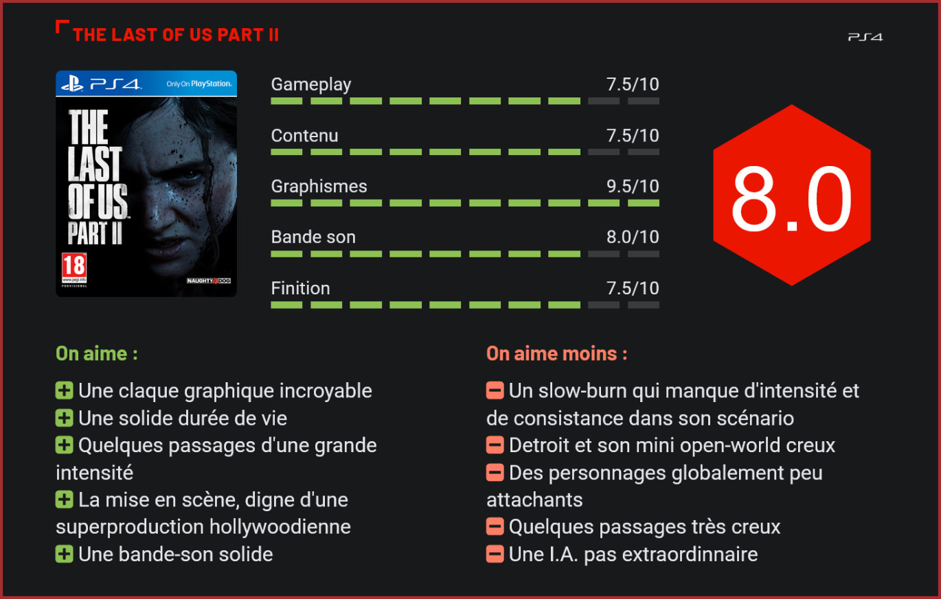 7 ans après The Last of Us, Naughty Dogs nous livre enfin la suite de son jeu de survie post-apocalyptique. Une exclusivité PS4 attendue au tournant par les fans, qui seront très partagés sur le résultat. The Last of Us Part II est typiquement le genre de jeu qui a fait grimper le niveau de “hype” très haut. Tellement haut, qu’il est difficile d’une certaine façon de ne pas être déçu du résultat. Le jeu sera pourtant encensé par la presse spécialisée à sa sortie. Il recevra en revanche un accueil plus mitigé de la part du public, un peu à l’image de Death Stranding. Tout le monde sera toutefois d’accord sur un point : il s’agit de l’un des plus beaux jeux jamais réalisés. Techniquement, The Last of Us Part II est une claque. Le jeu exploite parfaitement les capacités de la PS4 Pro. Naughty Dog prouve une fois de plus son incroyable talent, il est vrai non sans avoir causé polémique puisque le studio a été accusé d’abuser du crunch durant le développement du jeu. Visuellement, The Last of Us Part II place la barre très haut. Naughty Dog réalise presqu’un sans faute sur la réalisation. On y reviendra plus tard. Côté gameplay et univers, le constat est très différent. Tout d’abord parce que même si dans le fond, la recette n’évolue pas, The Last of Us Part II est très différent du premier volet. Le rythme y est plus lent, les développeurs ont fait le choix de poser leur intrigue, quitte à ce qu’on ne comprenne pas trop quel est le fil conducteur durant les premières heures de jeu. Mais surtout, on ne retrouve plus le duo de choc du premier opus. Ellie a grandi et n’est plus du tout l’enfant qu’on connaissait. Elle est une adolescente en colère, une petite bombe à retardement, pas franchement charismatique, un poil agaçante même. Joel, qui était le véritable héros du premier volet, est complètement mis en retrait dans cette suite. On le croisera de nouveau dans The Last of Us Part II, mais très brièvement. A la place, on découvre Dina, une autre adolescente avec qui Ellie s’engage dans une romance. A l’inverse de The Last of Us premier du nom, The Last of Us Part II prend donc une direction très différente sur le plan narratif, avec un ton qui semble souvent s’adresser à une audience plus jeune. Les + de 25 ans auront parfois franchement du mal à s’identifier aux personnages. Difficile aussi de s’y attacher de façon générale, qu’il s’agisse d’Ellie, de Dina ou des autres personnages que l’on croisera. Il y a dans The Last of Us Part 2 un paquet de personnalités totalement antipathiques, agaçantes ou juste inintéressantes. Dina remplace Joel au casting de ce second volet. Paradoxalement, si son casting est plus jeune, le ton est beaucoup plus maîtrisé et le jeu se révèle très sombre et violent. Le sang coule à flots. Au point que dans certaines cut-scenes, il est difficile de garder les yeux rivés sur l’écran. Très clairement, il ne s’agit pas d’un jeu destiné à un jeune public. Et c’est là que le bât blesse, car le casting de The Last of Us Part II ne matche tout simplement pas avec son audience. The Last of Us Part II a également été pensé comme un slow-burn. Les développeurs ont pris leur temps pour introduire le fil conducteur du scénario. Chaque personnage est introduit proprement, les cut-scenes sont nombreuses et Naughty Dog prend soin de développer la psychologie de chacun et de nous révéler progressivement les intentions de chaque protagoniste. Côté mise en scène, il n’y a rien à redire, Naughty Dog s’est inspiré d’Hollywood. Le rendu des cut-scenes et bluffant et on voit que les développeurs connaissent leurs classiques. Les angles de caméra sont travaillés, le travail est véritablement remarquable. L’univers de The Last of Us est toujours aussi captivant avec ses survivants qui s’organisent en factions pour survivre, s’affrontent régulièrement tout en tentant de survivre aux attaques de zombies dans un monde post-apocalyptique qui a renvoyé l’humanité plusieurs siècles en arrière. Naughty Dog fait mouche à ce niveau. Son univers est bien construit et certains panoramas sont absolument superbes. Globalement, The Last of Us Part II manque toutefois cruellement de substance. En partie, à cause de son casting beaucoup trop “teenager” à notre goût, mais aussi de par ses lenteurs. On a très clairement l’impression que le studio a volontairement tiré en longueur son récit, quitte à casser complètement son rythme. Le bestiaire est plutôt varié. On ne va pas vous le cacher, on s’ennuie souvent beaucoup dans The Last of Us Part II. Le jeu de Naughty Dog flirte avec plusieurs genres, lorgnant du côté du survival, tantôt de l’open-world, du jeu d’action pur ou du jeu narratif, sans jamais maîtriser totalement aucun d’eux. La partie open-world du jeu est révélatrice de ce vilain défaut. Après 2 bonnes heures de jeu, le joueur découvrira la ville de Detroit, qu’il pourra explorer au dos de sa fidèle monture. C’est l’occasion pour les développeurs de proposer des zones de jeu plus larges, qui contrastent avec les longs couloirs que l’on avait l’habitude d’emprunter précédemment, car de façon générale, Last of Us reste un jeu très linéaire. Dans Detroit, le joueur peut naviguer selon ses envies, mais la zone principale d’exploration est totalement vide. Il n’y a rien à y faire et aucun ennemi n’y apparaîtra. Elle sert uniquement à relier différentes zones de jeu, dans lesquelles le joueur retrouvera le cocktail habituel d’infiltration / action & résolution d’énigmes. C’est un petit peu le même défaut qu’avait Gears 5, un autre triple-A qui introduisait lui aussi des zones semi-ouvertes désespérément vides mais visuellement très jolies. Durant ces séquences d’exploration, on s’ennuie ferme, même si les très jolis paysages captent notre attention