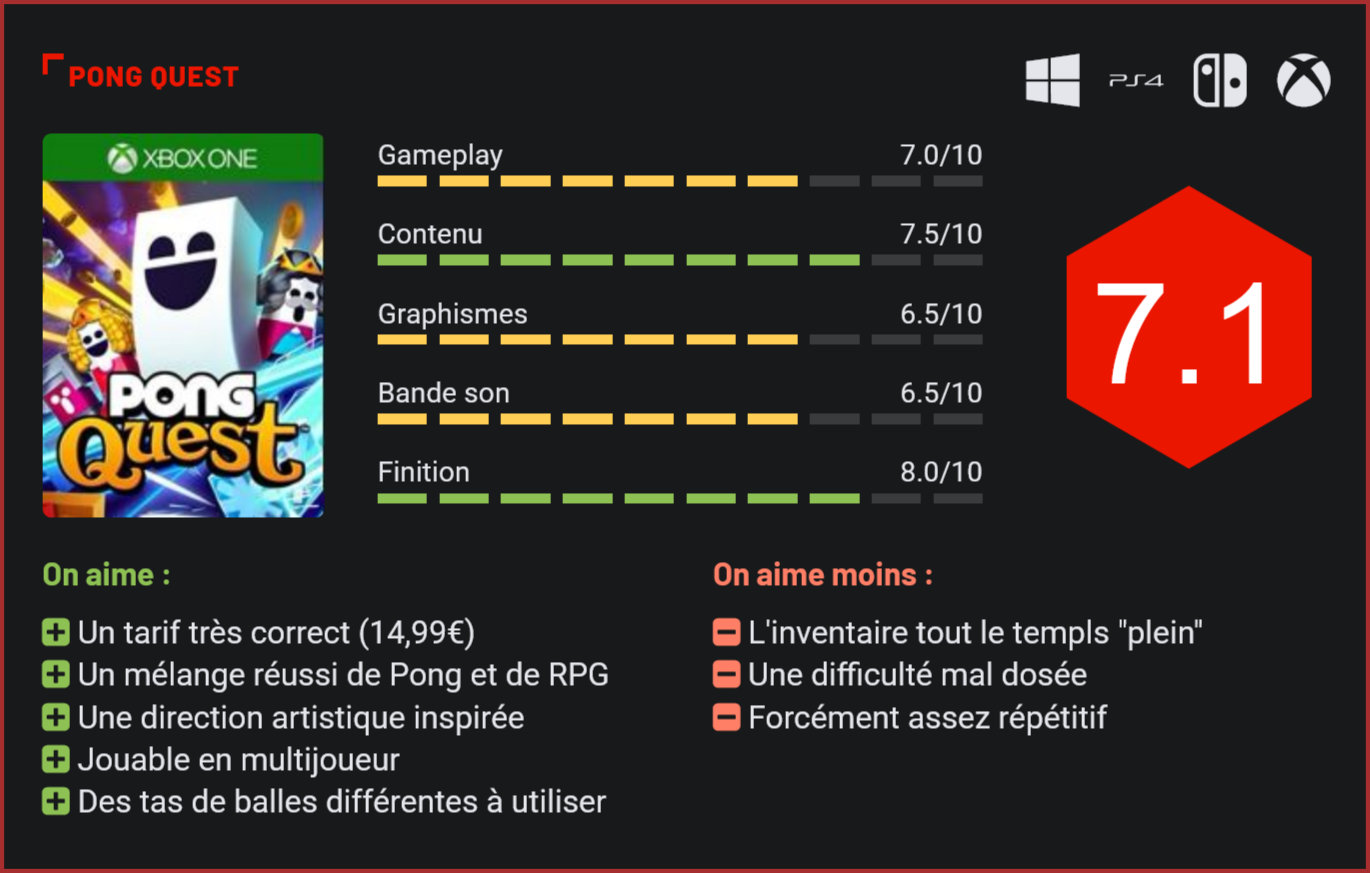 Sorti de nulle part, Pong Quest tente de remettre au goût du jour l’une des plus prestigieuses franchises de l’ex-géant du jeu vidéo Atari. Développé par un tout petit studio indépendant, Pong Quest s’inspire du grand classique d’Atari pour nous proposer une expérience de jeu radicalement différente, sur fond de RPG. Car si le concept de Pong reste le même, il est mis en scène ici à travers une aventure épique s’inspirant très ouvertement des classiques du jeu de rôle, avec bien sûr une bonne d’auto-dérision. Les parties de Pong sont jouables seul ou à plusieurs. En toute honnêteté, on attendait pas grand chose de ce jeu, aussi original puisse-t-il être, annoncé quelques jours seulement avant sa sortie. Le résultat est pourtant très au-delà de nos espérances puisque Pong Quest, malgré son tout petit prix (14,99€), est une vraie bonne surprise et un titre plutôt ambitieux puisqu’il ne se contente pas de nous ressortir un classique modernisé mais de réinventer complètement la licence d’Atari. Comme nous l’avons dit plus haut, dans le fond, Pong Quest reste fidèle à son ancêtre. Dans la forme toutefois, la présentation est très différente puisqu’on ne se retrouve pas ici dans un jeu de duels mais un véritable RPG scénarisé. Bien sûr, on ne se prend pas du tout au sérieux. Le scénario a été pensé de façon à faire preuve d’autodérision. Le jeu hérite également de nombreux mécanismes de RPG puisqu’il faudra y explorer des donjons dans lesquels il faudra réaliser des quêtes, acquérir de l’expérience, augmenter de niveau, améliorer ses compétences, gérer son arsenal et affronter des ennemis dans des duels de Pong. Chaque donjon est composé de plusieurs salles dans lesquelles il faudra affronter des ennemis, résoudre des énigmes et réaliser des quêtes. Les mécanismes du jeu sont rudement efficaces, malgré les apparences. Alors oui, c’est forcément répétitif, mais le studio Chequered Ink est parvenu à rendre le gameplay suffisamment intéressant pour qu’on s’y plonge quelques heures… Car les parties de Pong ne se réduisent pas ici à renvoyer la balle vers son adversaire. A chaque échange, les joueurs perdent des points de vie et peuvent activer différents bonus qui leur permettent de transformer la physique de la balle, d’infliger plus de dégâts à leur adversaire ou de récupérer de la vie. Il faudra donc gérer son arsenal de sorte à être bien équipe au moment du combat… L’objectif est simple : faire baisser la barre de santé de son adversaire jusqu’à zéro. Chaque balle qu’il ne réceptionnera pas lui infligera plus de dégâts, et inversément. Les duels se révèlent étonnamment techniques et la recette fonctionne à merveille. En revanche, on regrette que la difficulté du jeu soit aussi mal dosée puisqu’il ne sera pas rare ici d’être stoppé net par un ennemi atrocement chanceux qui récupère toute sa vie à plusieurs reprises… Si, dans sa construction, Pong Quest reste assez répétitif, le jeu édité par Atari parvient à mixer brillamment les genres et à nous surprendre même occasionnellement avec des petites énigmes à résoudre dans les donjons. Tout l’intérêt du jeu réside bien sûr dans la maîtrise des différents power-ups à activer en cours de partie. Et il y en a un paquet à collecter! Ceci étant dit, l’inventaire est si léger que la frustration de ne pas pouvoir collecter plus de balles se fait très vite ressentir… Il est possible de personnaliser entièrement l’apparence de son personnage. Ajoutez à cela une touche de rogue-lite (une défaite dans un donjon est synonyme de retour au chateau, et d’un départ à zéro dans le donjon en cours), et vous comprendrez que Pong Quest est un jeu étonnamment riche au concept très bien rôdé. Alors oui, c’est forcément un peu répétitif et oui ça reste un “petit jeu”, techniquement assez peu ambitieux, mais Pong Quest n’en est pas moins une jolie réussite dans son concept. D’autant plus que le jeu n’est pas du tout avare en contenu avec son mode solo, son multijoueur à 2 ou 4, en local ou en ligne. Si vous étiez fan de l’original, foncez! Conclusion On ne l’attendait pas franchement au tournant. Pong Quest parvient pourtant à s’imposer comme un très bon revival de la série culte d’Atari. Empruntant aux jeux de rôles et aux rogue-lite, Pong Quest modernise brillamment le concept du célèbre jeu de duels en nous immergeant dans un univers qui ne se prend pas du tout au sérieux. Sans dénaturer le concept d’origine (les duels sont toujours au programme, et même dans le cœur du gameplay), les développeurs sont parvenus à élargir l’univers du jeu en nous proposant d’explorer des donjons qui regorgent de défis, quêtes annexes et ennemis à anéantir. Intelligemment construit avec son système de power-ups et d’expérience, Pong Quest intègre même une composante de rogue-lite puisqu’il faudra recommencer le donjon en cours si vous venez à décéder… Avec son mode multi à 2 et 4 joueurs, jouable en local et en ligne et son mode quête généreux en contenu, Pong Quest incontestablement une très bonne surprise, surtout au prix auquel il est proposé (14,99€). Il faudra en revanche composer avec quelques petits défauts, comme une difficulté mal dosée et un inventaire tout le temps plein, forcément très frustrant à terme.