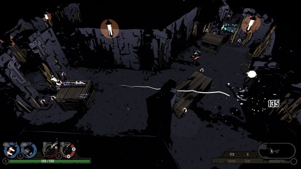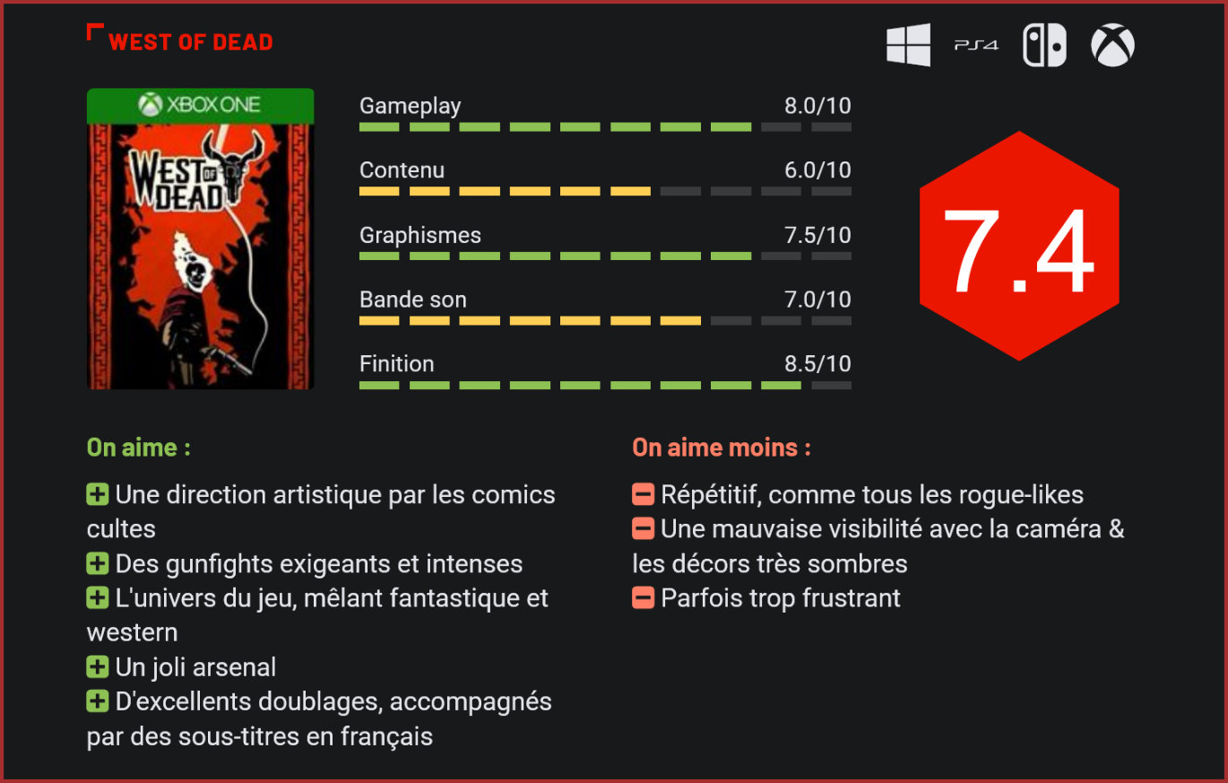 Annoncé il y a quelques mois, West of Dead avait fait forte impression lors de sa présentation officielle. Le jeu de Raw Fury débarquait cette semaine à l’improviste, l’occasion de vérifier si le jeu est à la hauteur de sa réputation… Direction l’Ouest sauvage, ses cowboys, ses légendes et ses morts avec West of Dead, un “twin-stick shooter” à tendance rogue-lite, voire même rogue-like, qui s’adresse clairement à un public hardcore de par sa difficulté. Le scénario du jeu prend place dans le Wyoming, en 1888. Dans la peau de William Mason, un cowboy qui a passé l’arme à gauche, le joueur devra explorer le Purgatoire à la recherche des souvenirs de notre personnage à l’allure du Ghost Rider, campé par l’acteur Ron Perlman. Comme dans tous les rogue-lite qui se respectent, la progression dans le jeu est très punitive. Pour faire simple : vous allez mourir un tas de fois et devrez à chaque fois tout recommencer depuis zéro… N’espérez donc pas reprendre dès le début du second niveau lorsque vous aurez bouclé le premier. Il faudra systématiquement recommencer au début, quitte à ce que cela devienne lassant. La bonne nouvelle, c’est qu’à chaque nouvel essai, on maîtrise un peu mieux le gameplay du jeu et surtout, on récupère de l’expérience qui permet d’obtenir différents bonus qui pourront eux être réutilisés après votre mort… C’est d’ailleurs à cela que West of Dead doit son appellation de Rogue-lite. L’arsenal est plutôt varié. Le joueur a deux armes principales. Elles vont du shotgun au révolver en passant par la carabine. Certaines sont plus puissantes que d’autres et intègrent même des compétences spéciales. Pour autant, ne vous attendez pas à un jeu facile. West of Dead est même à classer dans la catégorie hardcore. A l’heure d’écrire ces lignes, seulement 10% des joueurs sont parvenus à boucler le second niveau. C’est dire. A force d’essayer et de réessayer, rassurez-vous, vous y parviendrez. Une grosse partie du succès repose sur la maîtrise du personnage et de ses compétences. En progressant dans les niveaux, on apprend à maîtriser la prise en main très particulière du jeu. West of Dead s’inspire des Twin Stick Shooters puisque le joueur dirige ici la direction du tir avec le stick droit, et le personnage avec le stick gauche. La gâchette gauche sert à activer l’arme que le personnage tient dans sa main gauche, et la gâchette droite celle qu’il tient dans la main droite… Et puis bien sûr, il y aura quelques objets à utiliser occasionnellement, à l’image de cocktails molotov, bombes ou fioles de soin. Pour progresser dans le niveau, le joueur devra prendre soin à utiliser efficacement les nombreuses couvertures à sa disposition, se planquant derrière toutes les caisses qu’il voit. La vraie difficulté vient de de la mauvaise lisibilité à l’écran, liée à la fois à la caméra, qui vous surprendra plus d’une fois avec des angles douteux, et à la luminosité très faible. Chaque pièce est en effet très sombre et il ne sera pas rare de ne pas repérer certains ennemis dans l’obscurité. On vous conseillera d’ailleurs d’entrée de jeu d’augmenter au maximum la luminosité. C’est dommage, car forcément, l’immersion en prend un coup, mais cela a le mérite de contourner un peu ce vilain défaut du jeu… Agile, le personnage est capable de se mouvoir de façon très naturelle dans les décors. Les gunfights du jeu sont d’une rare intensité. Car il faudra parvenir à utiliser efficacement son arsenal, en utilisant la carabine pour éliminer les ennemis qui vous canardent à distance et le shotgun ou le révolver pour éliminer les monstres qui vous foncent dessus. Le personnage que l’on incarne est capable de se mouvoir très rapidement, de se planquer derrière des caisses, de sauter au-dessus des obstacles et de prendre ainsi part à un véritable balais morbide. Vous l’aurez certainement remarqué sur les quelques visuels qui accompagnent cet article, West of Dead s’inspire très ouvertement des comic-books pour son univers et sa réalisation. On y affronte des monstruosités inspirés du folklore nord-américain, des gangsters armés mais aussi des créatures légendaires comme le Wendigo. Plusieurs boss viendront d’ailleurs vous mener la vie dure durant votre progression… Retour à la case départ à chaque mort… Si le gameplay fonctionne plutôt bien et le jeu devient même franchement addictif une fois qu’on maîtrise sa prise en main assez particulière, difficile de ne pas ressortir très frustré de cette expérience, fondée sur le die & retry. C’est fun, nerveux, intense, les affrontements ont de la gueule, l’univers est séduisant, la voix de Ron Perlman donne vraiment envie d’en apprendre plus sur le passé du personnage et la direction artistique est superbe, mais pour beaucoup de joueurs l’aspect rogue-lite sera franchement rebutant. On aurait aimé pour eux avoir droit à un mode de difficulté un peu plus permissif… Dans le même esprit, on regrette la disponibilité dès la sortie d’un DLC payant… Certes pas bien cher, mais tout de même. On notera au passage que pour ceux qui ont du skill, l’aventure ne sera en soi pas bien longue… A 19,99€, on aurait clairement aimé avoir droit à un contenu un peu plus généreux. Côté réalisation en revanche, West of Dead réalise presqu’un sans faute avec son univers cartoonesque absolument superbe, ses jolis effets visuels et sa direction artistique inspirée. La bande son n’est pas en reste avec la voix de Ron Perlman, d’excellents bruitages mais malheureusement peu de musiques d’ambiance… Conclusion Avec ses mécanismes de rogue-lite et sa prise en main qui se rapproche de celle d’un twin-stick shooter, West of Dead n’est clairement pas un jeu à mettre entre toutes les mains. Le titre de Raw Fury n’est pas facile à dompte