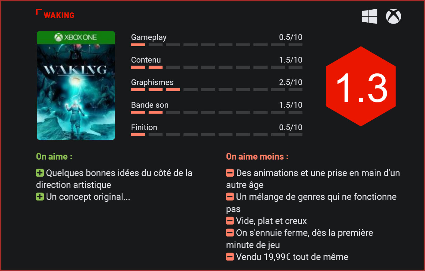 Présenté il y a quelques jours dans le cadre du Summer of Gaming, Waking était l’une des sorties-surprises du mois, que l’on aurait préféré ne jamais découvrir! Il y a des jeux qu’on aurait préféré ne jamais toucher et Waking fait très certainement partie de cette catégorie. Edité par tinybuild, ce mélange improbable de walking simulator, jeu de plates-formes et Souls-like est très probablement l’un des plus mauvais titres sortis cette année sur consoles et PC. Sur le papier, le titre avait pourtant de quoi séduire entre son mélange de genres et son concept totalement atypique, qui nous propose d’incarner un personnage plongé dans le coma, qui va effectuer un véritable voyage initiatique dans son propre esprit pour tenter de se réveiller… Waking emprunte à plusieurs genres et notamment aux Souls-like. Au début de l’aventure, le joueur se verra ainsi encouragé à donner son véritable prénom, pour une expérience de jeu “personnalisée”, puis à répondre à différentes questions sur sa propre existence : quelles sont ses plus grandes peurs ou quels ont été les objectifs de son existence… Dans la pratique toutefois, vos réponses n’auront aucun impact sur le déroulement de la partie puisqu’elles serviront uniquement à nommer des PNJ ou attaques. Côté scénario, Waking adopte un ton très mystérieux. On incarne une personne dans le coma, et on ignore tout de son passé. Vous espérez en apprendre plus dans l’aventure? Pas de chance, le jeu restera mystérieux jusqu’au bout. Waking aurait pu se rattraper au niveau de la prise en main. Ambitieux, le projet entendait mêler plusieurs genres. C’est le cas, mais le cocktail est malheureusement très indigeste. Tout d’abord, parce que Waking souffre d’un sérieux manque de rythme. Il s’agit à la base d’un walking-simulator dans lequel on avance en ligne droite. Quelques petites séquences de plates-formes sont au programme, mais elles sont d’une simplicité déconcertante. Même topo pour ce qui est des affrontements “soulesques”, parfois compliqués il est vrai, mais pas pour les bonnes raisons. Car il ne vous faudra pas forcément du skill pour éliminer un ennemi dans Waking, juste des “neurones”. Chaque action dans le jeu vous coûtera un neurone, une sorte de devise d’actions. Pour en acquérir, il faudra éliminer des ennemis. Paradoxalement, on se retrouve assez souvent à court de neurones dans le jeu, auquel cas il est impossible de battre un ennemi, et donc de récupérer des neurones. Vous l’aurez compris, il faudra relancer la précédente sauvegarde… La plupart des environnements du jeu ressemblent à ça. Vous l’aurez compris, Waking n’est pas un jeu très ludique. A vrai dire, difficile de ne pas sombrer dans un profond ennui dès la première partie. Le jeu est terriblement mou, le scénario totalement inintéressant, les dialogues creux et la plupart du temps, on se contente de suivre un tracé prédéfini. Les quelques séquences de jeu plus musclées sont tout aussi soporifiques. Pire : on se retrouve souvent à flâner sans trop savoir ce que l’on doit faire puisqu’aucun objectif ne nous est donné dans le jeu. Il ne sera pas rare ainsi de devoir chercher avidement un indice sur l’objectif du chapitre, qui pourrait l’activation d’interrupteurs dans le bon ordre… Et étant donné que chaque niveau est généré de façon aléatoire, inutile d’espérer pouvoir suivre un guide pour progresser… Il faudra souffrir pour voir le bout du jeu. S’il apparaît plutôt joli au premier regard, Waking se révèle également très creux dans sa réalisation, avec ses décors vides qui se ressemblent tous. Les modélisations des monstres ne sont pas moches – on trouve un certain talent dans la direction artistique -, mais malheureusement, c’est loin d’être suffisant pour sauver le navire du naufrage. D’autant plus que si le jeu pourrait apparaître comme joli, l’animation casse tout. Waking affiche des animations dignes d’une production d’il y a 10 ans. Côté bande sonore, ce n’est guère plus glorieux avec deux morceaux qui tournent en boucle, des bruitages très cheap et des voix caverneuses. Il faudra bien du courage aux joueurs qui tenteront de boucler l’aventure principale. Une chose est sûre, on tient là l’un des candidats au titre du plus mauvais jeu de l’année. Conclusion Si l’éditeur Tinybuild nous a livré quelques pépites ces dernières années, sa dernière production est à éviter coûte que coûte. Mélange improbable de walking simulator, de jeu de plates-formes et de Souls-like, Waking est un condensé de très mauvaises idées. Le concept du jeu était pourtant très séduisant sur le papier puisqu’on incarne un personnage plongé dans le coma qui tente de se réveiller en explorant son esprit. Pad en main, la formule ne fonctionne tout simplement pas, la faute à un gameplay mou, sans aucune profondeur, un réel manque de rythme et un univers qui ne présente aucun charme. Techniquement, ce n’est pas fameux non plus. Si l’esthétique du jeu est correcte, les animations nous ramènent 10 ans en arrière. Pas de doute, on tient là l’un des candidats au titre du plus mauvais jeu de l’année.