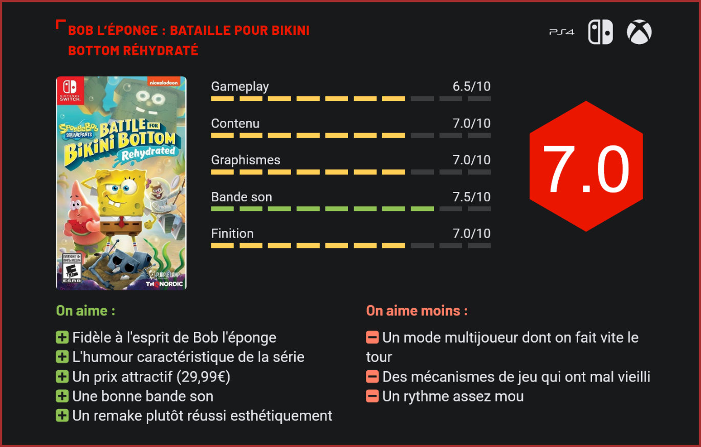 Sorti en 2003 sur PS2 et Xbox, Bob l’éponge : Bataille pour Bikini Bottom avait reçu un joli accueil des critiques. Sombré dans l’oubli, le jeu a aujourd’hui droit à un remake en bonne et due forme sur les consoles de dernière génération. Après Red Faction et Saints Row, THQ Nordic nous livre un autre remaster – ou plutôt remake cette fois au vu du travail réalisé, d’un jeu moins connu, mais qui avait toutefois reçu un joli accueil au moment de sa sortie en 2003… Techniquement, ce remake est très propre. THQ Nordic a réalisé un gros travail au niveau de la réalisation. Cette fois, c’est donc au tour de Bob l’éponge : Bataille pour Bikini Bottom d’avoir droit à son remaster, 17 ans après sa sortie. Alors forcément, la formule a vieilli, mais techniquement, il faut acclamer le travail des développeurs qui ont tout repris à zéro. Il ne s’agit en effet pas d’un bête remaster puisque l’intégralité des visuels ont été retravaillés. Techniquement, ce n’est pas une claque, mais ce remaster donne clairement l’impression d’être sorti sur cette génération de consoles. Pour un titre à 29,99€, c’est plutôt joli et très fidèle à l’univers de Bob l’éponge. Côté contenu, il faudra se satisfaire de quelques toutes petites nouveautés. Quelques cinématiques qui étaient passés à la trappe dans le jeu d’origine font leur apparition et un mode multi en local et en ligne dans lequel on affronte des vagues d’ennemis est proposé. C’est un peu léger, mais cela a le mérite d’être là. Le mode multijoueur est un joli petit ajout… même si on en fait très vite le tour. Côté gameplay, comme nous l’avons dit plus haut, THQ Nordic n’a presque rien retouché. On retrouve le jeu de 2003, sans changements fondamentaux. Si en son temps la formule fonctionnait plutôt bien, cela a forcément beaucoup vieilli aujourd’hui. Bataille pour Bikini Bottom reprenait en effet la formule des platformers 3D old-school à la Mario 64. La mise en scène est minimaliste, le joueur est libre de faire à peu près ce qu’il veut dans chaque niveau, et tout le concept du jeu repose sur la collecte de pièces et de spatules pour déverrouiller de nouvelles salles & environnements et avancer jusqu’au boss final… Bikini Bottom est un jeu très chill, dans lequel la difficulté est plutôt faible. A ce titre, il se destine davantage aux plus petits qu’aux plus grands… qui risquent de vite se lasser de la formule. Reste que niveau prise en main, ce n’est pas forcément toujours évident avec les sauts, double-sauts et multiples mouvements que Bob peut réaliser… Il y a beaucoup de mécanismes de jeu à enregistrer. Ceci étant dit, les consignes sont généralement plutôt bien expliquées à l’écran et le joueur est tenu par la main dans sa progression. Avec ses décors colorés, ses dialogues rigolos, ses multiples personnages à incarner, ses environnements bac-à-sable et ses nombreux objets à collecter, Bikini Bottom est un jeu de plates-formes en soi plutôt fun et qui fera mouche auprès des plus jeunes. Côté narration, ce n’est pas forcément génial, mais l’esprit Bob l’éponge est là et surtout on retrouve les doublages originaux & français officiels de la série, un très gros plus pour l’immersion. La bande son est à ce titre une jolie réussite. La dizaine d’envirronnements du jeu sont plutôt variés. Pour 29,99€, Bob l’éponge : Bataille pour Bikini Bottom est donc plutôt une bonne affaire pour les fans, et une jolie découverte pour les plus petits, qui auront largement de quoi s’occuper dans l’univers de Bob l’éponge avec la dizaine de niveaux à traverser pour arriver au boss de fin. Simple et accessible, Bikini Bottom est un jeu sans prise de tête, idéal pour passer un été tranquille à la maison. Conclusion Remake du sympathique Bob l’éponge : Bataille pour Bikini Bottom sorti il y a 17 ans sur Xbox et PS2, Bob l’éponge Rehydrated est plutôt une bonne surprise pour les fans du dessin-animé. Fidèle à l’esprit du cartoon, le jeu offre une expérience très chill, avec ses environnements bac-à-sable qui se prêtent bien à la découverte et à l’exploration. La recette s’inspire directement de l’excellent Super Mario 64. Les mécanismes de jeu ont vieilli, mais la formule fonctionne toujours, en particulier pour les plus petits, qui découvriront un jeu très fun pour découvrir le genre. Coloré, rafraichissant, plutôt joli et offrant même quelques petites nouveautés totalement inédites (cinématiques & mode multijoueur), Bob l’éponge : Bataille pour Bikini Bottom Réhydraté est un jeu idéal pour passer une après-midi sans prise de tête. Ce n’est clairement pas le jeu de l’année, mais à 29,99€, le jeu de THQ Nordic ne devrait avoir aucun mal à séduire les fans de la franchise.