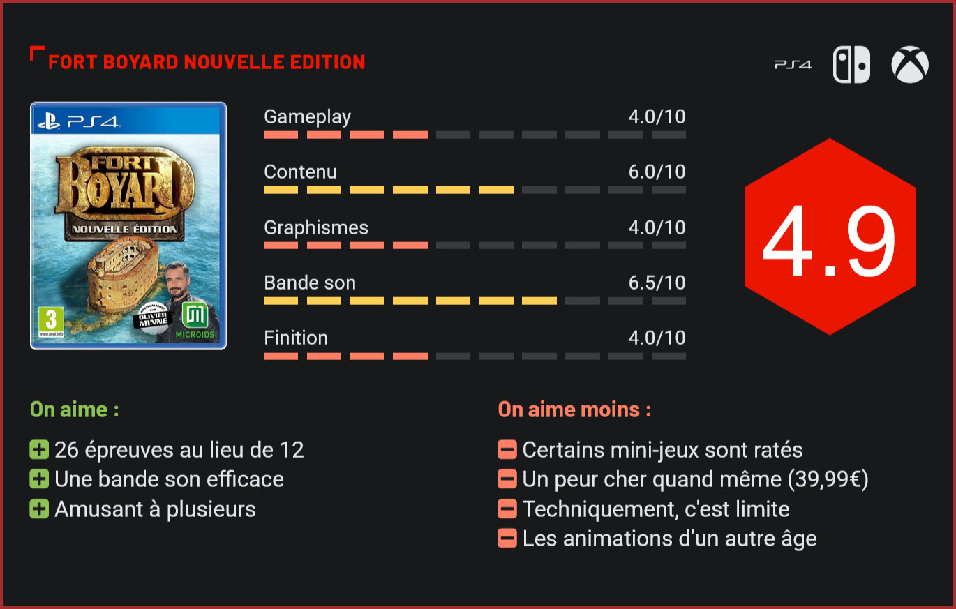 Un an seulement après nous avoir livré le premier volet, Microids revient déjà à la charge avec une réédition de son party-game basé sur le célèbre jeu télévisé Fort Boyard. Toujours développé par le studio belge Appeal, auteur notamment du sympathique Outcast, Fort Boyard Nouvelle Edition n’est pas vraiment une suite du premier volet mais davantage une réédition du jeu qui comprend pas mal de nouveau contenu. Les développeurs corrigent ainsi plusieurs défauts majeurs du titre, fortement critiqué à l’époque pour son manque de contenu et sa réalisation désastreuse… Appeal a corrigé le principal défaut du jeu, qui compte désormais 26 mini-jeux au lieu de 12. Avec seulement 12 mini-jeux, la première édition du jeu n’offrait pas vraiment un contenu à la hauteur de l’attente des joueurs, qui pouvaient en faire le tour en 30 minutes top chrono. Microids misait bien sûr sur la rejouabilité de son jeu pour convaincre les joueurs, mais à 39,99€, l’addition était tout de même très salée pour un jeu qui en plus d’être très court était loin d’exploiter aussi le potentiel des consoles du moment… On ne va pas vous le mentir, cette suite n’améliore pas vraiment l’esthétique du jeu. Il s’agit même d’une copie conforme de l’original. Visuellement, le jeu est très loin d’exploiter le potentiel des consoles actuelles, en ce compris de la Switch. Pas de synchronisation labiale lors des dialogues, des animations d’un autre âge, des modélisations parfois douteuses… Le style cartoon joue toutefois le cache-misère avec brio puisqu’il parvient assez régulièrement à nous faire oublier le tout petit budget de ce projet… Côté contenu en revanche, les développeurs ont bien revu leur copie. Car désormais, le jeu compte plus de deux fois plus de mini-jeux que dans l’original! Tous ne se valent bien sûr pas, mais ce nouveau contenu a le mérite de rendre beaucoup plus intéressant le concept puisqu’il sera possible de faire plusieurs parties d’affilée sans rejouer aux mêmes mini-jeux… Techniquement, ce n’est pas fameux, mais le style cartoon fonctionne plutôt bien. Dans le menu principal, le joueur pourra opter pour différents types de parties, seul ou à plusieurs, avec un paramétrage du temps de jeu qui permettra de définir le nombre d’épreuves à jouer. Certaines sont d’ailleurs franchement amusantes : on pense à l’épreuve de catapulte, qui nous demande de contrôler la chute d’un concurrent, catapulté depuis le fort, en passant dans des anneaux colorés. On pense aussi à quelques épreuves d’adresse, qui forceront à éviter des pièges en progressant à tâtons dans le niveau… Globalement, la prise en main reste très simple. L’objectif était très clairement de proposer un jeu accessible à tous, en ce compris aux plus petits. Et de ce point de vue là, le pari est plutôt réussi. Dommage toutefois que toutes les épreuves ne soient pas du même niveau. Certaines sont beaucoup trop facile (notamment, les devinettes), d’autres totalement inintéressantes (l’épreuve de combat, par exemple). A plusieurs, le jeu devient franchement amusant puisqu’il ajoute une composante compétitive qui n’existe pas dans le mode solo. N’espérez toutefois pas y jouer durant des joueurs. Malgré le nombre plus élevé d’épreuves, le jeu n’offre pas une énorme replay-value. Après avoir bouclé 4 ou 5 séries, on finit par vite se lasser du concept. A 39,99€, cela fait donc un peu cher l’heure de jeu… D’autant plus qu’il ne faudra pas être trop exigeant, ni au niveau de l’esthétique du jeu, ni du gameplay. La bonne nouvelle, c’est que les développeurs ont profité de cette réédition pour ajouter un vrai doublage au Père Fouras. Alors certes, ce n’est pas ça qui va transcender l’expérience de jeu, mais il faut bien admettre que le studio belge a corrigé quelques défauts de son jeu, qui à défaut d’être une totale réussite aujourd’hui a au moins le mérite d’être décent. Fort Boyard est typiquement le genre de jeu qu’on achètera de préférence en soldes, ou à prix réduit. Sa très grande accessibilité le destine en revanche davantage aux plus jeunes qu’aux adultes. Conclusion Microids nous livre une seconde édition de son party-game basé sur la licence Fort Boyard beaucoup plus aboutie. S’il est presqu’une copie conforme du premier volet sur le plan technique, Fort Boyard Nouvelle Edition double le nombre d’épreuves et corrige certains petits défauts de son ainé. C’est encore loin d’être parfait, mais le jeu d’Appeal a désormais le mérite d’être “décent”. Les épreuves sont amusantes, le jeu est jouable ou jusqu’à quatre, l’esprit de la série est respecté et la patte graphique cartoonesque joue brillamment le cache-misère. Alors oui, Fort Boyard : Nouvelle Edition n’est pas un grand jeu. Mais pour les joueurs moins exigeants, cette version revue et corrigée du jeu d’Appeal parviendra sans difficulté à animer une soirée entre amis. Fort Boyard : Nouvelle Edition est toutefois typiquement le genre de jeu que l’on préférera acheter en soldes, car à 39,99€, l’addition est plutôt salée.